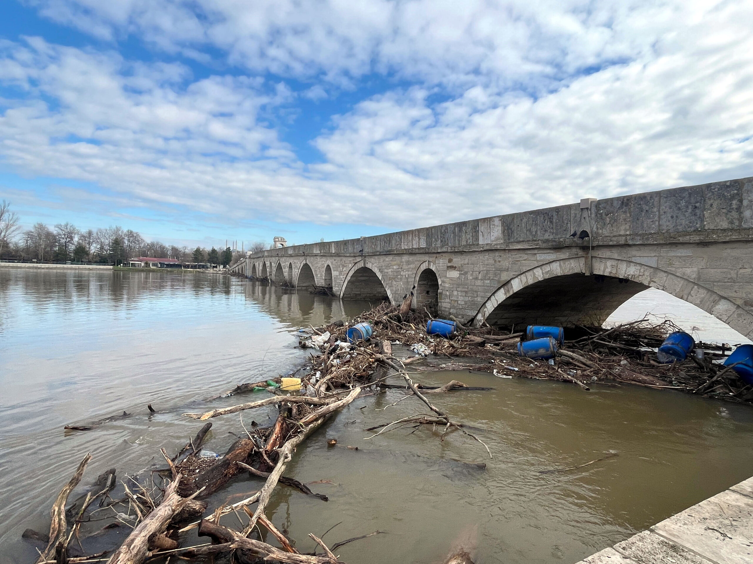 Edirne’de kırmızı alarm verilen Meriç ile turuncu alarm verilen Tunca nehirlerinin debileri düşüşünü sürdürürken, tarihi köprüler de trafiğe açıldı.
