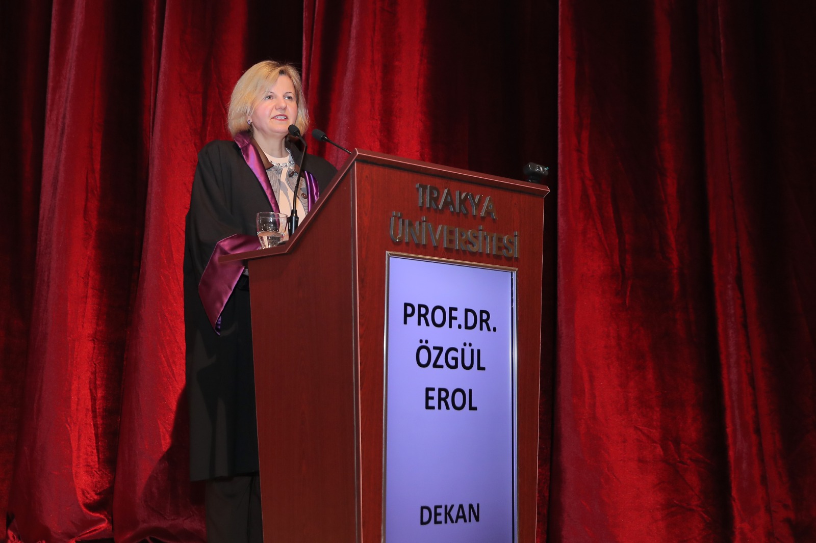 Sağlık Bilimleri Fakültesi Dekanı Prof. Dr. Özgül Erol, konuşmasında beyaz önlük ve formanın dürüstlük, vicdan ve insan sevgisinin simgesi olduğunu vurguladı. Fakültede 139 Hemşirelik, 54 Fizyoterapi ve Rehabilitasyon, 50 Odyoloji, 43 Sağlık Yönetimi, 36 Beslenme ve Diyetetik ile 27 Ergoterapi bölümü öğrencisinin bulunduğunu ifade eden Erol, “Bizler Trakya Üniversitesi Sağlık Bilimleri Fakültesi olarak; mesleklerini geleceğe taşıyacak, etik değerlere bağlı, donanımlı diyetisyenler, ergoterapistler, fizyoterapistler, hemşireler, odyologlar ve sağlık yöneticileri yetiştirmenin sorumluluğunu gururla üstleniyoruz.” dedi.