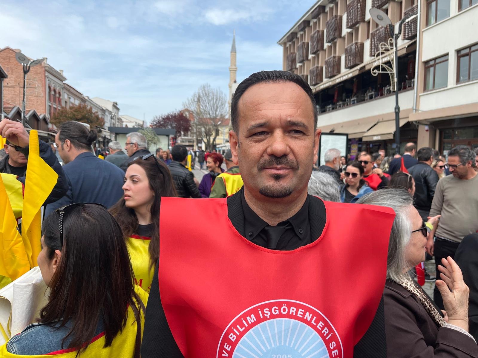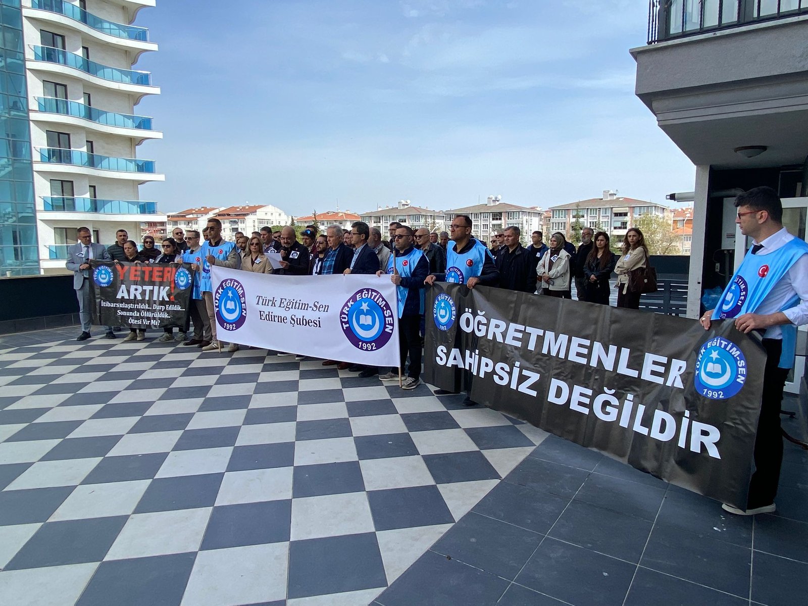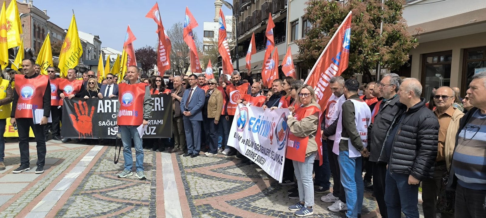 Saraçlar Caddesi’nde gerçekleştirilen basın açıklamasını Eğitim-İş Edirne Şube Başkanı Nedim Zobar ile, Eğitim-Sen Şube Başkanı Ahmet Acet okudu. Şube Başkanı Zobar, okulların sahipsiz bırakıldığını belirterek, “Buradan soruyoruz: En güvenli olması gereken yerler olan okullar nasıl oldu da en güvensiz alanlara dönüştü? Bilimin, aklın, aydınlanmanın mekânı olması gereken okullar, nasıl oldu da çocukların camdan atlayarak canını kurtarmaya çalıştığı yerlere dönüştü? Bu bir çöküştür. Bu, eğitimde güvenlik politikasının iflasıdır. Bu, öğretmeni yalnız bırakan, okulu kaderine terk eden anlayışın eseridir.  10 öğrenci, 4 öğretmen, 1 kantinci ve 1 polis memurunun yaralandığı, çocukların panikle camlardan atladığı bu saldırı artık “münferit” denilerek geçiştirilemez. Okullar eğitim yuvası olmaktan çıkmış, şiddetin kol gezdiği alanlara dönmüştür. Daha kısa süre önce öğretmenimiz Fatma Nur Çelik katledildiğinde söyledik: “Okullarda şiddet artıyor, önlem alınmazsa daha ağır sonuçlar yaşanacak!” Peki ne yaptınız? Hiçbir şey. Ne ciddi bir güvenlik politikası oluşturuldu,  Ne rehberlik ve psikolojik destek güçlendirildi,  Ne de eğitim emekçileri korunabildi! Bugün öğretmenler ders anlatırken can güvenliğini düşünüyor. Bugün öğrenciler okula giderken sağ salim eve dönebilecek mi diye hesap yapıyor” dedi.