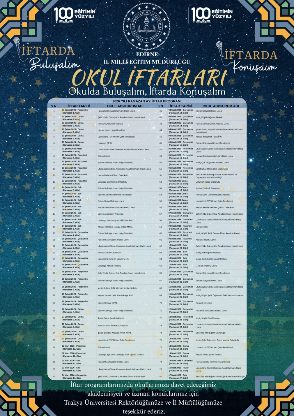 Edirne İl Milli Eğitim Müdürlüğü tarafından yapılan duyuruda, “Okulda Buluşalım, İftarda Konuşalım” Okul İftar Programları düzenleneceği kaydedildi. Duyuruda şunlara yer verildi: