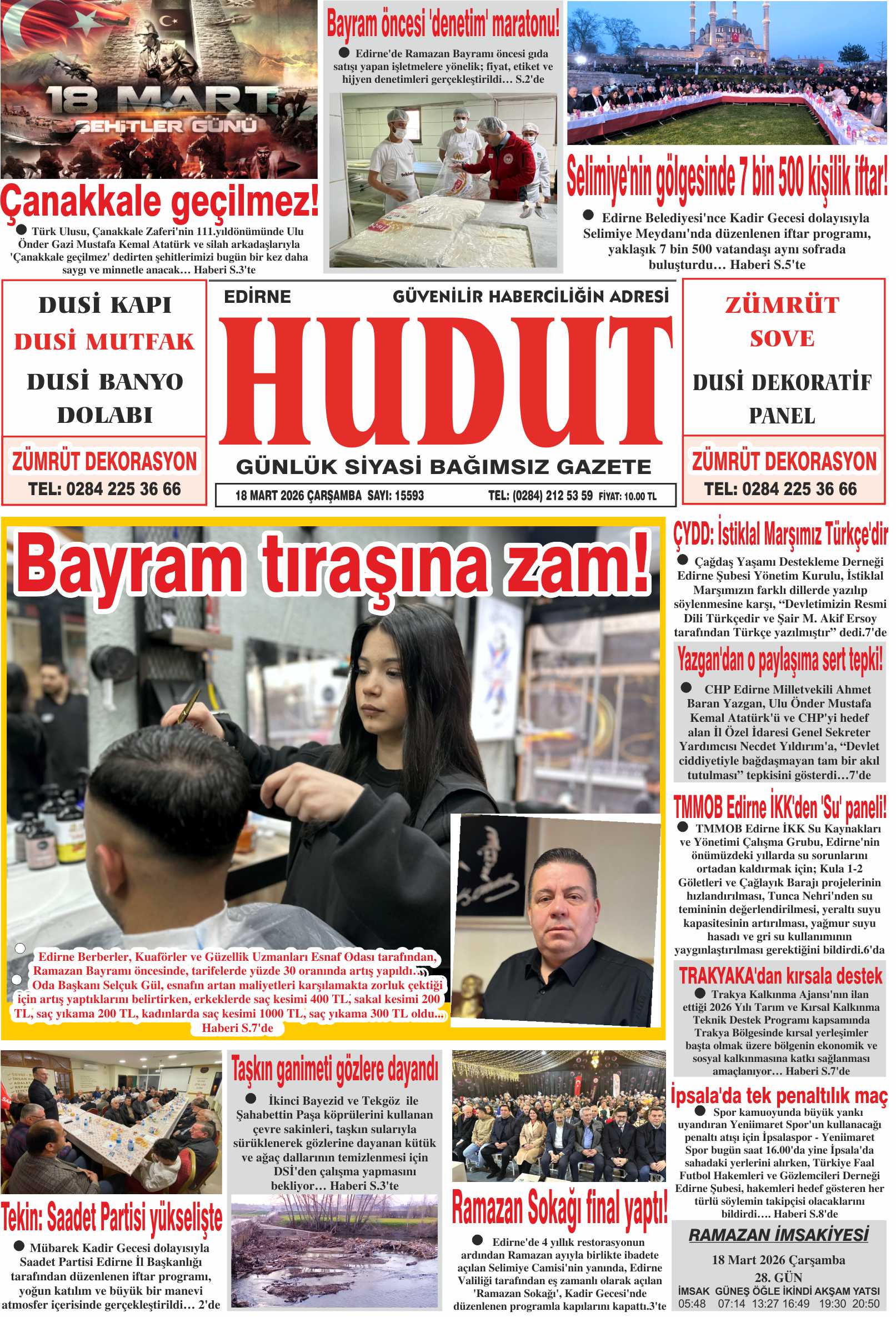 Ülke genelinde kutlanan dini bayramlardan Ramazan öncesi, berberler ve kuaförlerde yoğunluk artmaya başladı. Edirne’de, çoğu esnaf müşterilerini randevu sistemiyle çağırıp yoğunluğu azaltmaya çalışırken, bayrama sayılı günler kala tarifelere zam yapıldı. Edirne Berberler, Kuaförler ve Güzellik Uzmanları Esnaf Odası tarafından tarifelerde yüzde 30 oranında artış gerçekleştirildi. Buna göre erkeklerde saç kesimi 400 TL, sakal kesimi 200 TL, saç yıkama 200 TL, kadınlarda saç kesimi 1000 TL, saç yıkama 300 TL oldu.