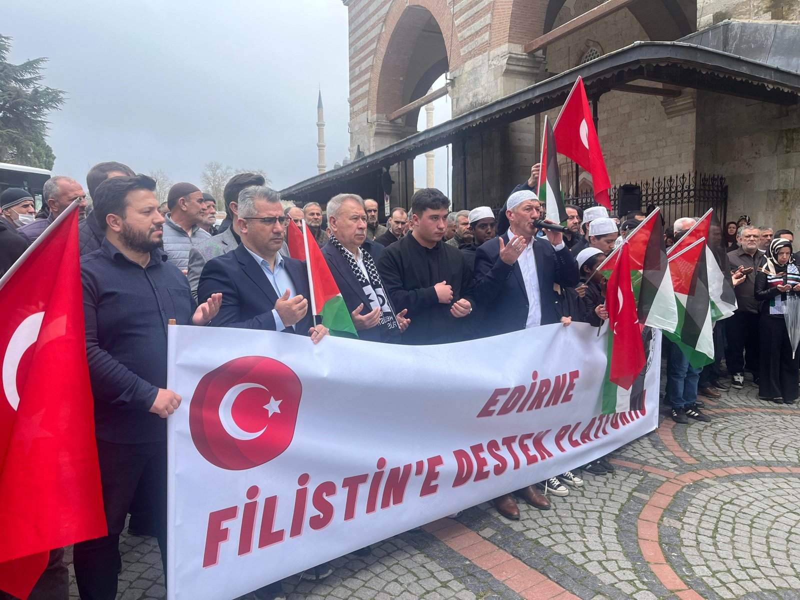 Edirne Filistin’e Destek Platformu tarafından, Eski Cami önünde Cuma namazı çıkışı basın açıklaması gerçekleştirildi. Açıklamaya platform üyeleri ve çok sayıda cemaat destek verdi.