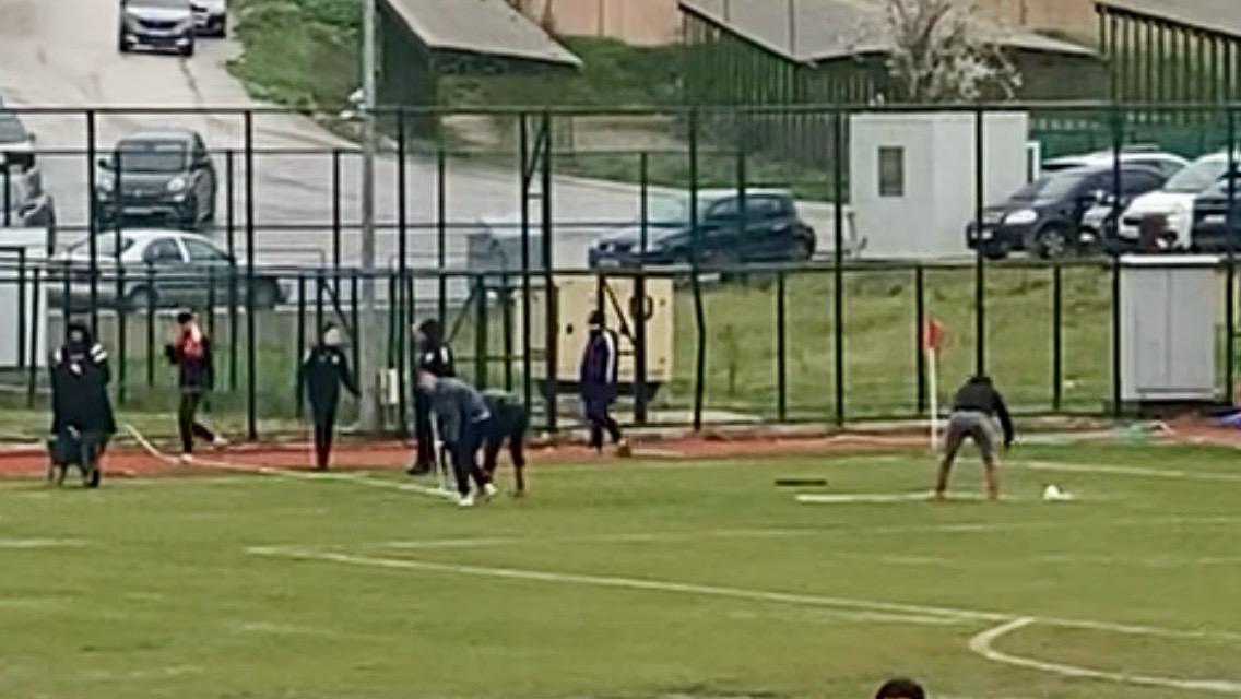 Karşılaşma öncesi görevliler sahadaki suyu temizlemeye çalıştı.