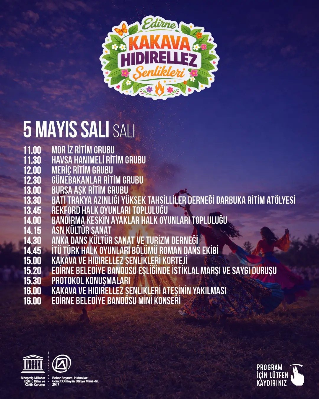 Edirne Belediyesi tarafından düzenlenen Kakava Hıdırellez Şenlikleri için geri sayım başladı. UNESCO’nun Somut Olmayan Kültürel Miras Listesi’nde yer alan ve yüzyıllardır sürdürülen köklü gelenekleriyle baharın gelişini simgeleyecek olan şenlikler, 5-6 Mayıs tarihlerinde Edirne’de büyük bir coşkuyla gerçekleştirilecek. Zengin program içeriği, ritüelleri, konserleri ve sahne gösterileriyle binlerce yerli ve yabancı ziyaretçiyi ağırlayacak organizasyon, kenti bir kez daha kültür ve turizmin önemli buluşma noktalarından biri haline getirecek.
