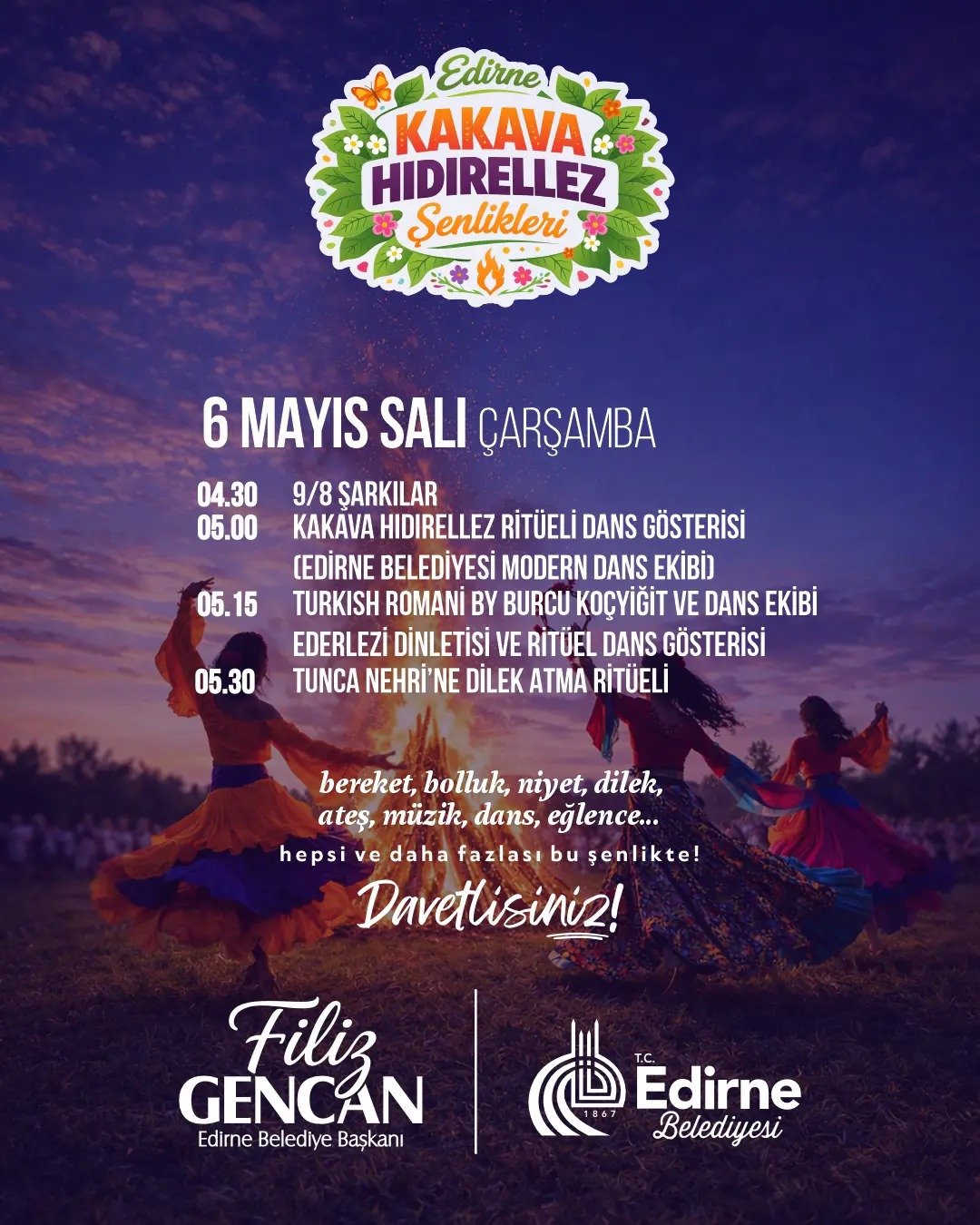 Baharın gelişinin kutlandığı, kültürümüzün en köklü ve en coşkulu geleneklerinden biri olan Kakava ve Hıdırellez Şenlikleri’ne tüm hemşehrilerini ve yurttaşlarını davet eden Edirne Belediye Başkanı Filiz Gencan, “ Edirne’miz, farklı kültürlerin, renklerin ve ritimlerin bir araya geldiği çok özel bir şehir. Bizler, bu kadim geleneği yaşatmaya, gelecek kuşaklara aktarmaya ve tüm dünyaya tanıtmaya hep birlikte devam edeceğiz. Kakava ateşinin etrafında toplanacak, dileklerimizi tutacak, müziğin ve dansın birleştirici gücüyle baharın gelişini kutlayacağız.