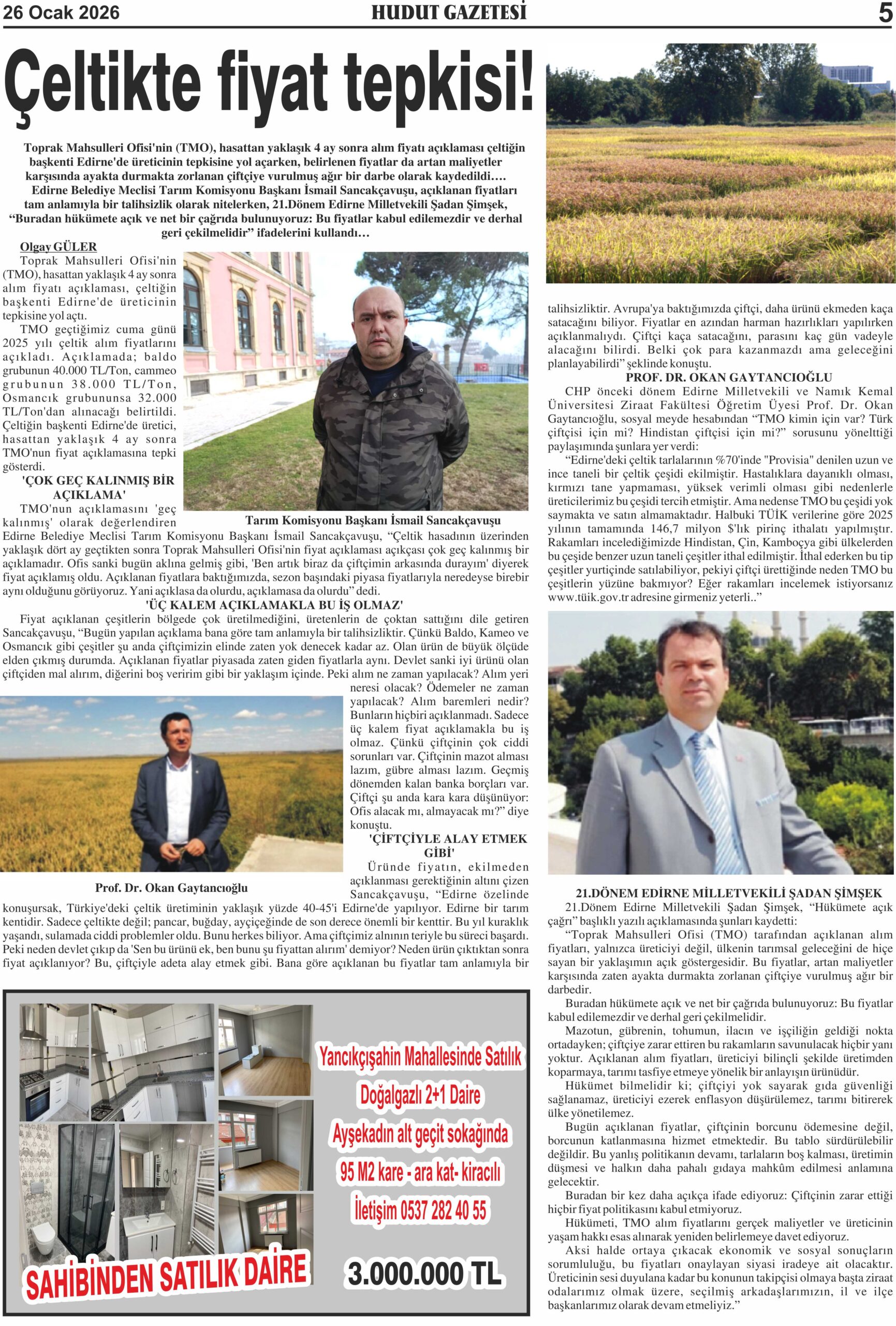 TMO’nun açıklamasını ‘geç kalınmış’ olarak değerlendiren Edirne Belediye Meclisi Tarım Komisyonu Başkanı İsmail Sancakçavuşu, “Çeltik hasadının üzerinden yaklaşık dört ay geçtikten sonra Toprak Mahsulleri Ofisi’nin fiyat açıklaması açıkçası çok geç kalınmış bir açıklamadır. Ofis sanki bugün aklına gelmiş gibi, ‘Ben artık biraz da çiftçimin arkasında durayım’ diyerek fiyat açıklamış oldu. Açıklanan fiyatlara baktığımızda, sezon başındaki piyasa fiyatlarıyla neredeyse birebir aynı olduğunu görüyoruz. Yani açıklasa da olurdu, açıklamasa da olurdu” dedi.