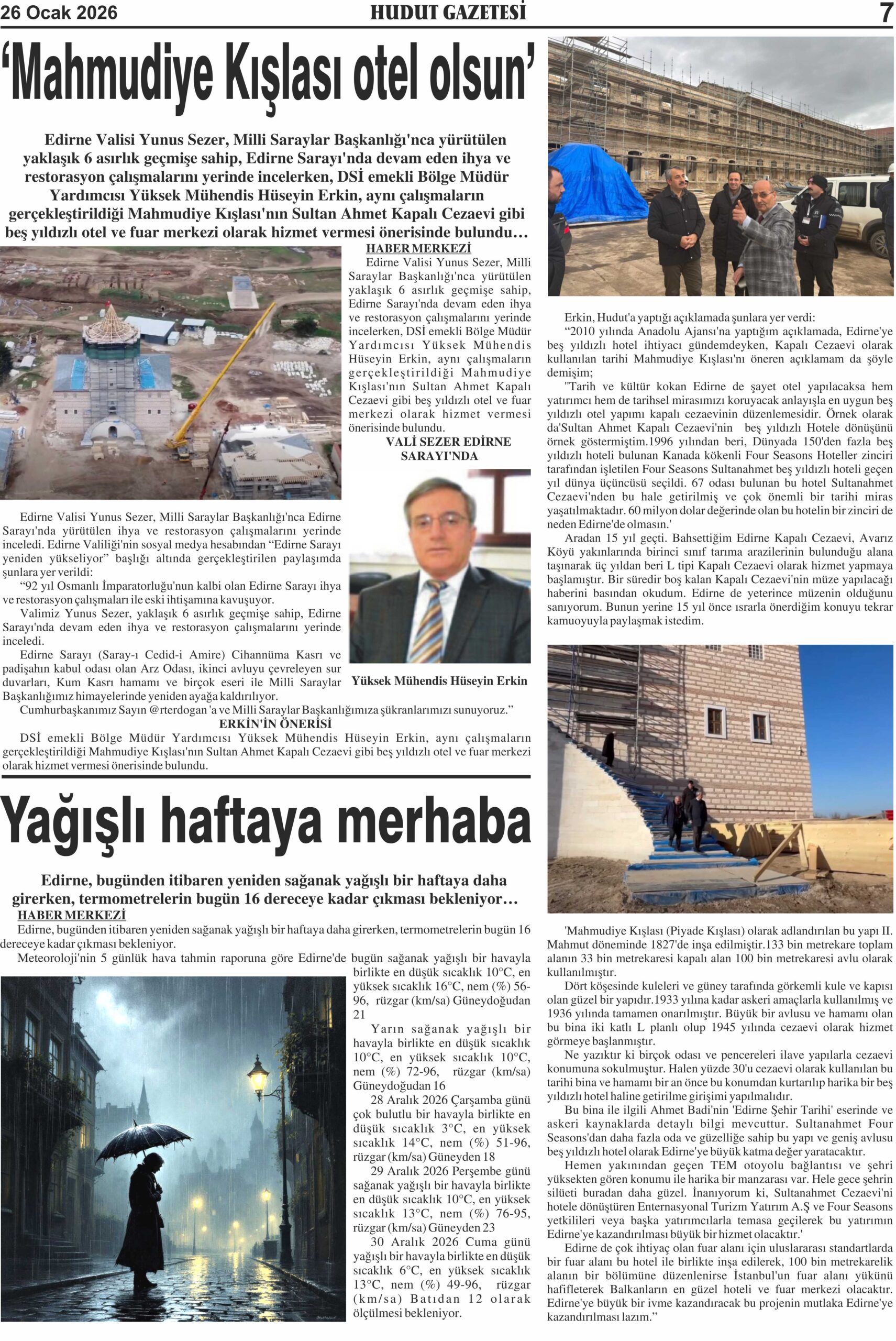 Edirne Valisi Yunus Sezer, Milli Saraylar Başkanlığı’nca yürütülen yaklaşık 6 asırlık geçmişe sahip, Edirne Sarayı’nda devam eden ihya ve restorasyon çalışmalarını yerinde incelerken, DSİ emekli Bölge Müdür Yardımcısı Yüksek Mühendis Hüseyin Erkin, aynı çalışmaların gerçekleştirildiği Mahmudiye Kışlası’nın Sultan Ahmet Kapalı Cezaevi gibi beş yıldızlı otel ve fuar merkezi olarak hizmet vermesi önerisinde bulundu.