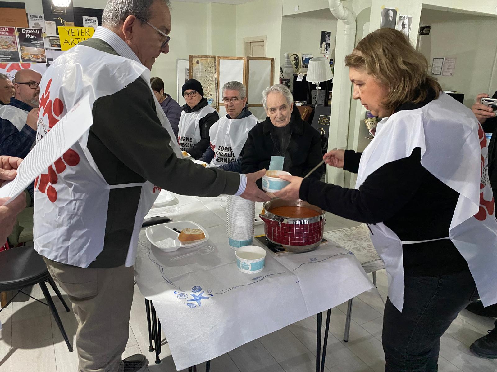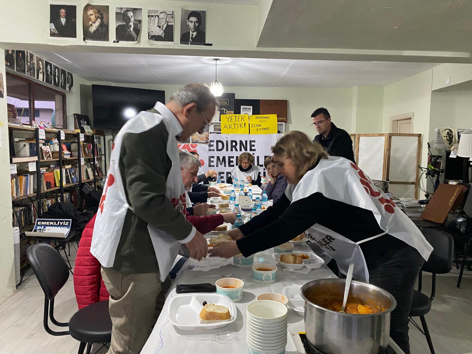 Edirne Emekliler Derneği, emeklilerin ekonomik zorluklarına dikkat çekme amacıyla iftar programı düzenledi. Kentteki bir kafede gerçekleştirilen programda, mütevazı iftar menüsü dikkat çekti. Ülke genelinde bir yandan TBMM’deki zengin menü dikkat çekerken, emeklilerin sofrasındaysa tarhana çorbası, patates yemeği, 3 zeytin ve su yer aldı.
