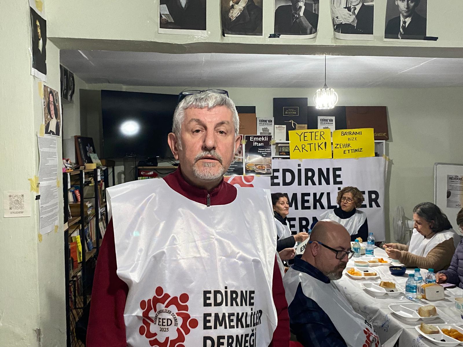 İftar programında konuşan Edirne Emekliler Derneği Başkanı Ahmet Ziya Yaz, emekli maaşlarının Ocak ayından bu yana 4 bin liraya yakın eridiğini belirterek, “Gösterişli zengin sofralarla boy boy gösteri yapan iktidar ve yerel yöneticileri, emeklilerin iftar sofrasını görmüyor veya görmek istemiyor. Enflasyonun yükselmesine engel olamayanlar, savaşı bahane ederek refah müjdeleri veriyor ve bizlerin buna inanmasını bekliyorlar. Bayram ikramiyelerinin erken ödenmesini bir lütuf gibi sunarak emeklinin aklıyla dalga geçiyorlar. Gerçek müjde için somut bir iyileştirme, prim gün sayısına göre adaletin sağlanması ve insanca yaşanabilecek bir taban ücret belirlenmesi gerekir” dedi.