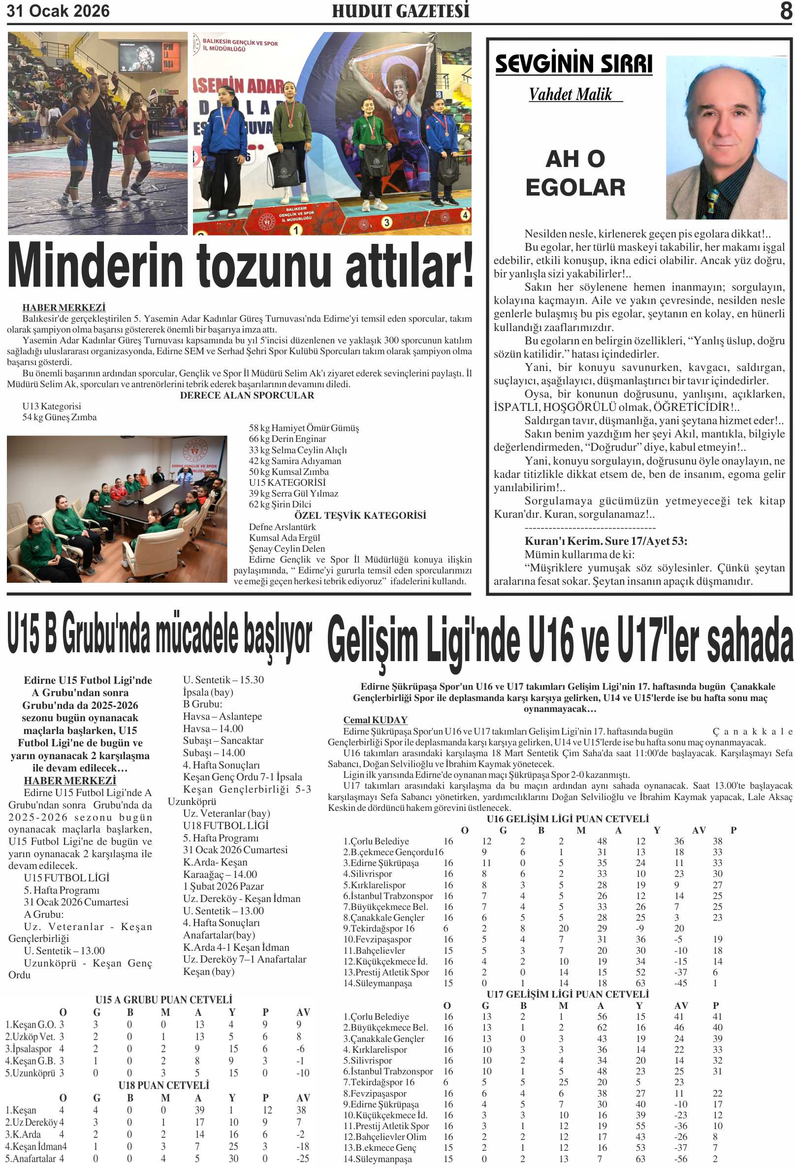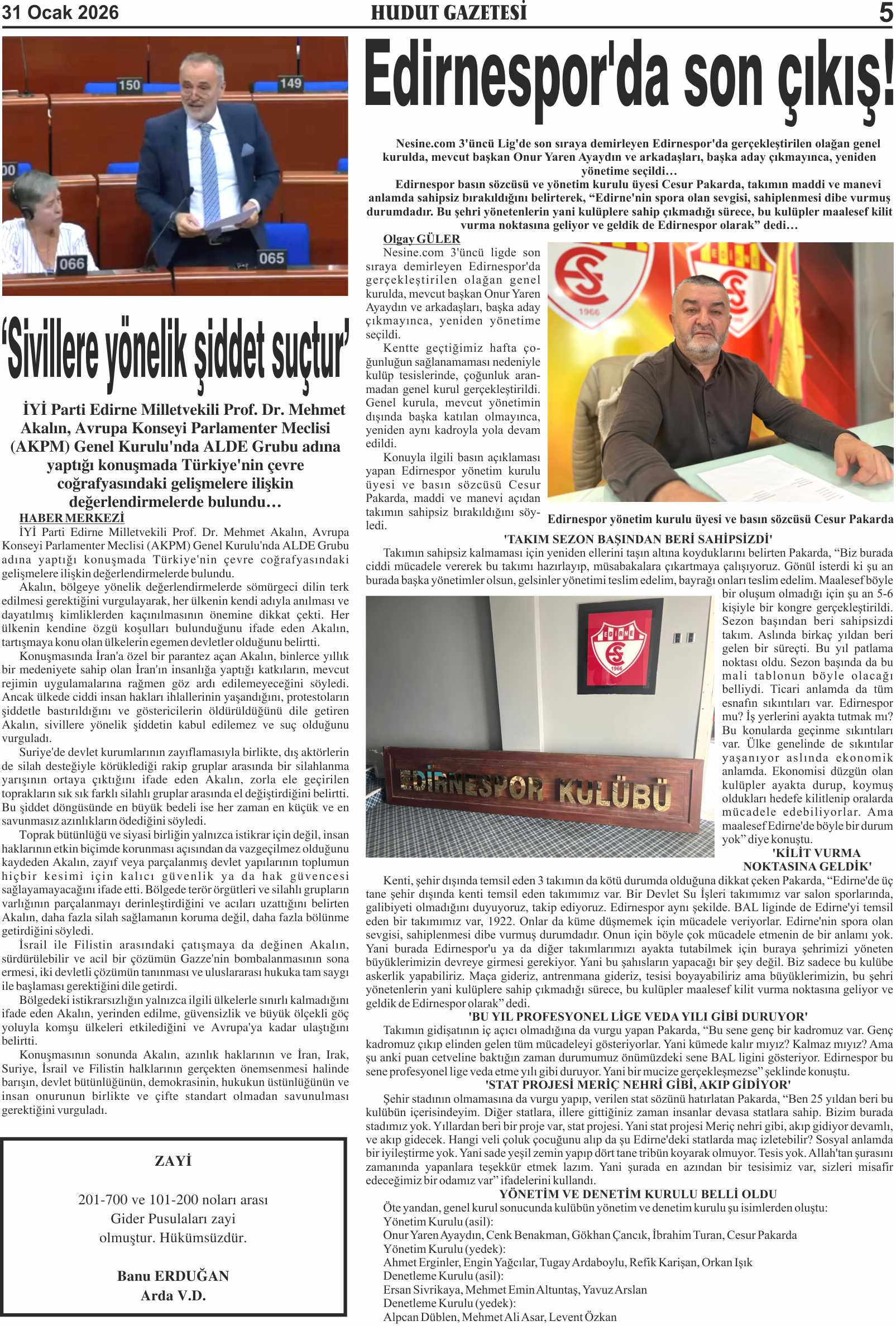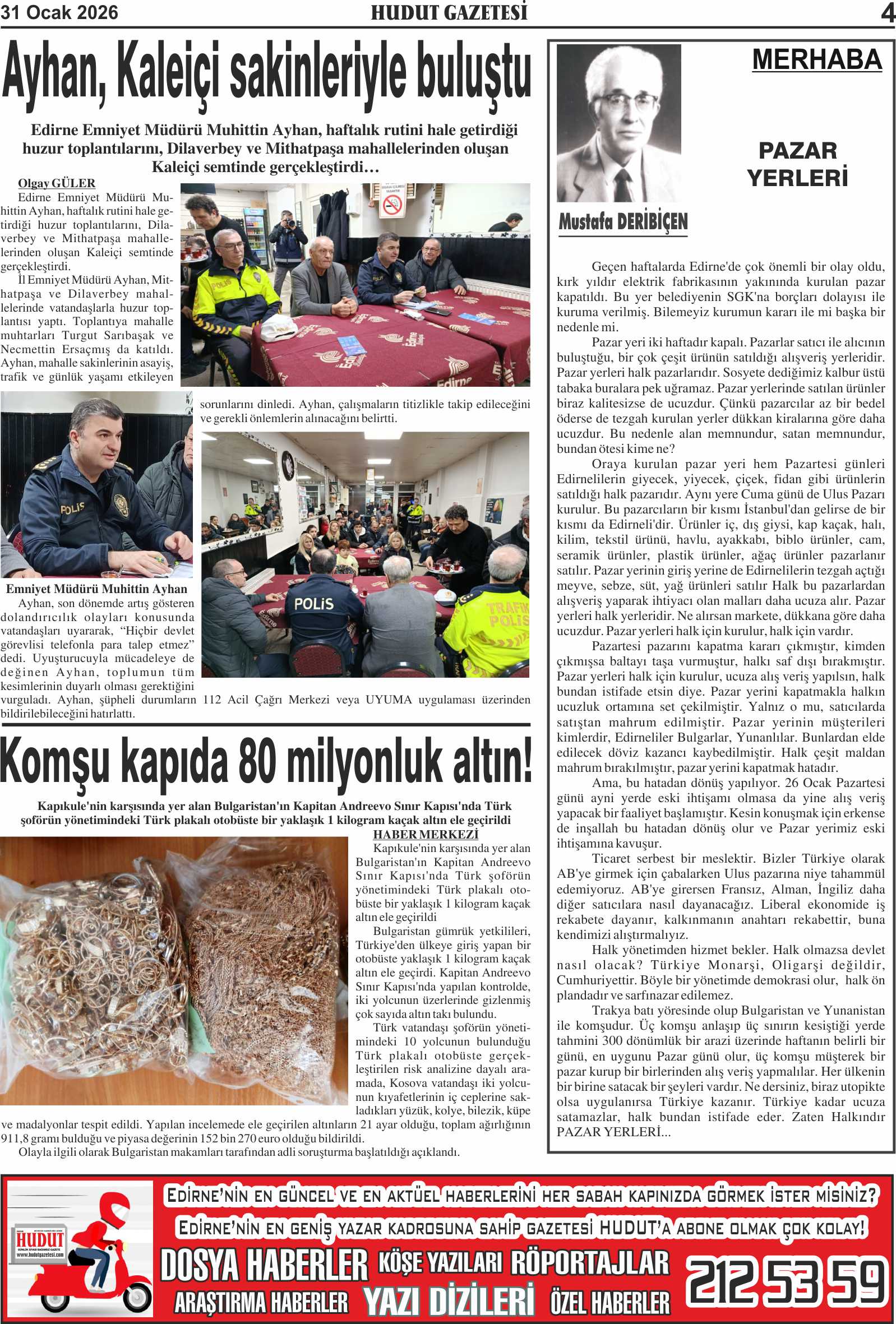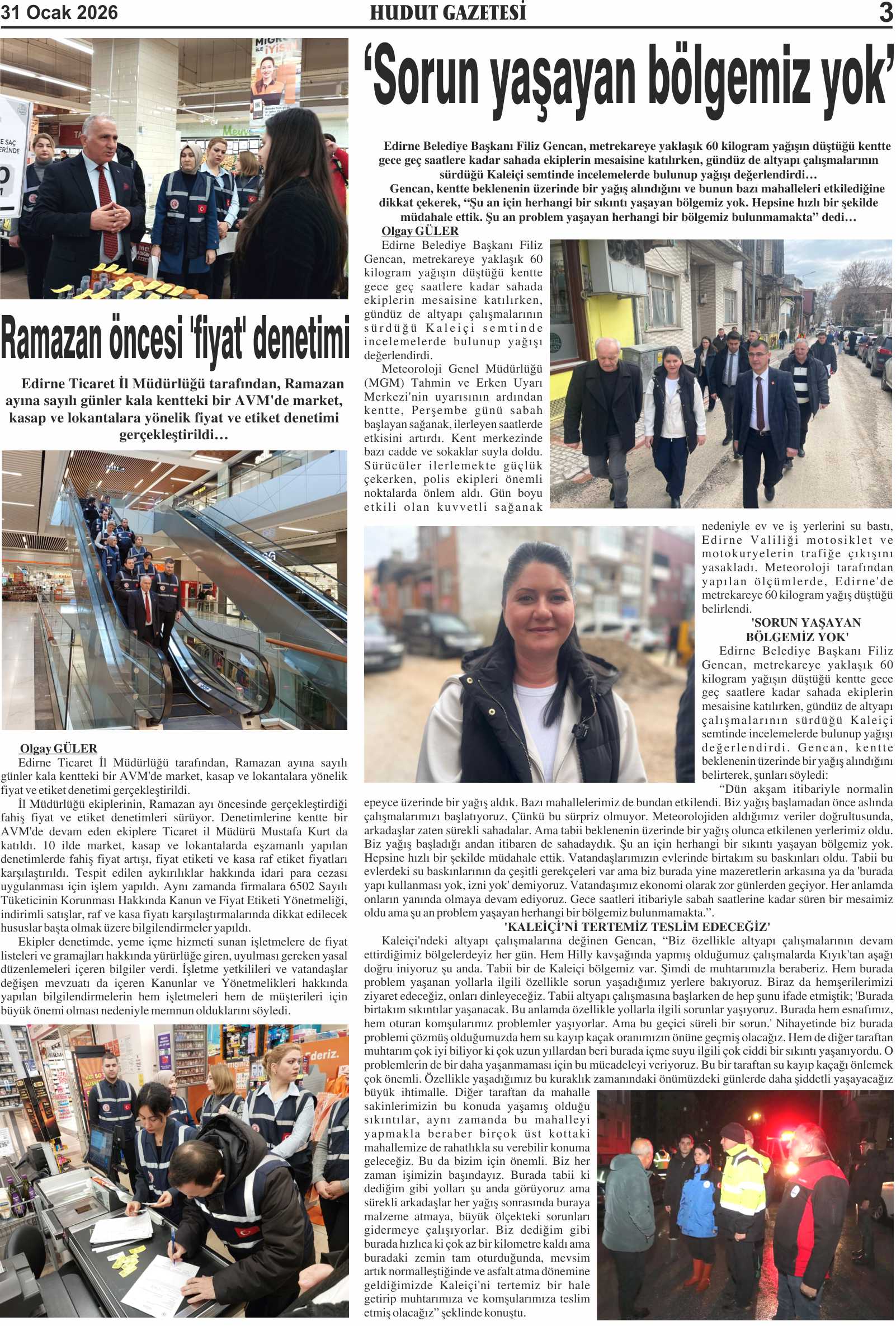 31 Ocak 2026 Cumartesi Hudut Gazetesi