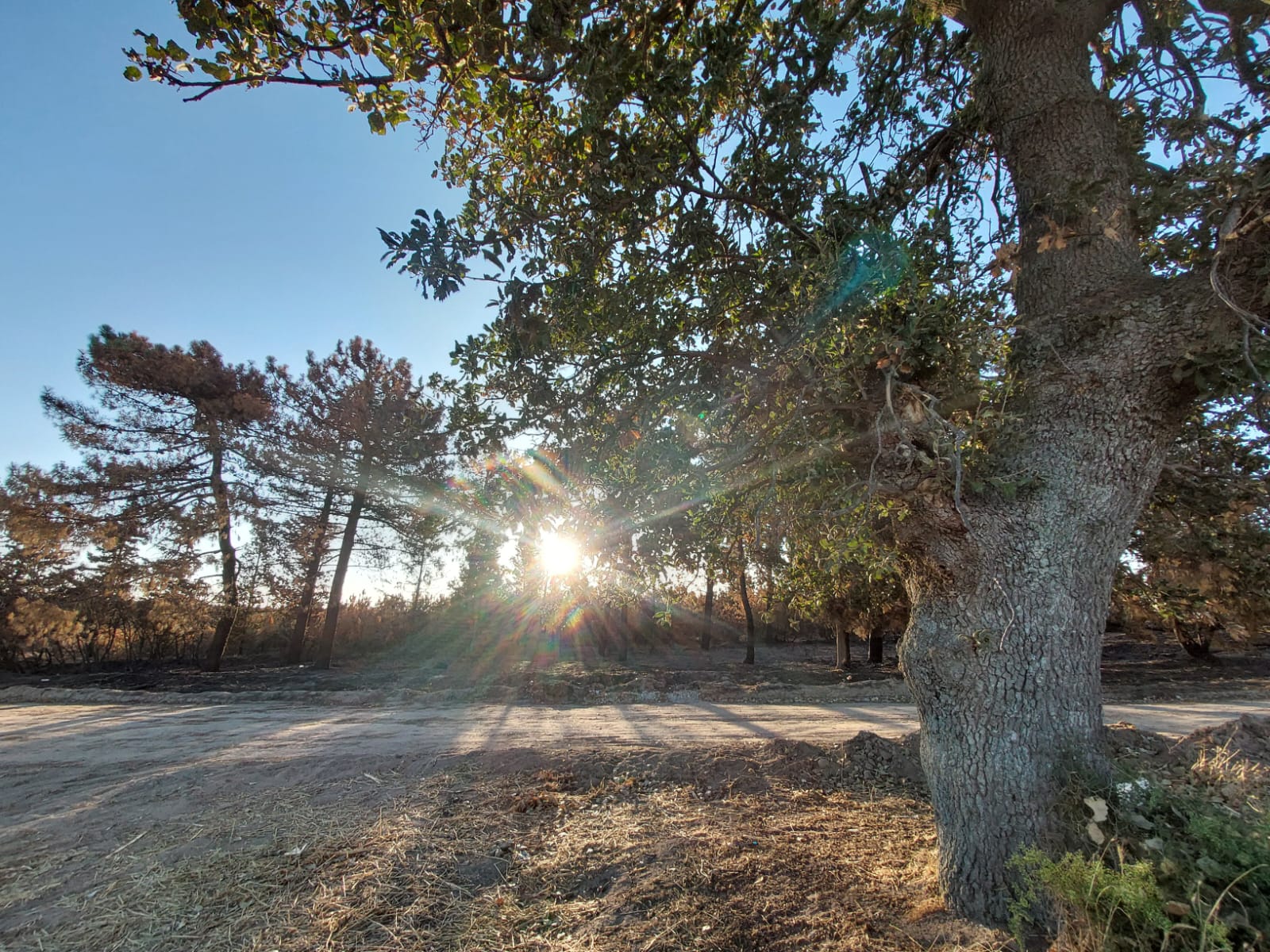 Yangın bölgesinde halen ayakta kalmış genç meşe ve çam ağaçlarını gözlemlemek mutlu etti beni. Yangının silip süpürürken kenar köşede kalmış tek tük ağaçlar olduğu gibi yine bazı yerleri teğet geçen yangın sonunda bölgesel olarak mini de olsa ormancıklar mevcut bölgede.