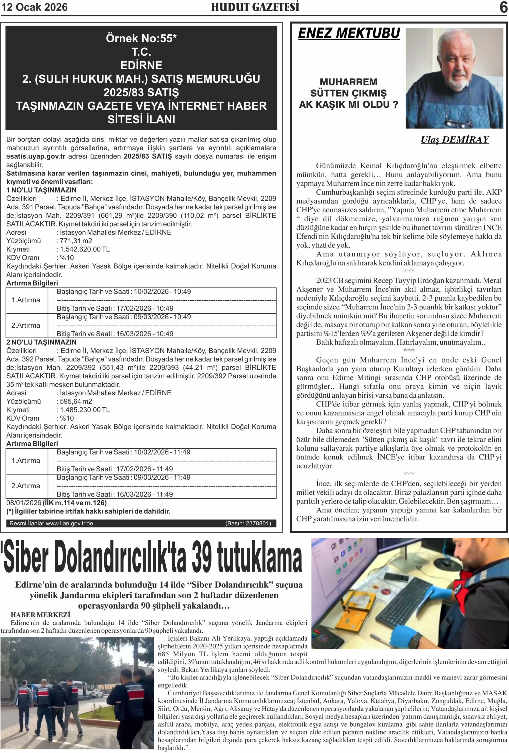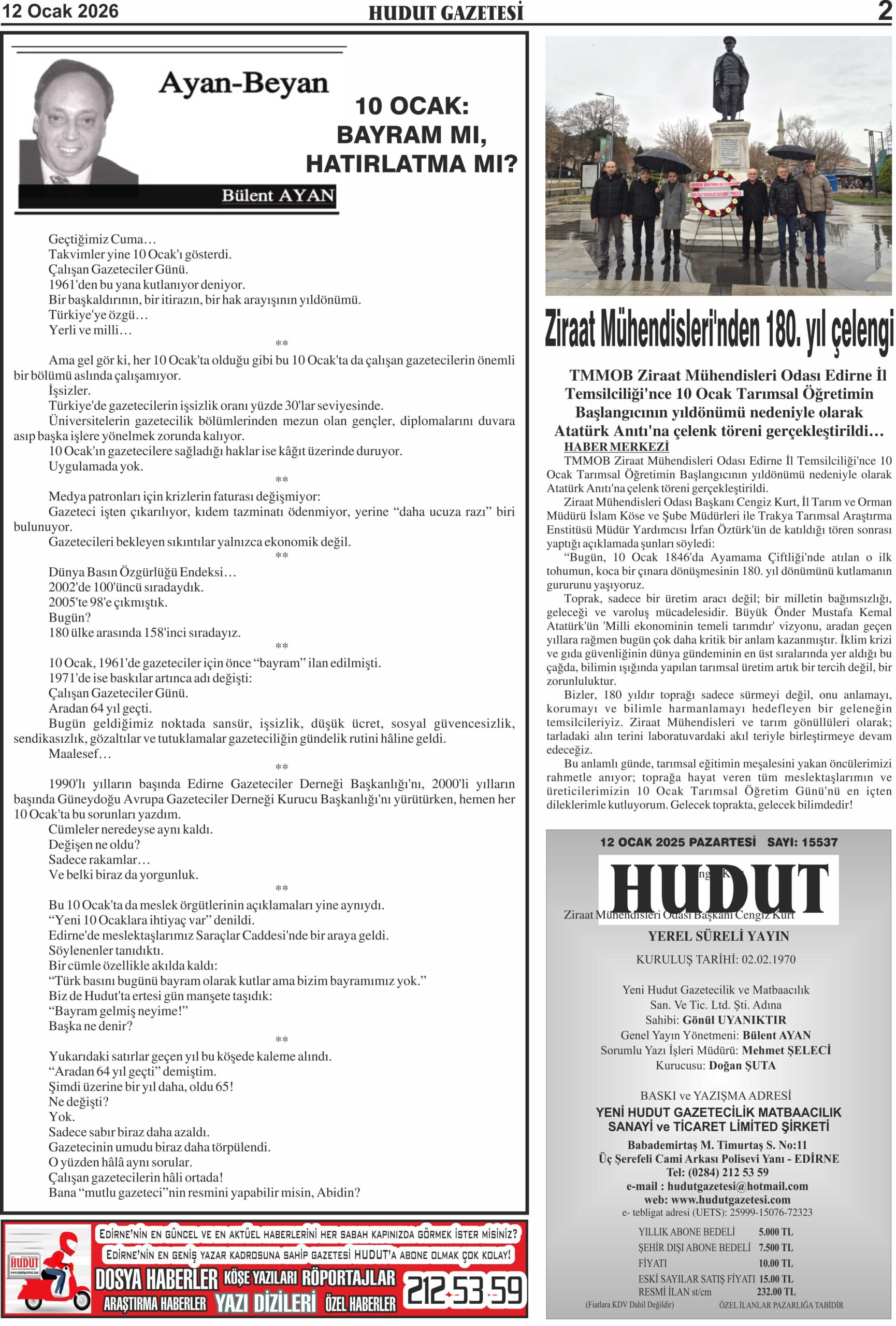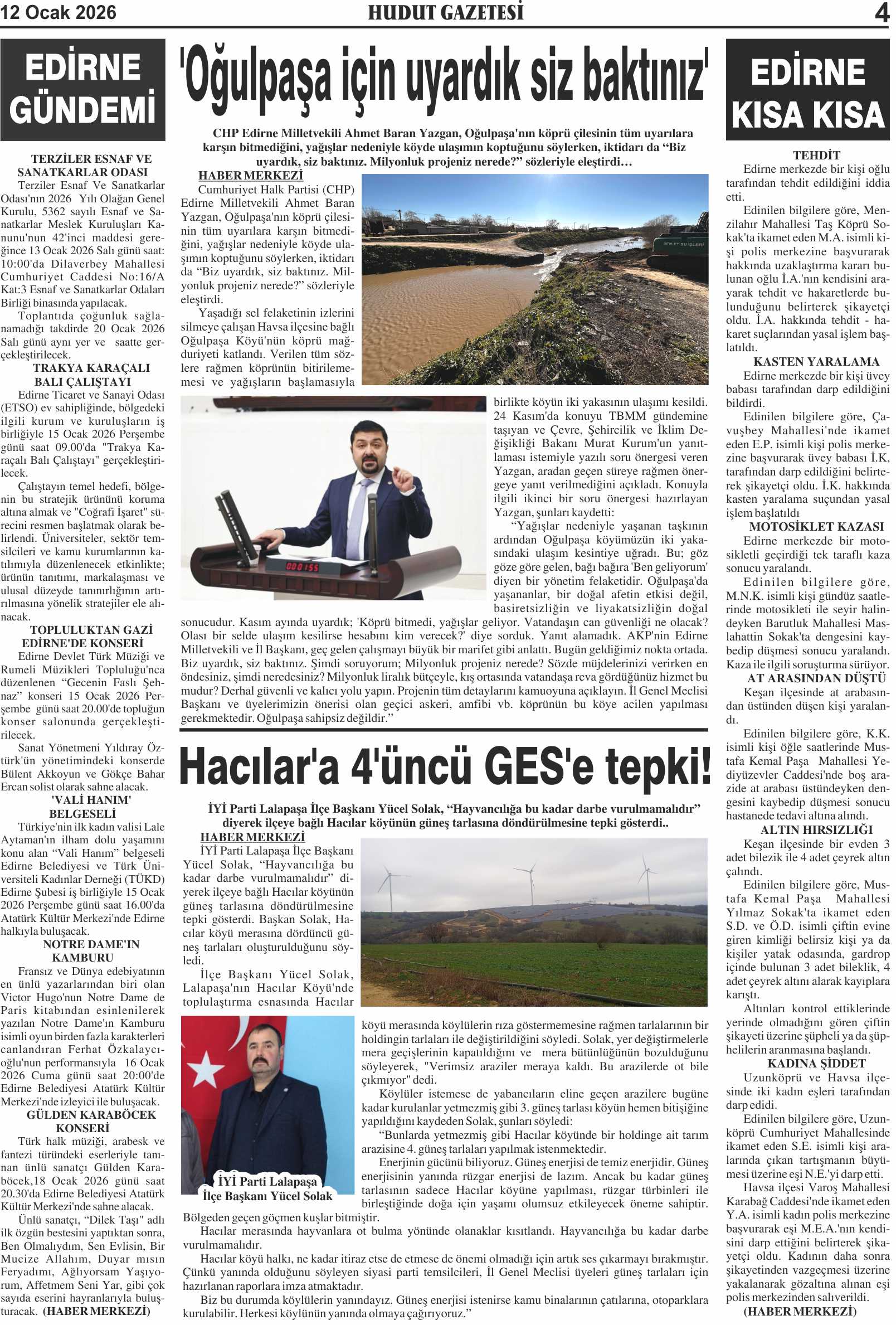 12 Ocak 2026 Pazartesi Hudut Gazetesi