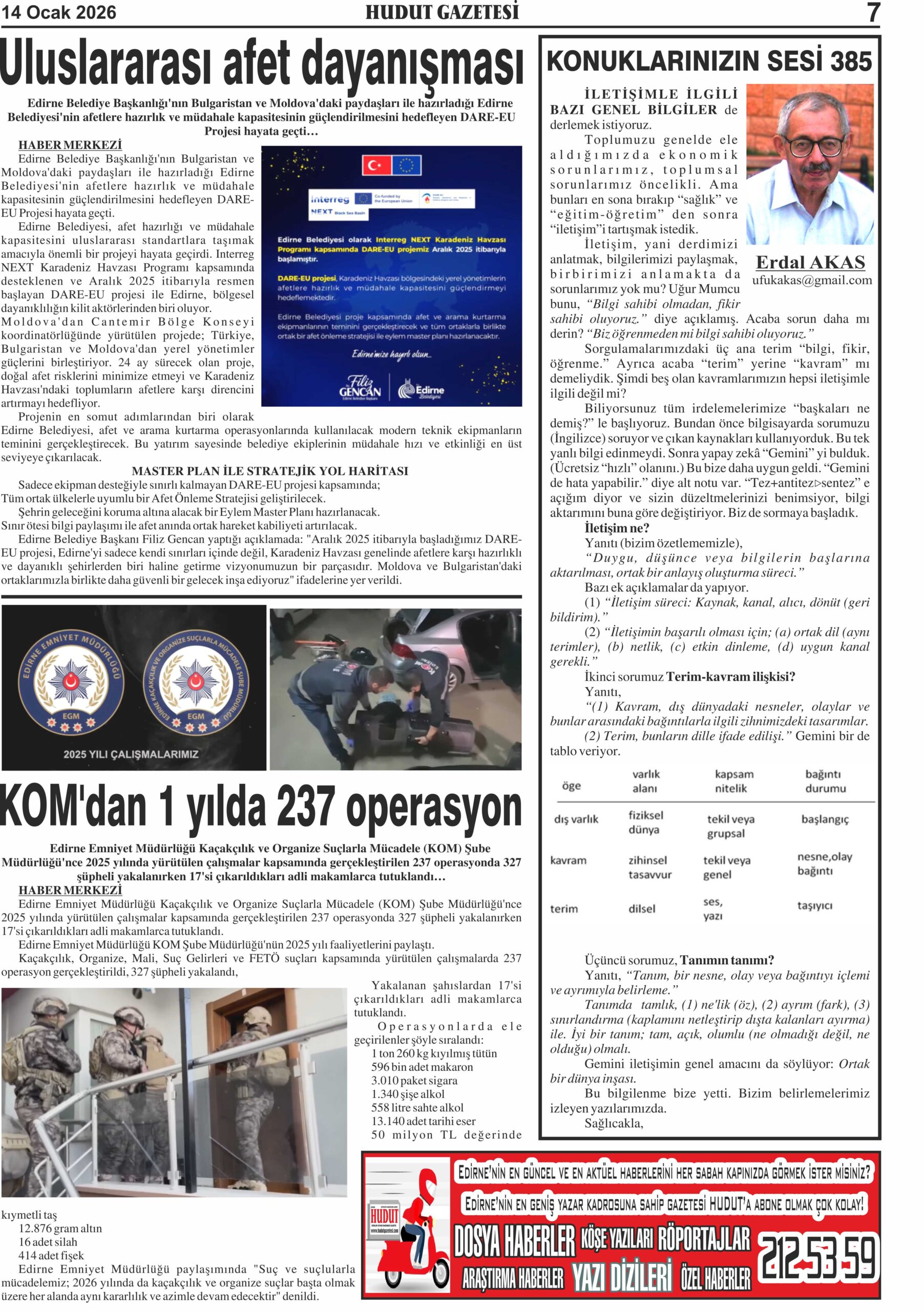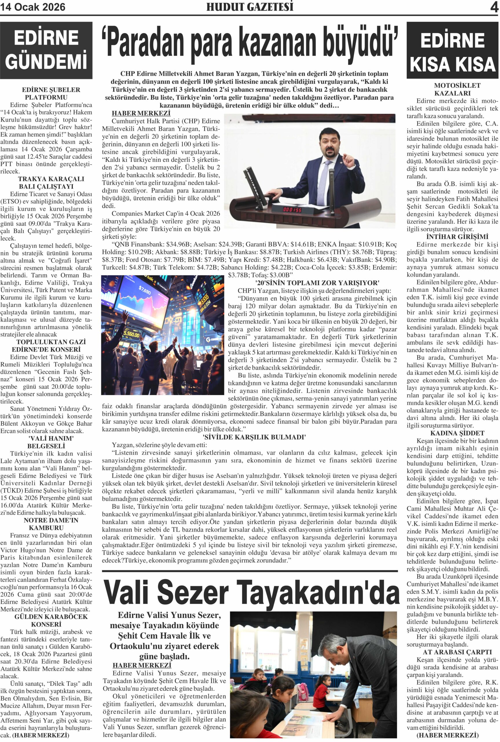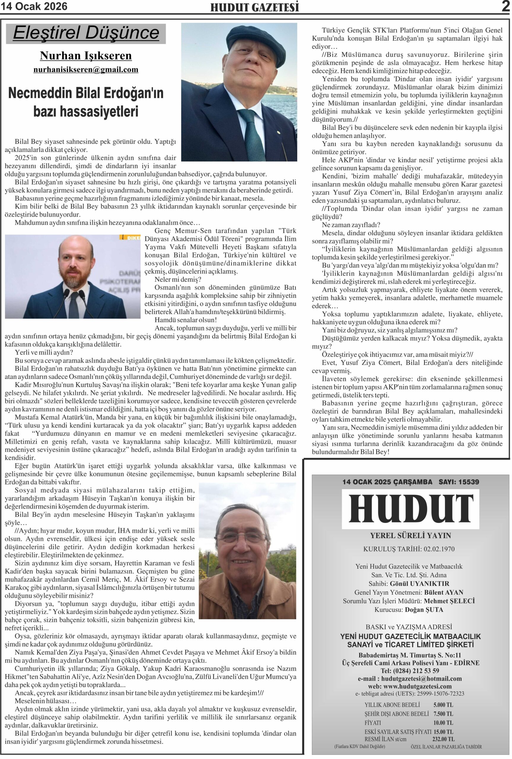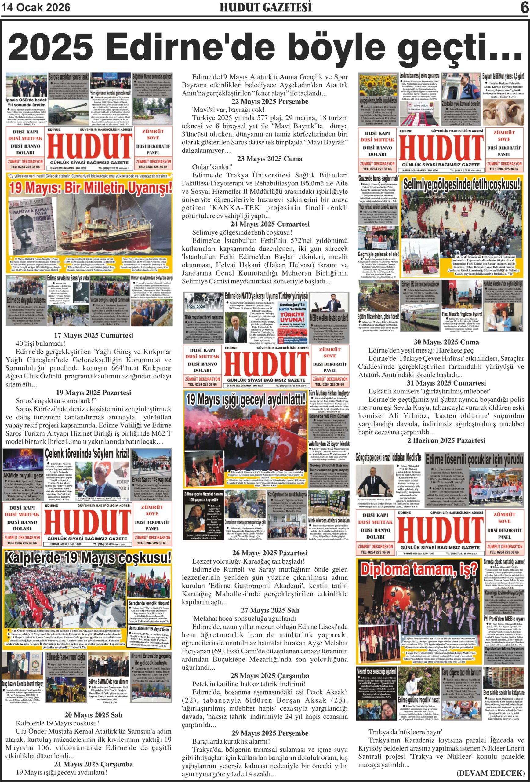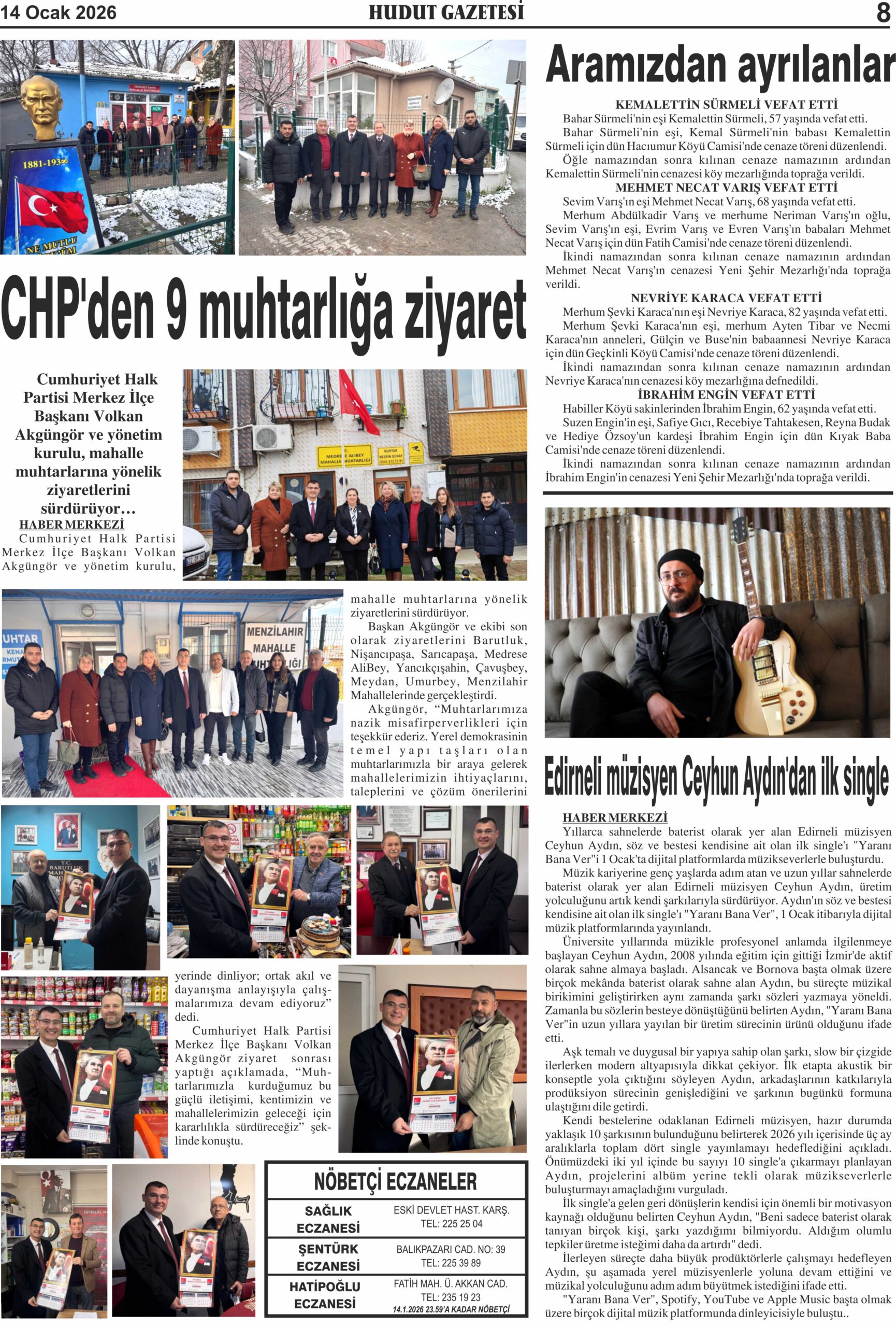 14 Ocak 2026 Çarşamba Hudut Gazetesi