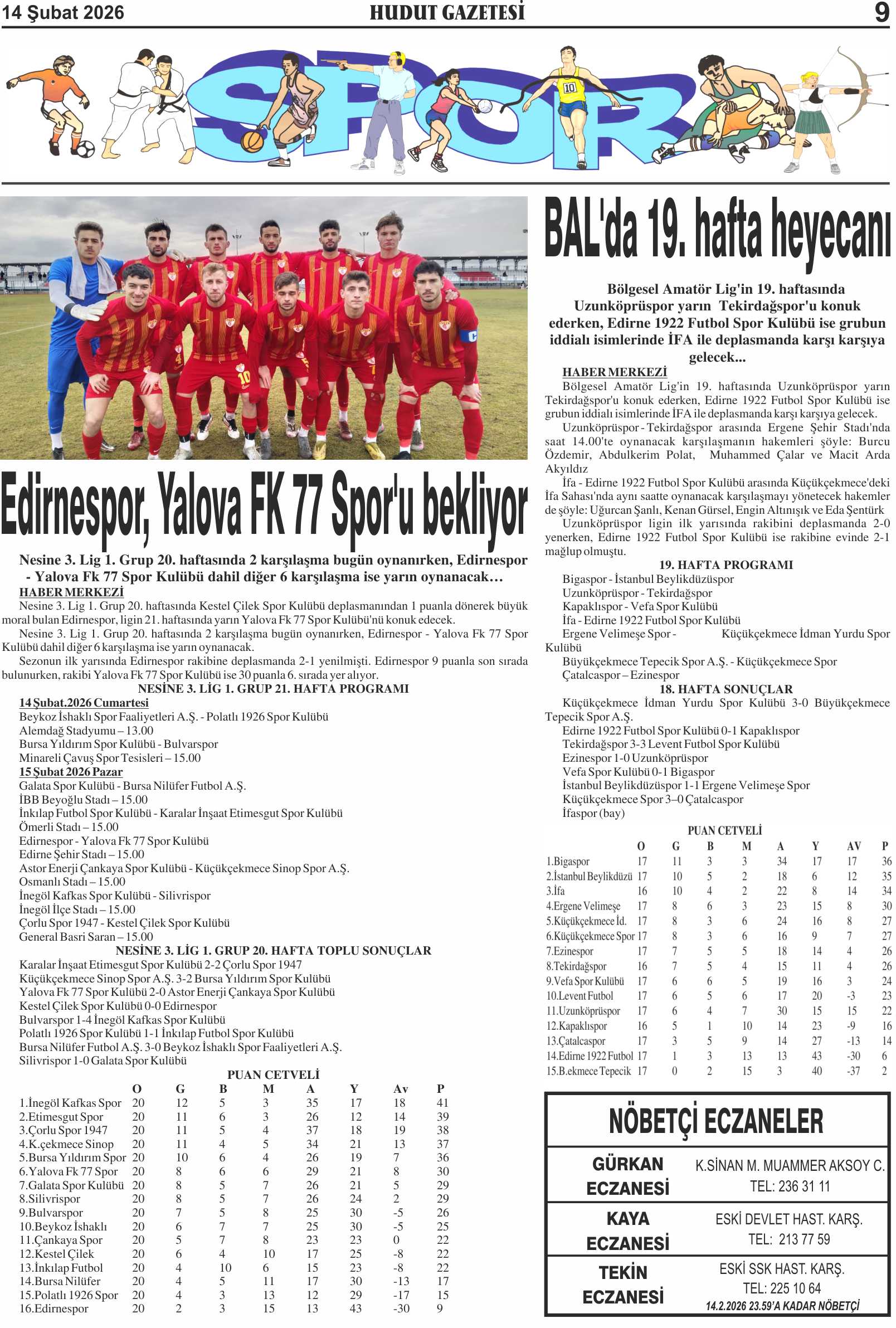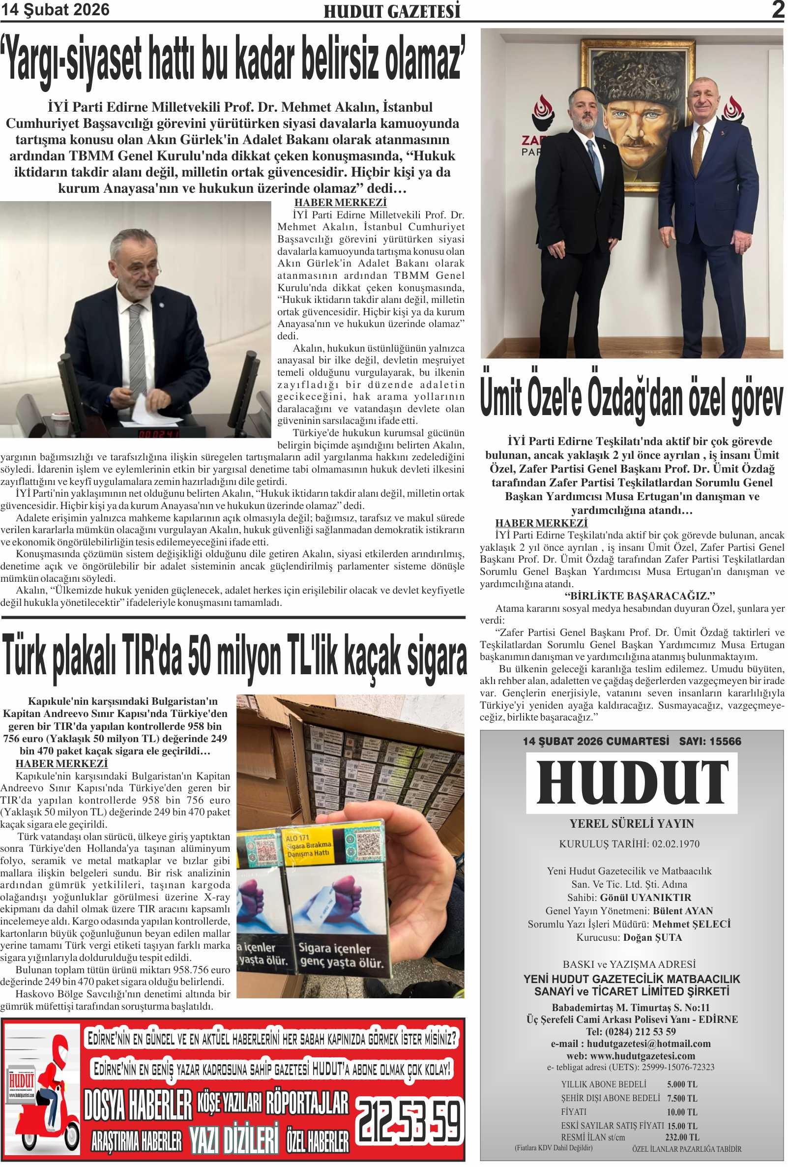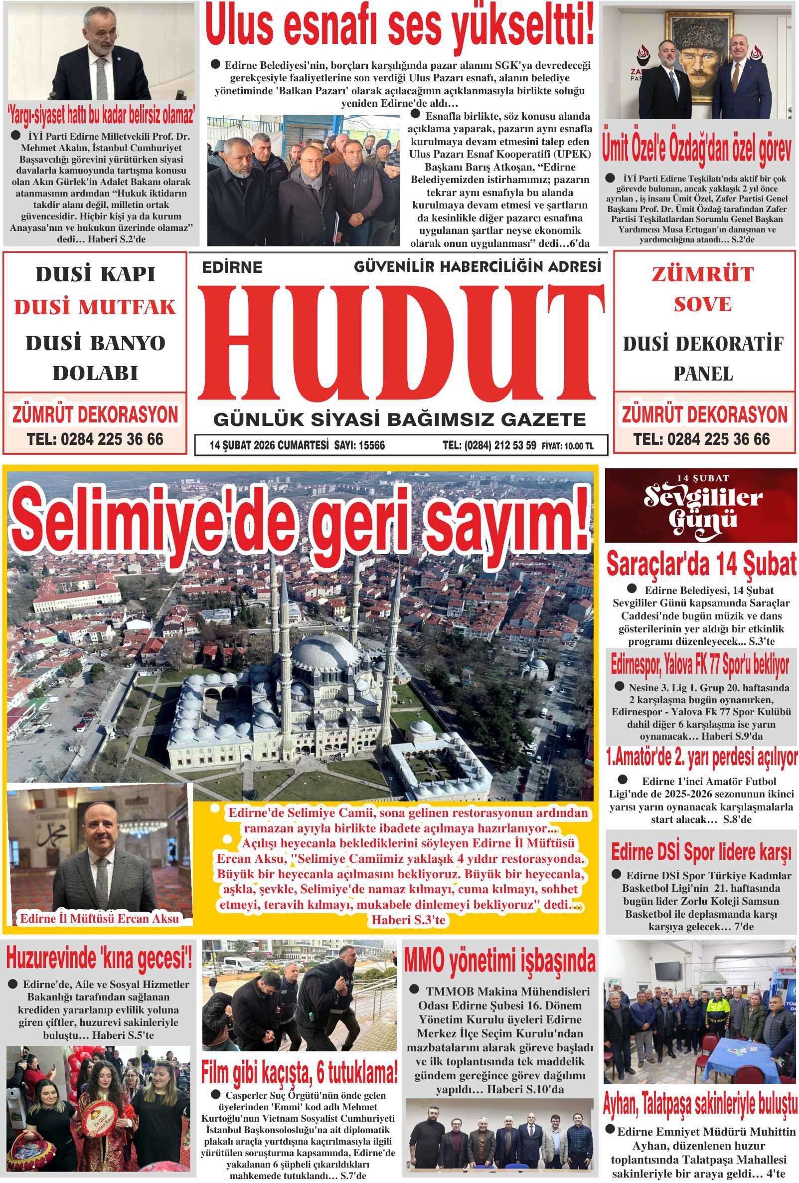 14 Şubat 2026 Cumartesi Hudut Gazetesi
