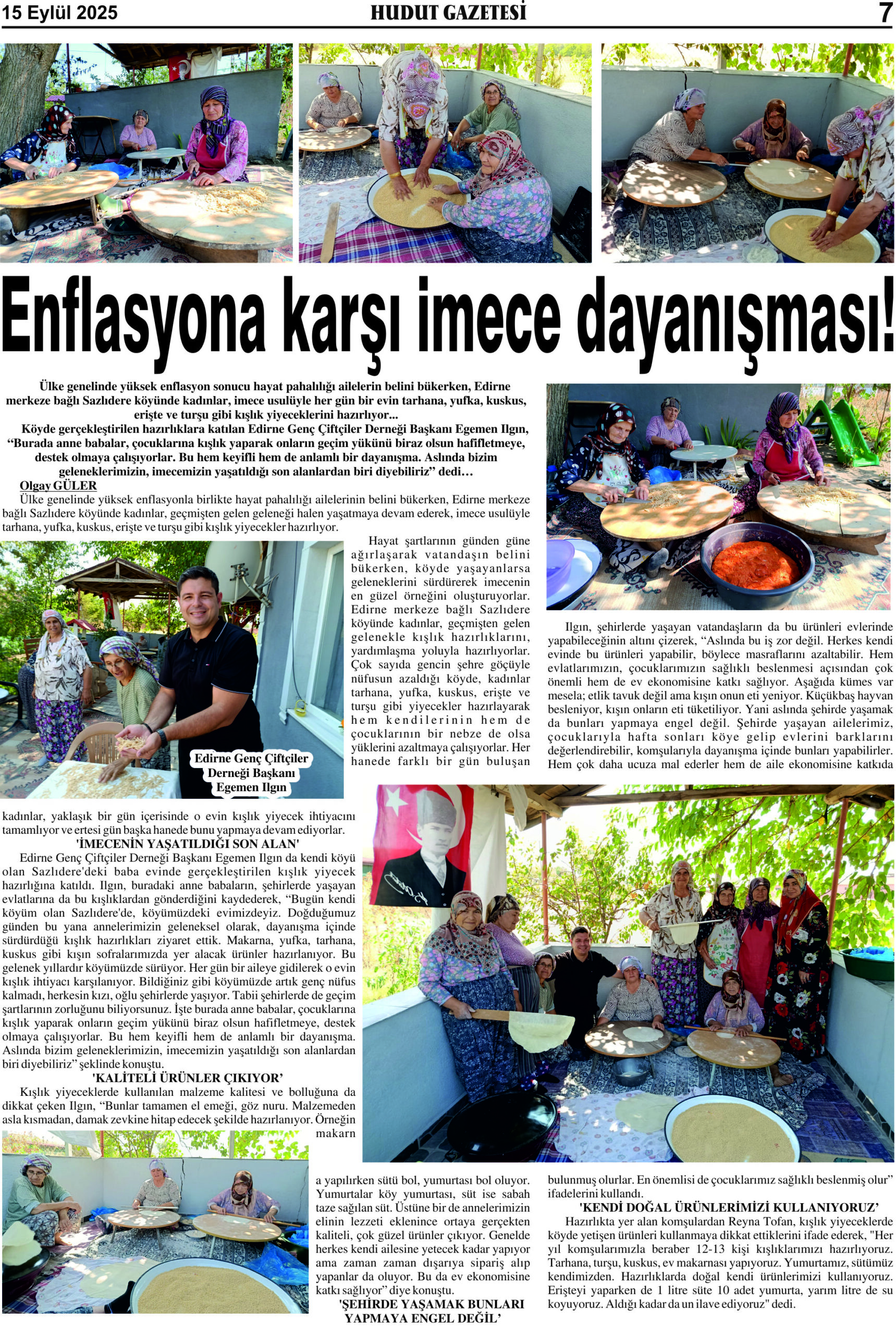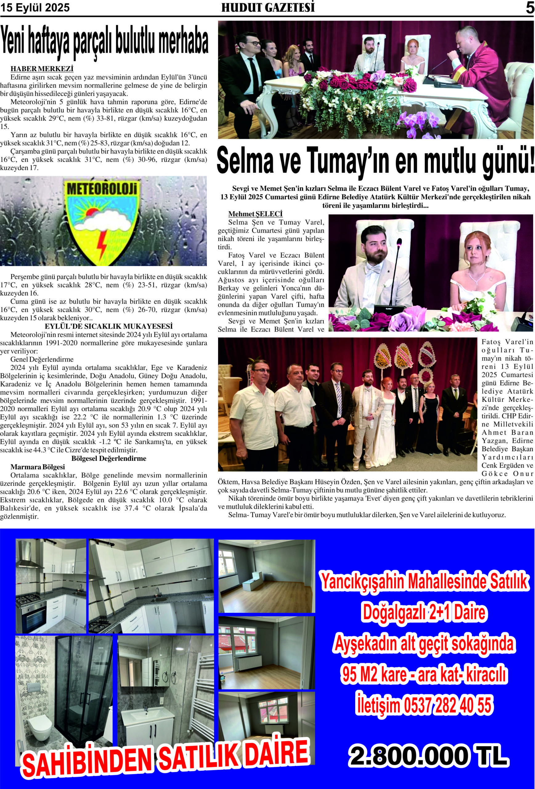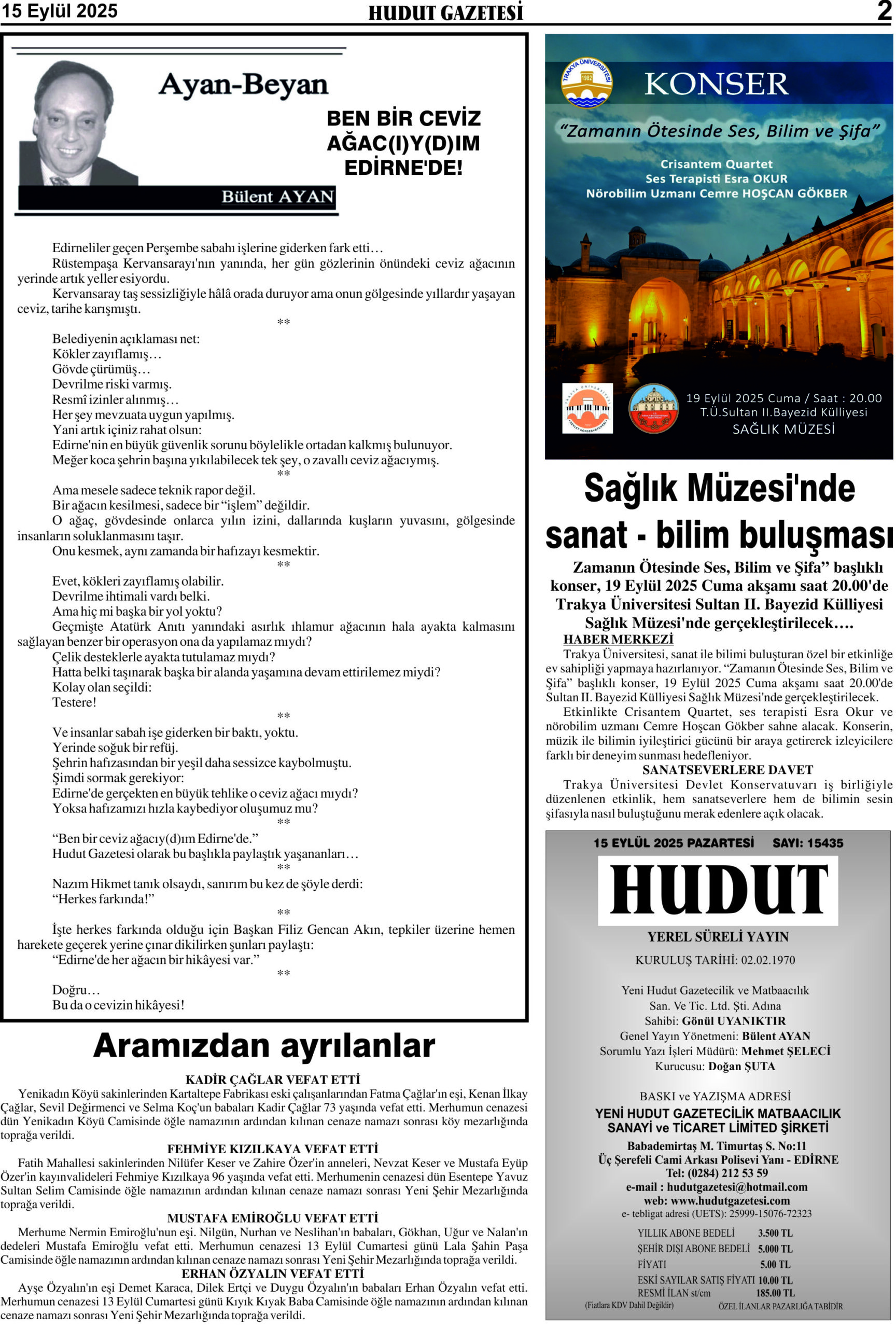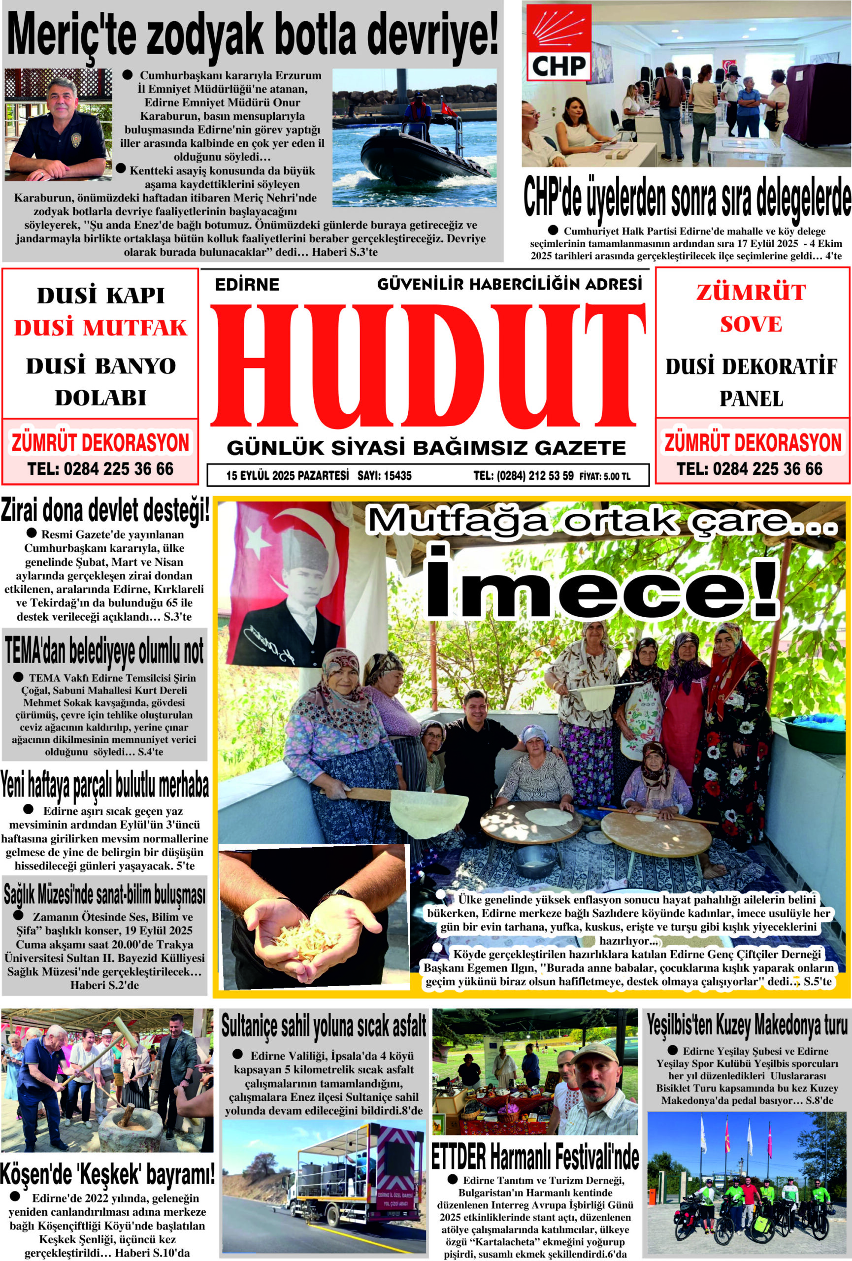 15 Eylül 2025 Pazartesi Hudut Gazetesi