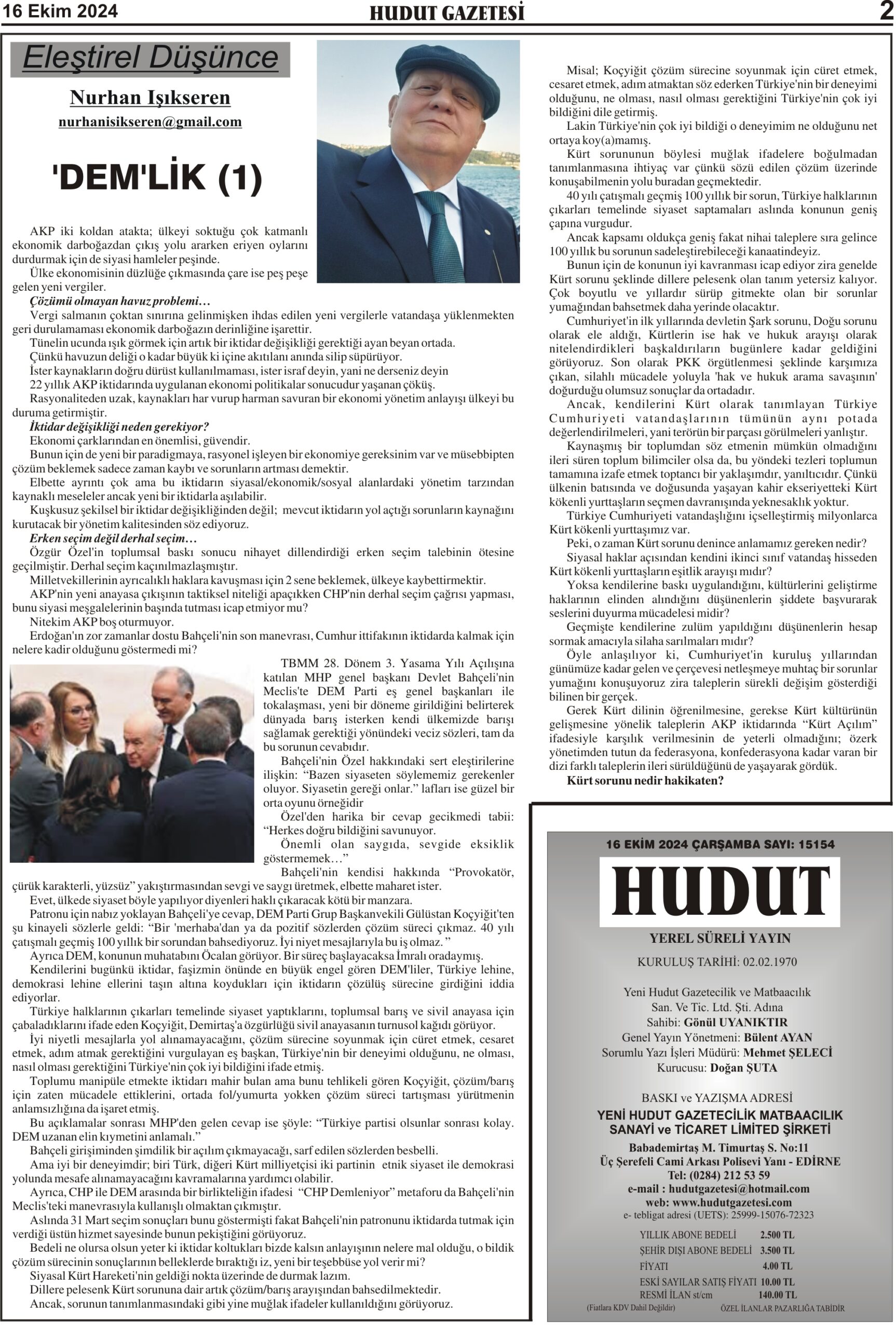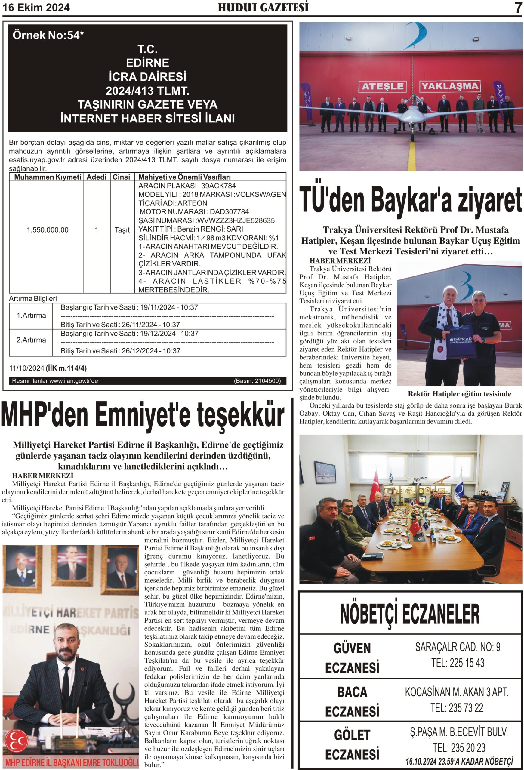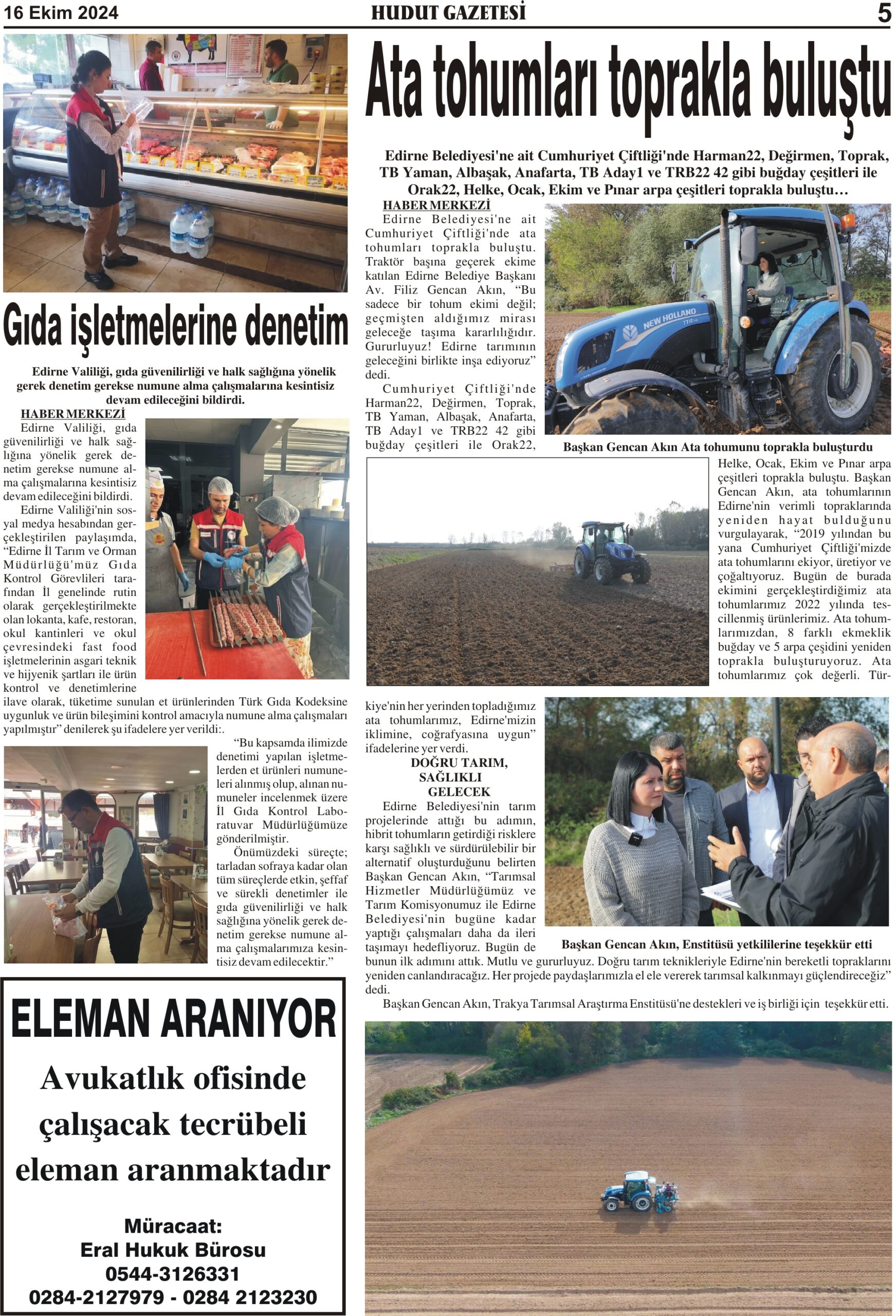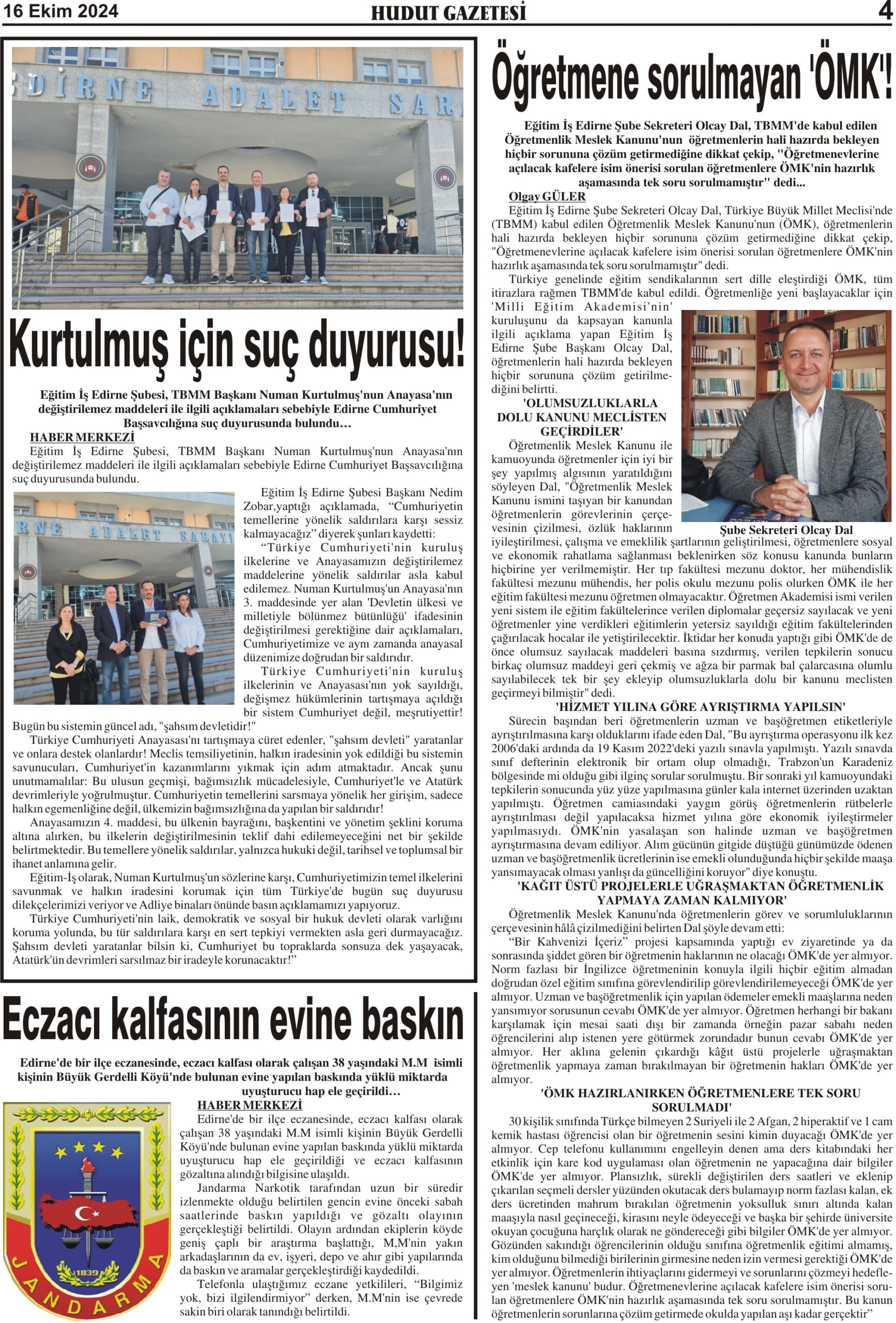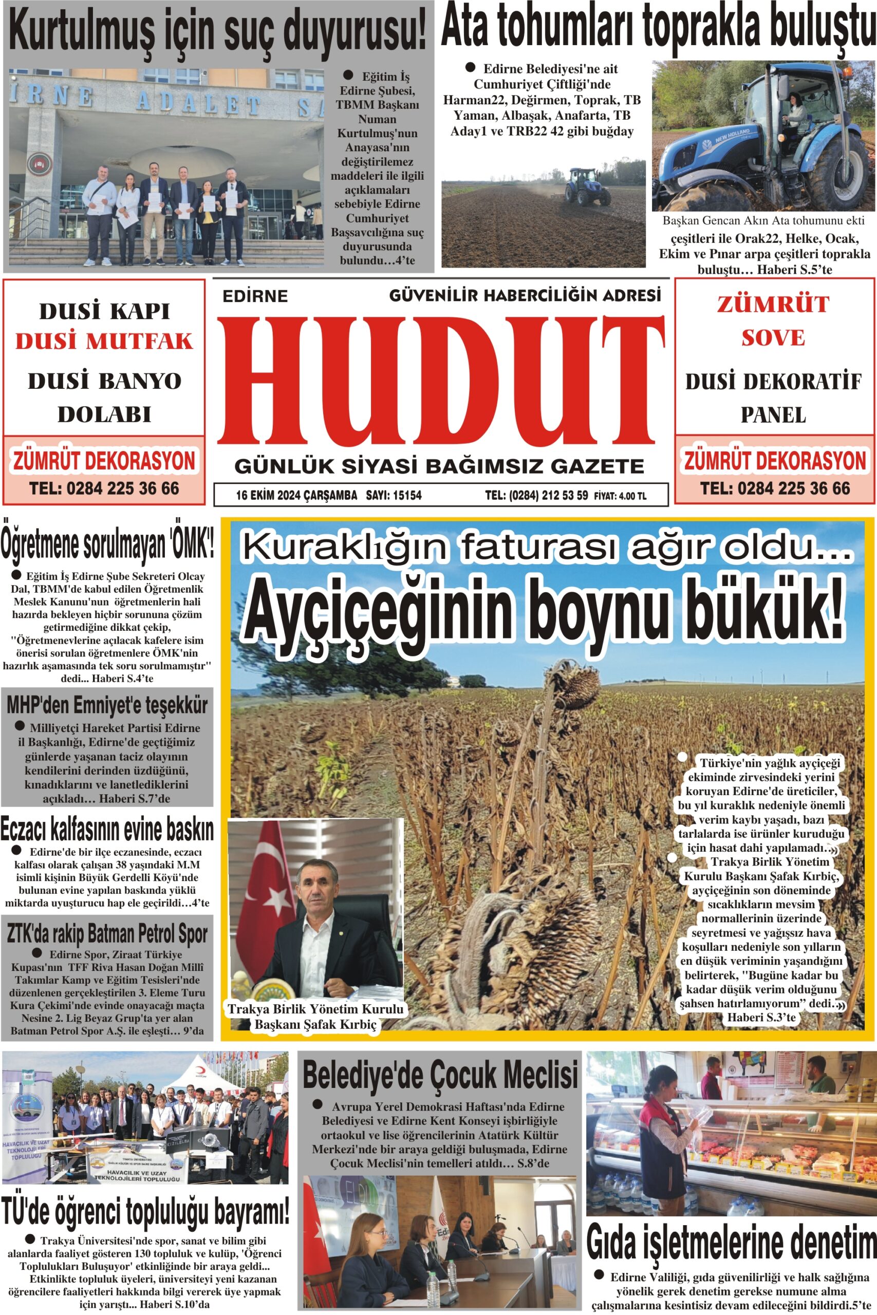 16 Ekim 2024 Çarşamba Hudut Gazetesi