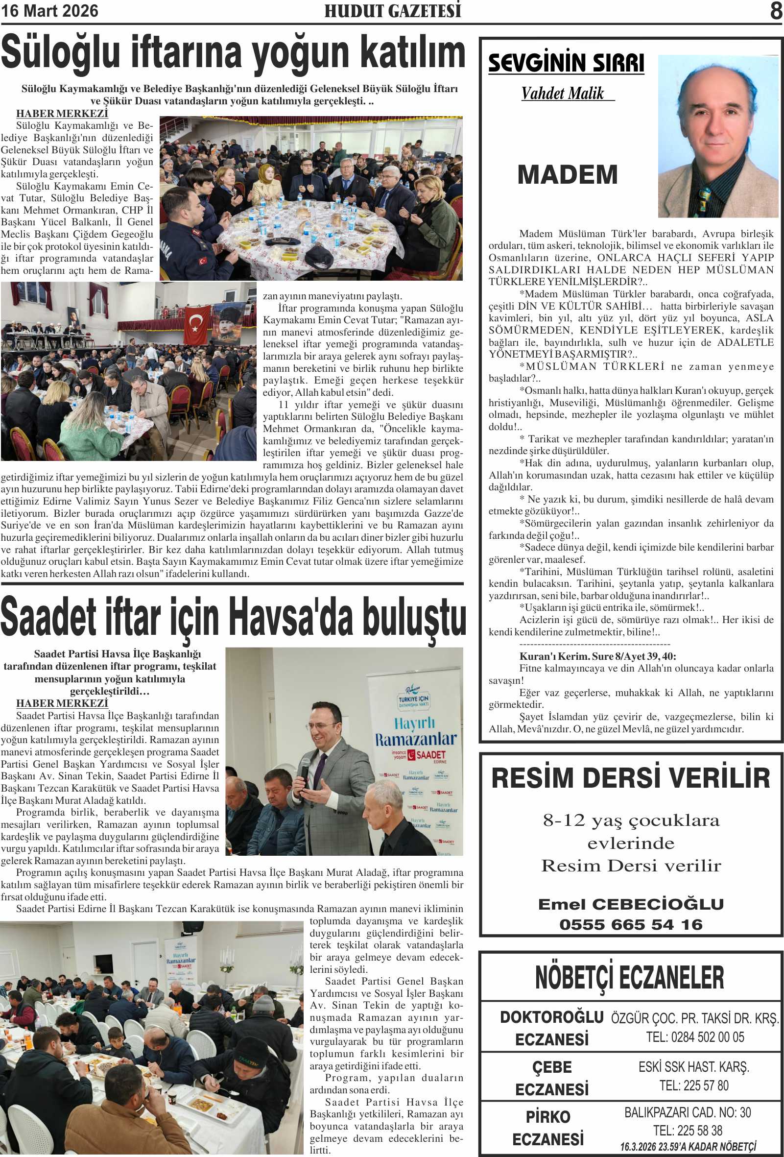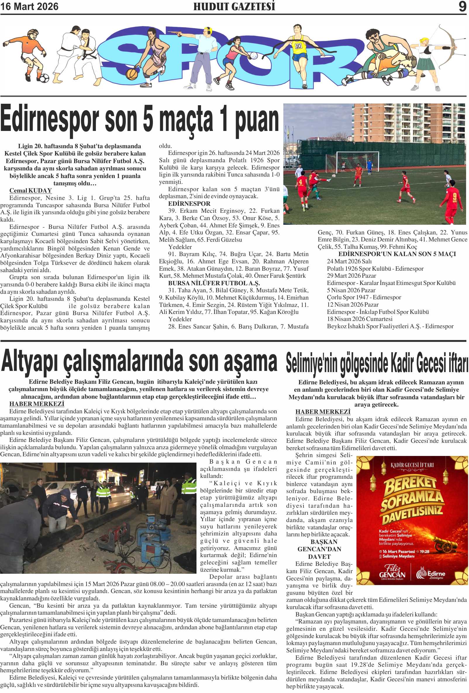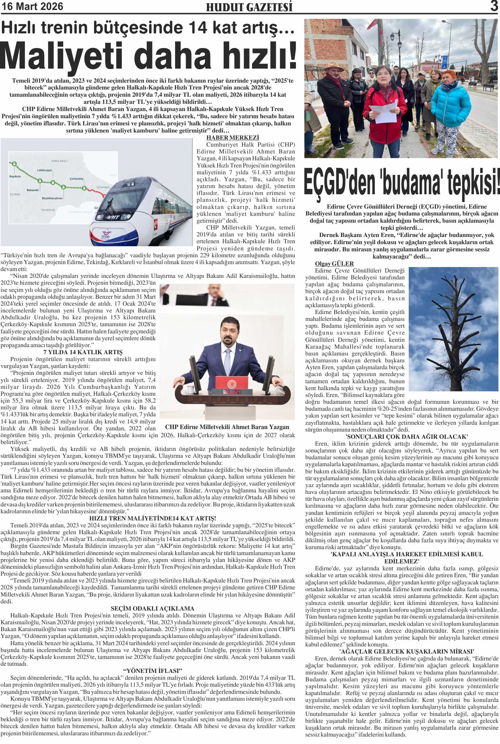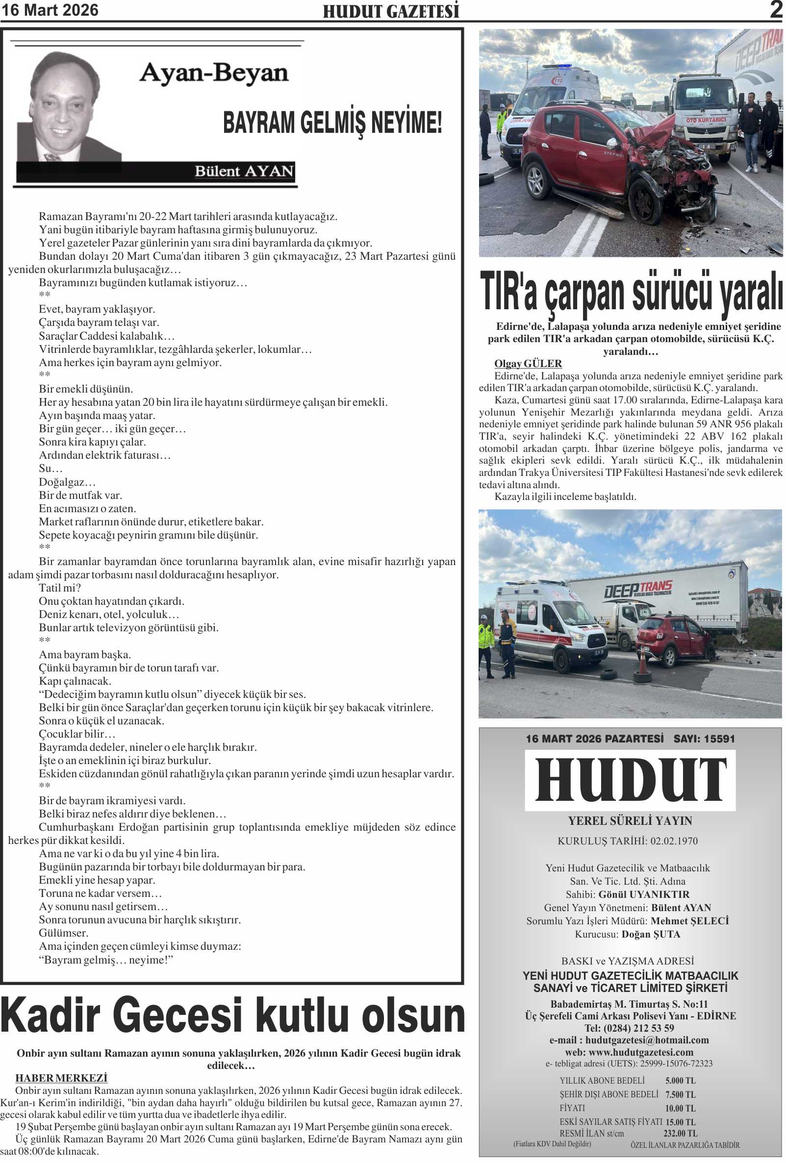 16 Mart 2026 Pazartesi Hudut Gazetesi