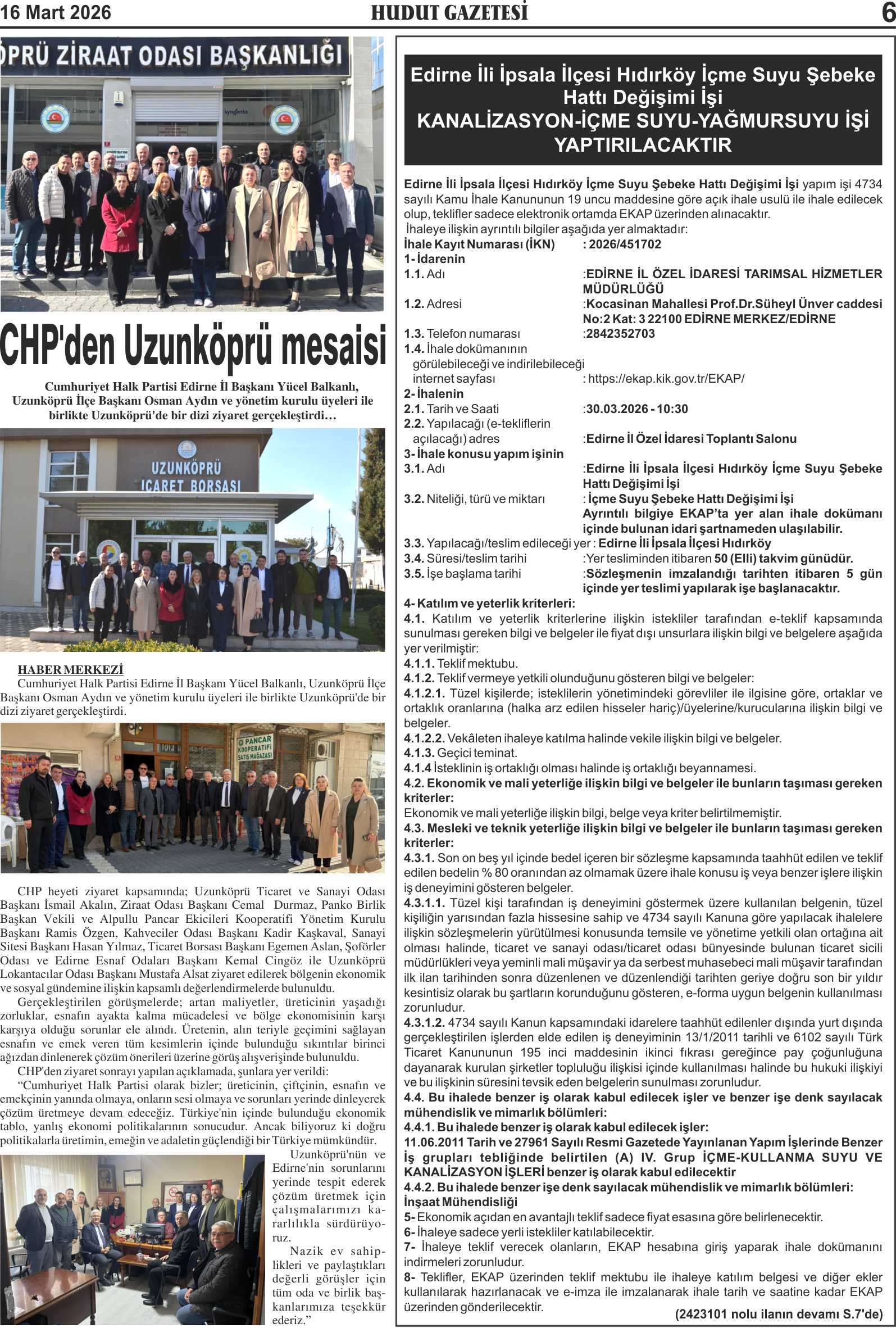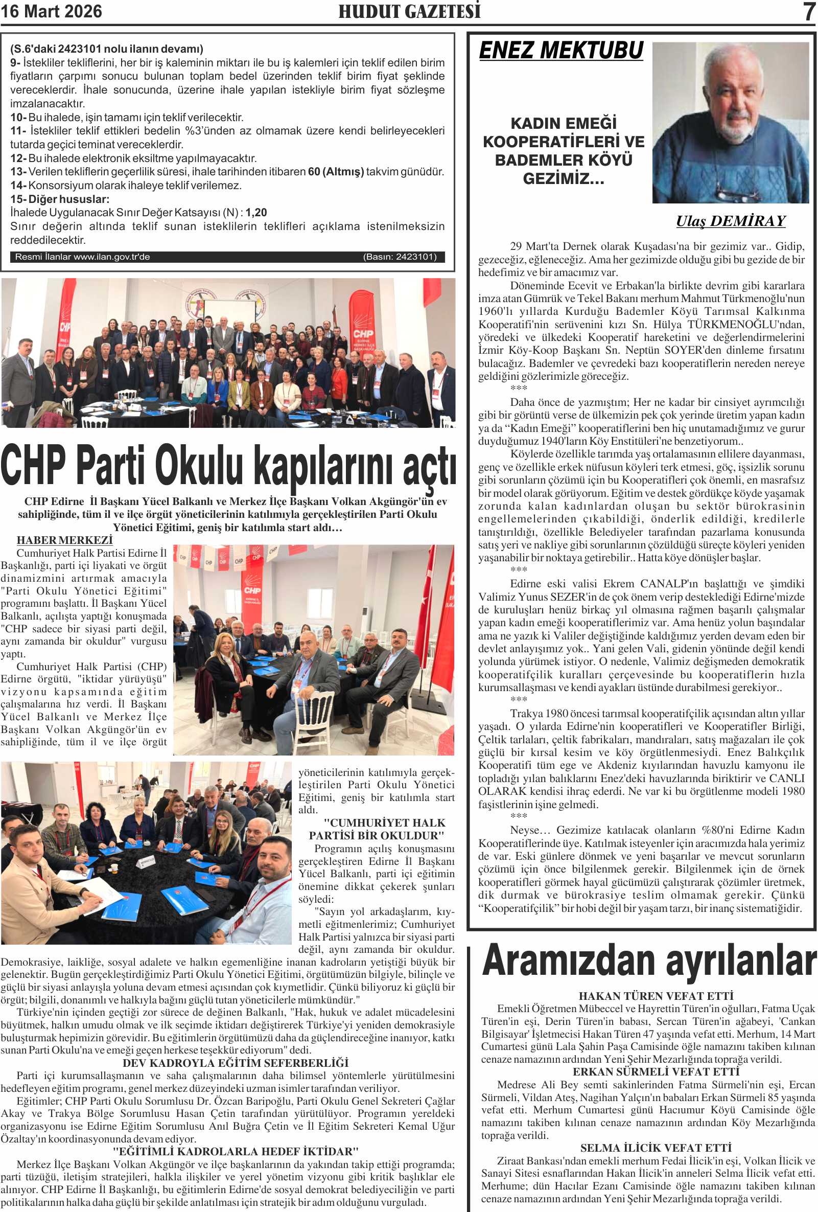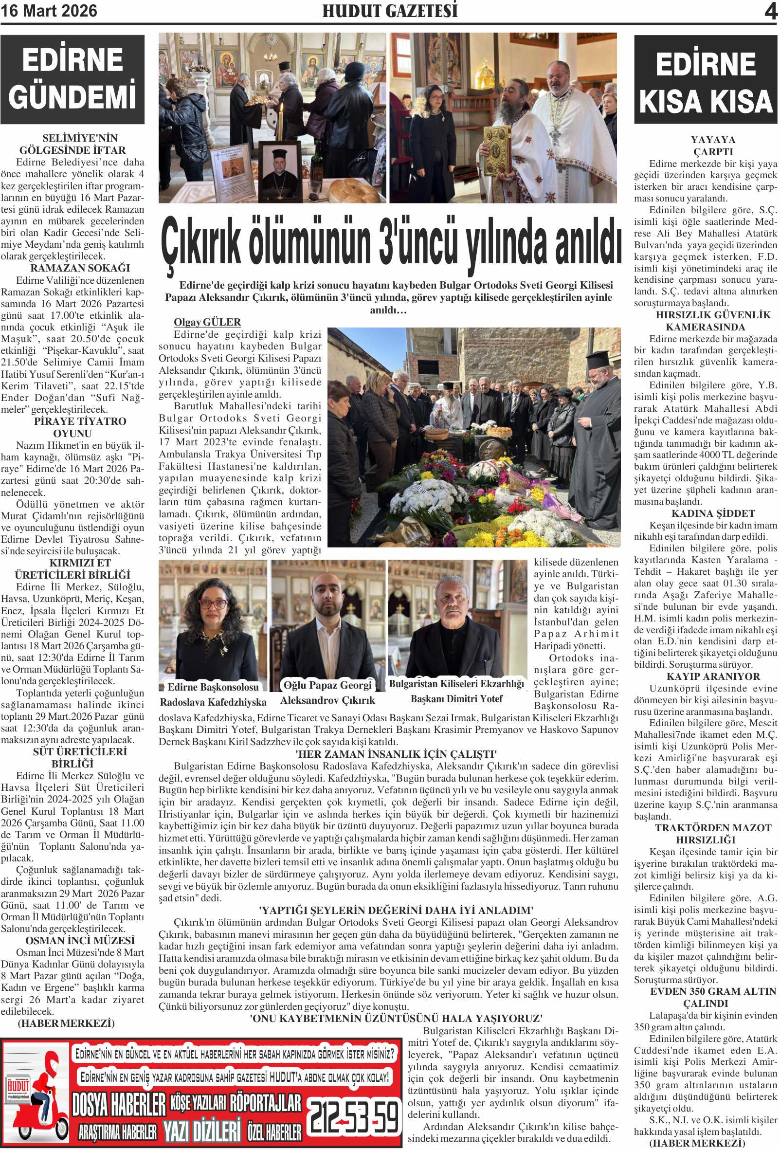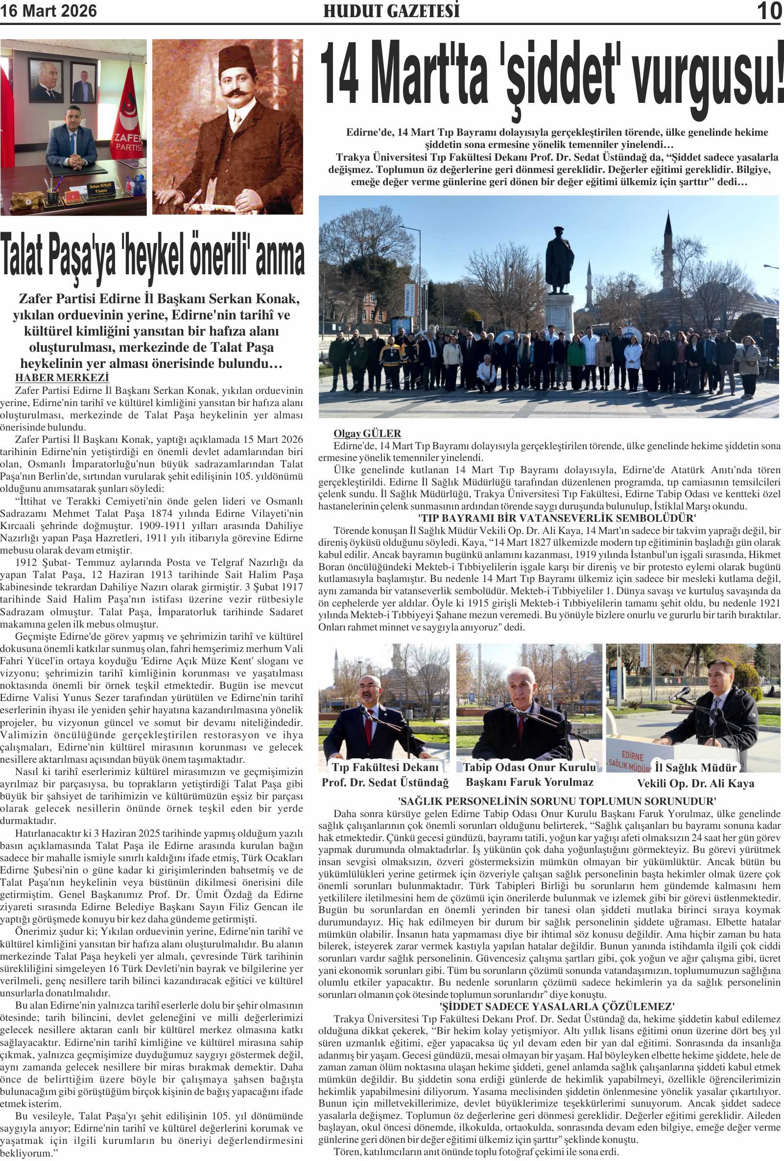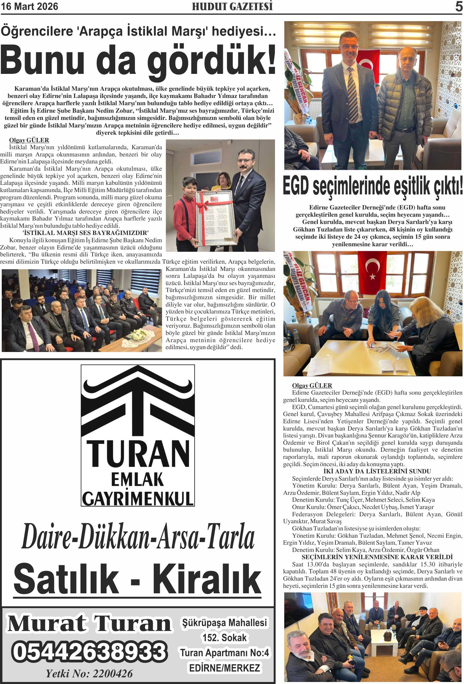 16 Mart 2026 Pazartesi Hudut Gazetesi