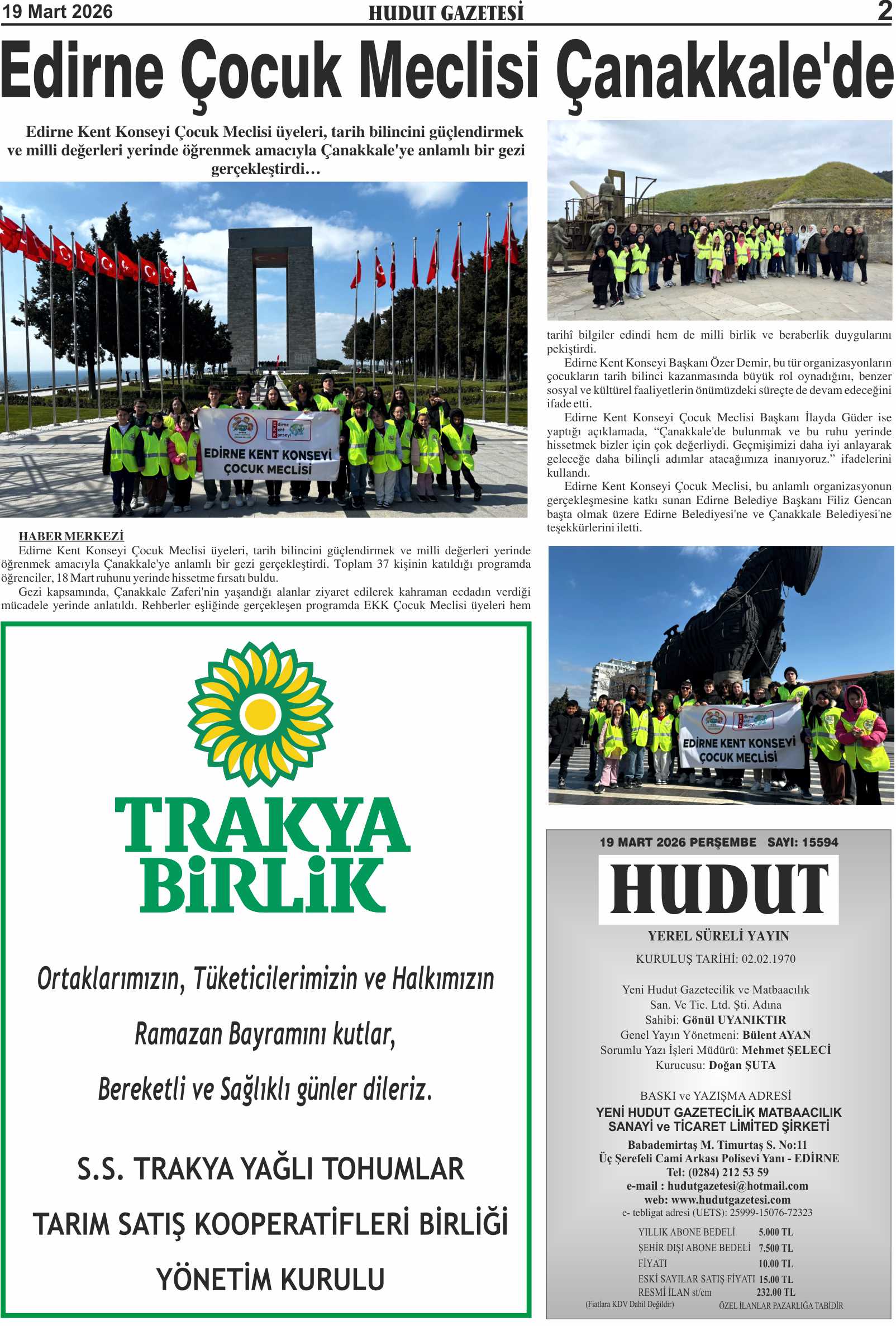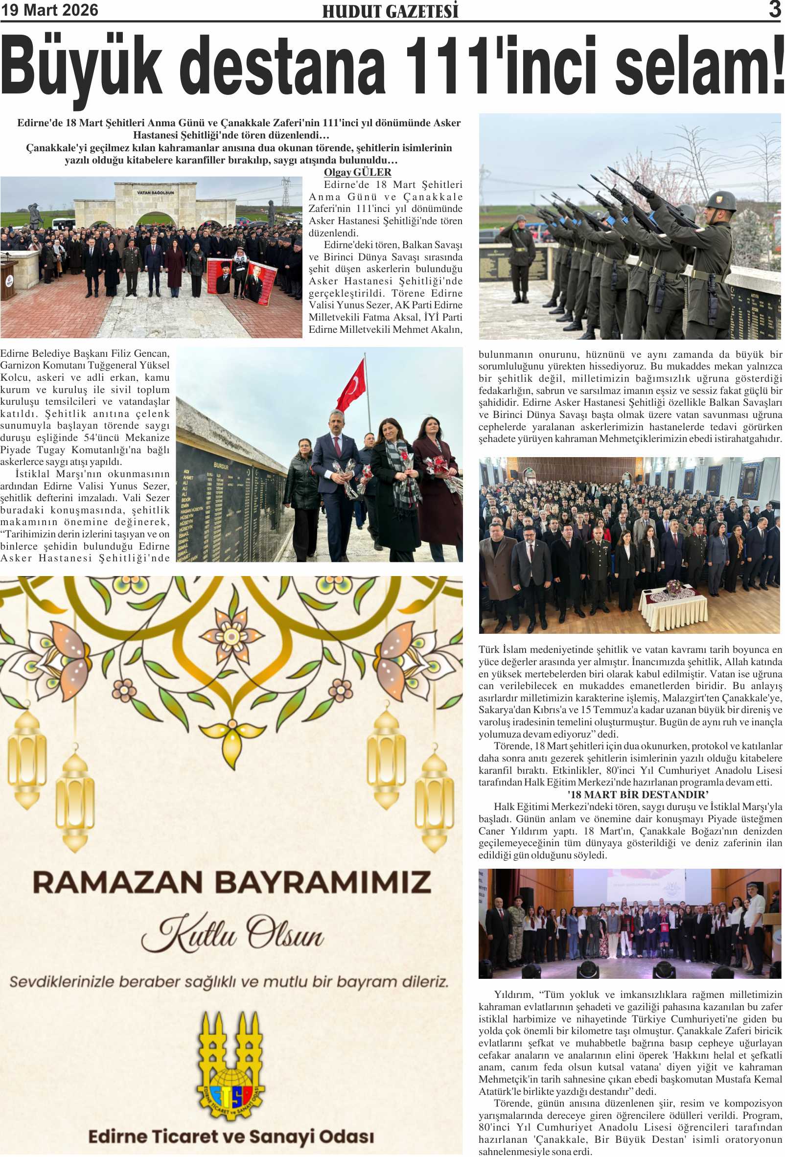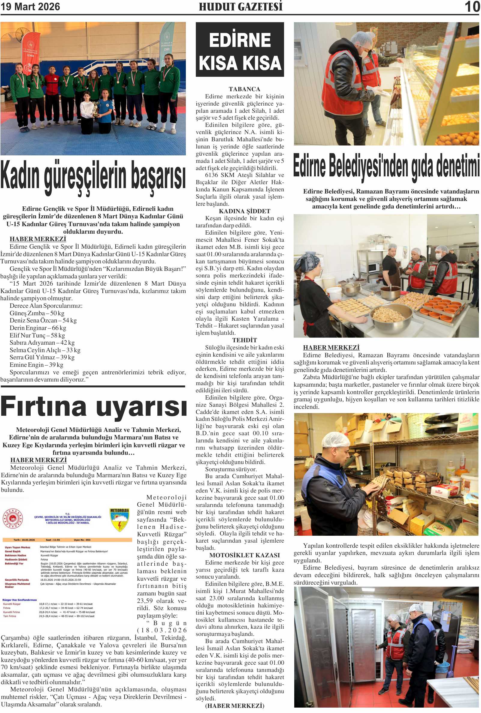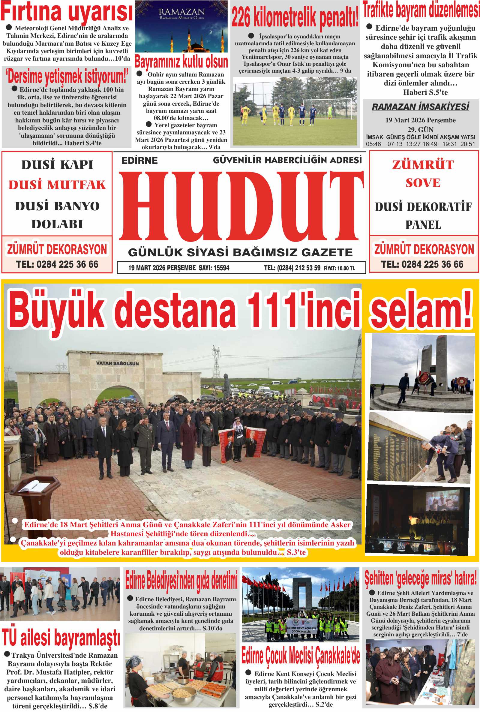 19 Mart 2026 Perşembe Hudut Gazetesi