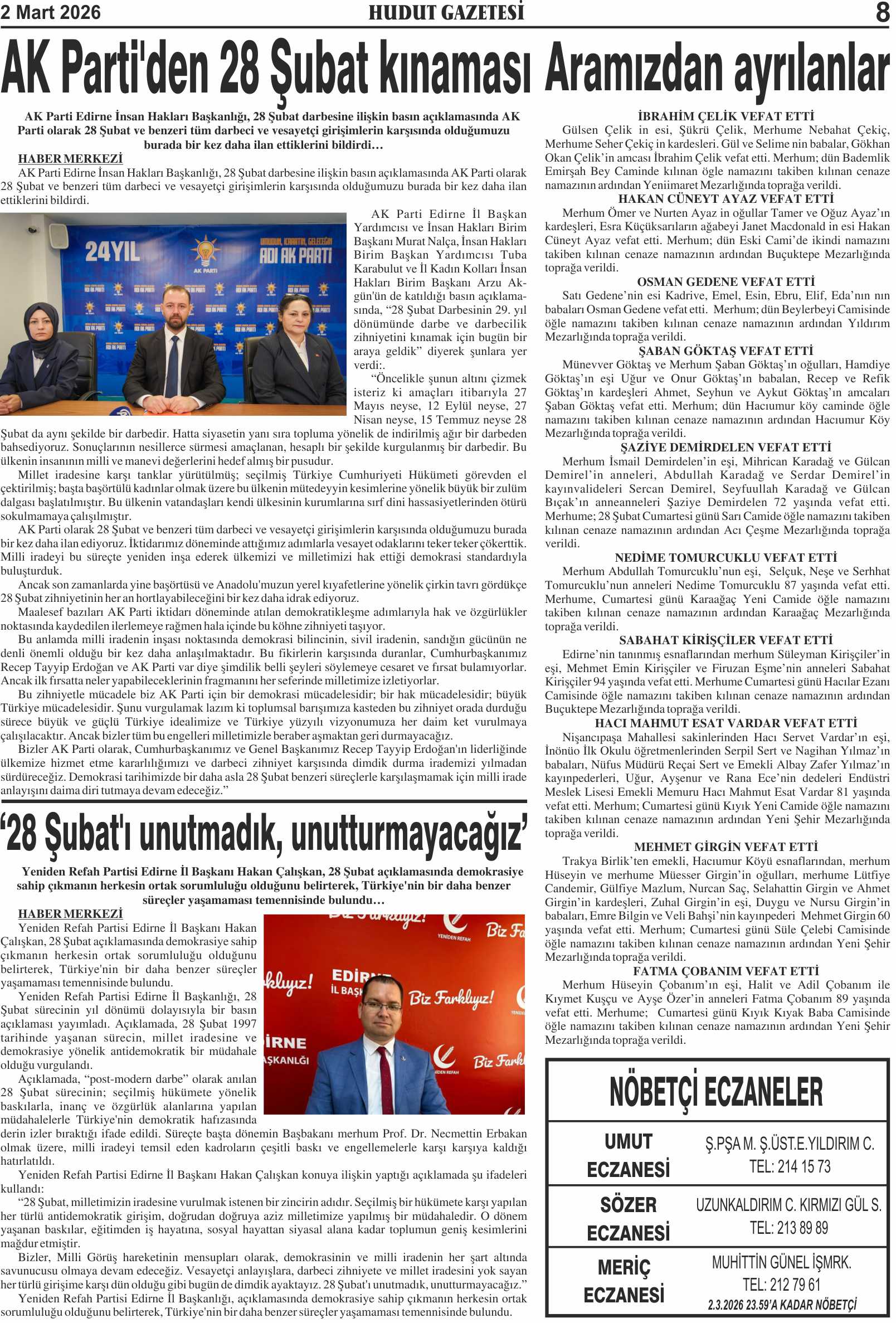28 Şubat 2026 Cumartesi Hudut Gazetesi