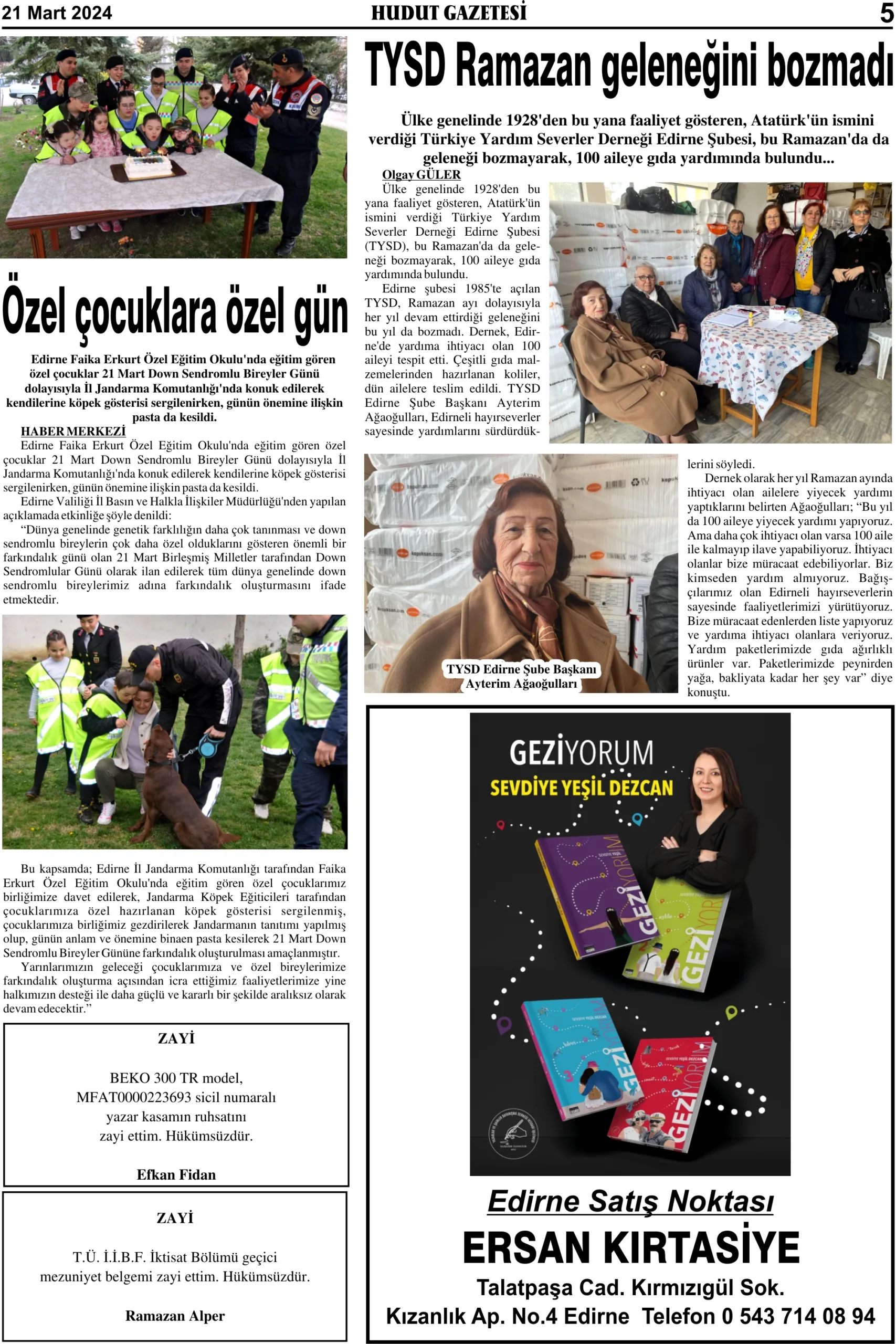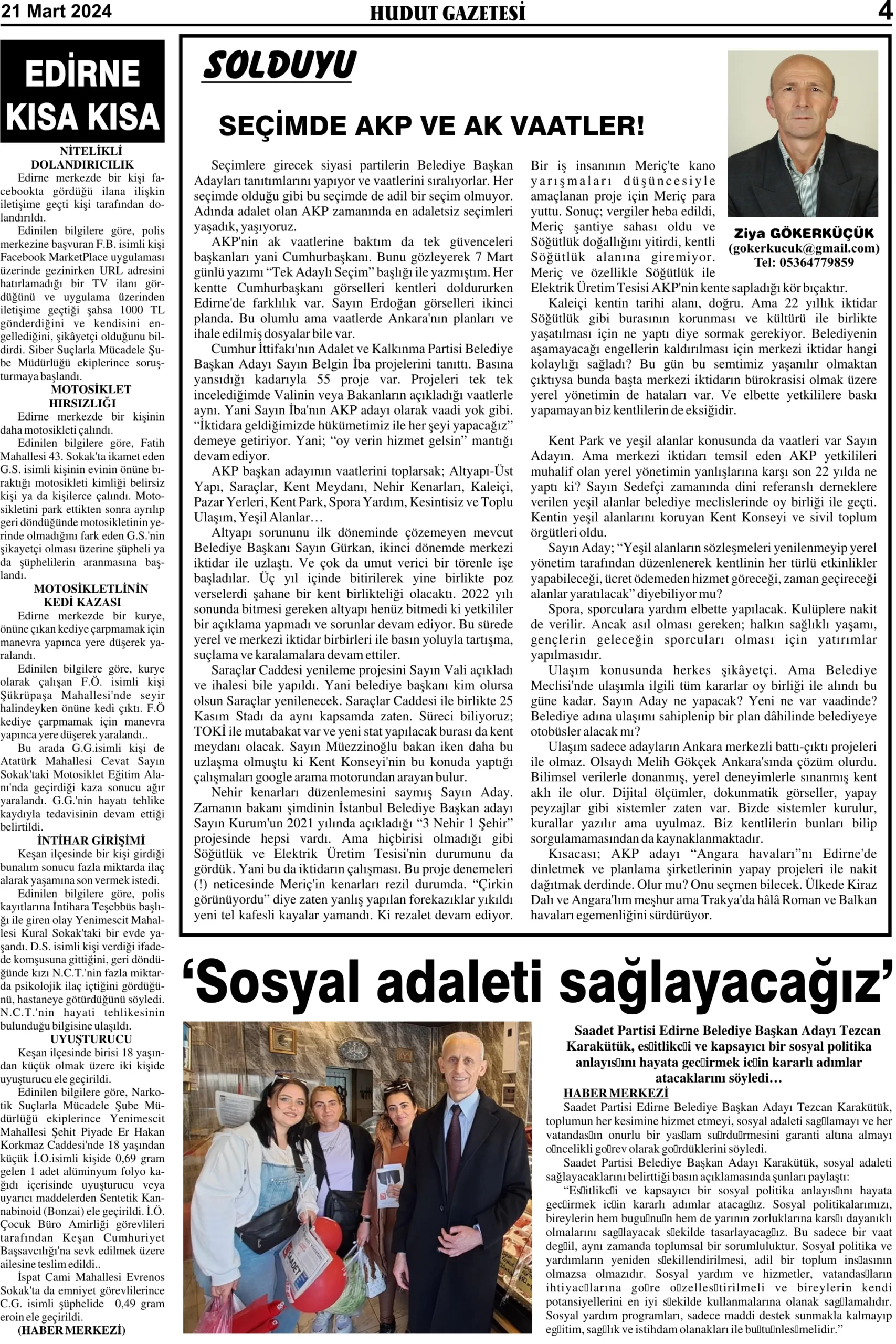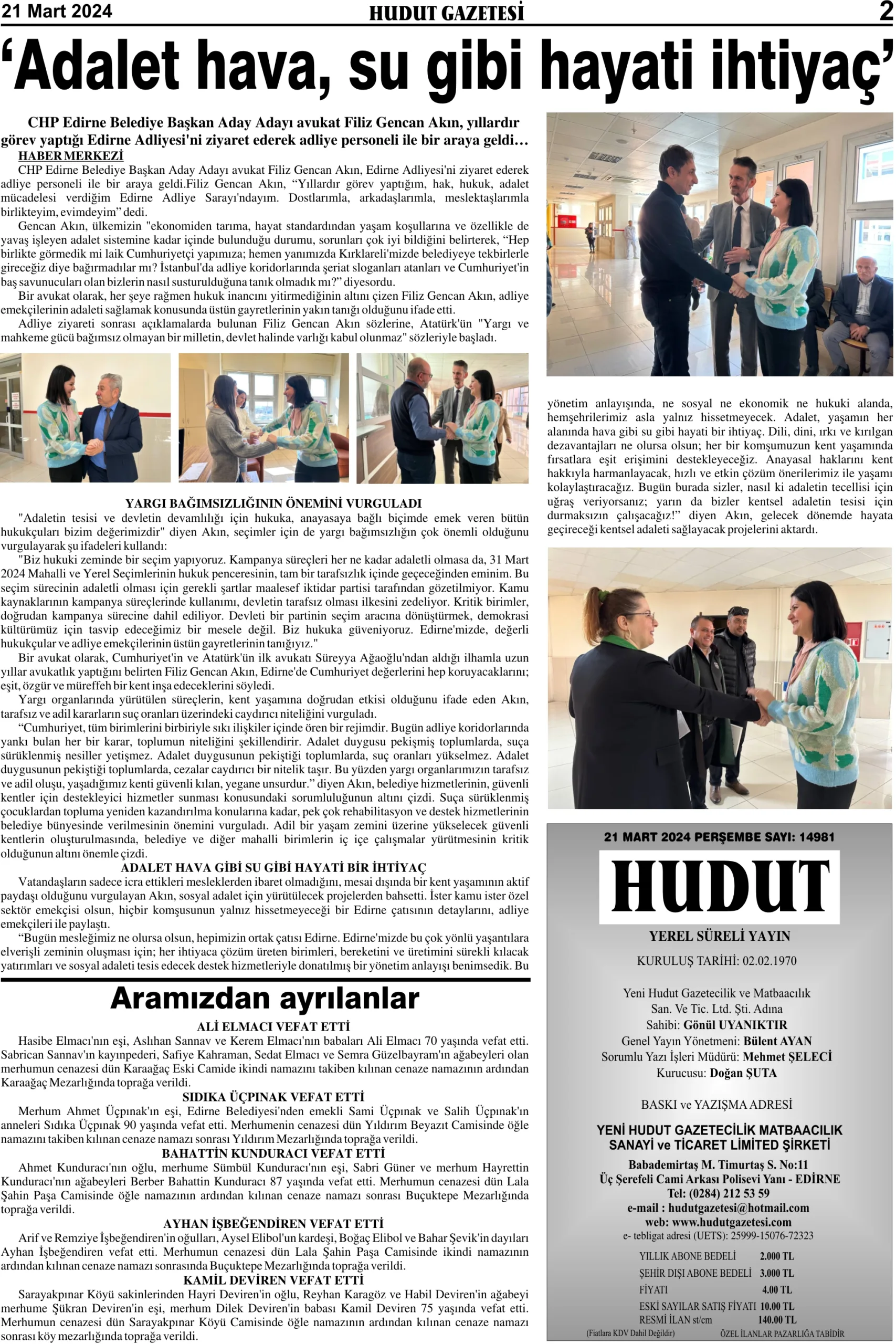 21 Mart 2024 Perşembe Hudut Gazetesi