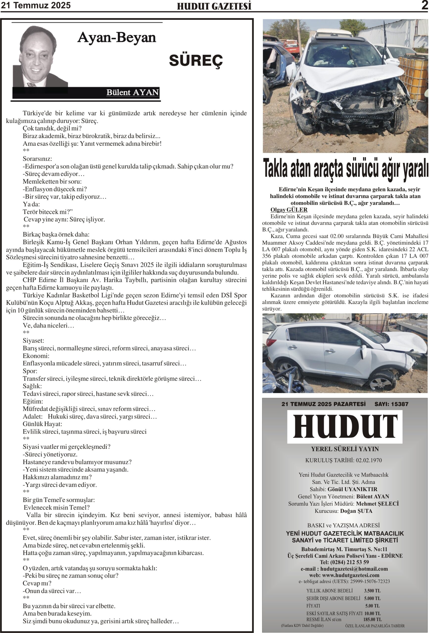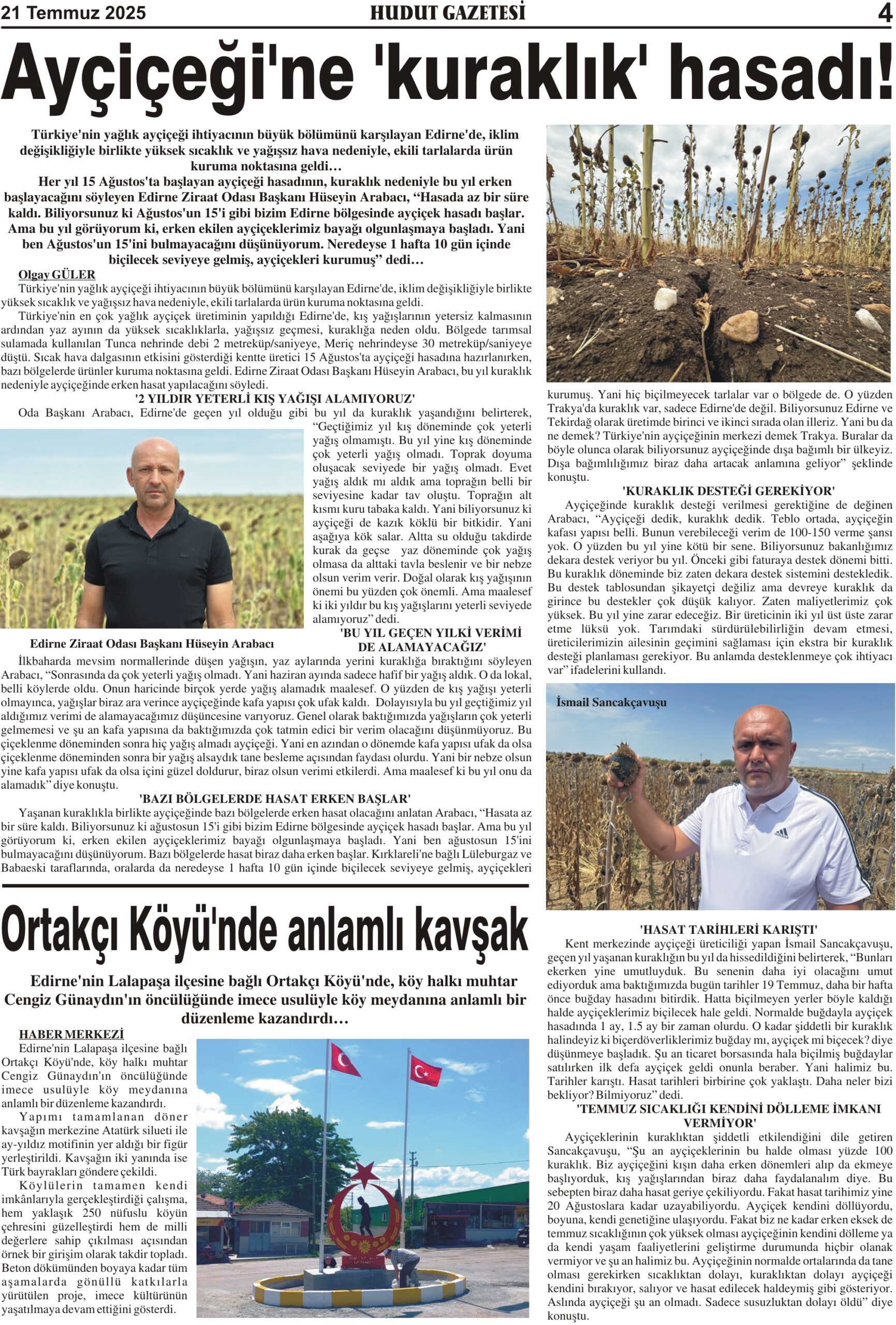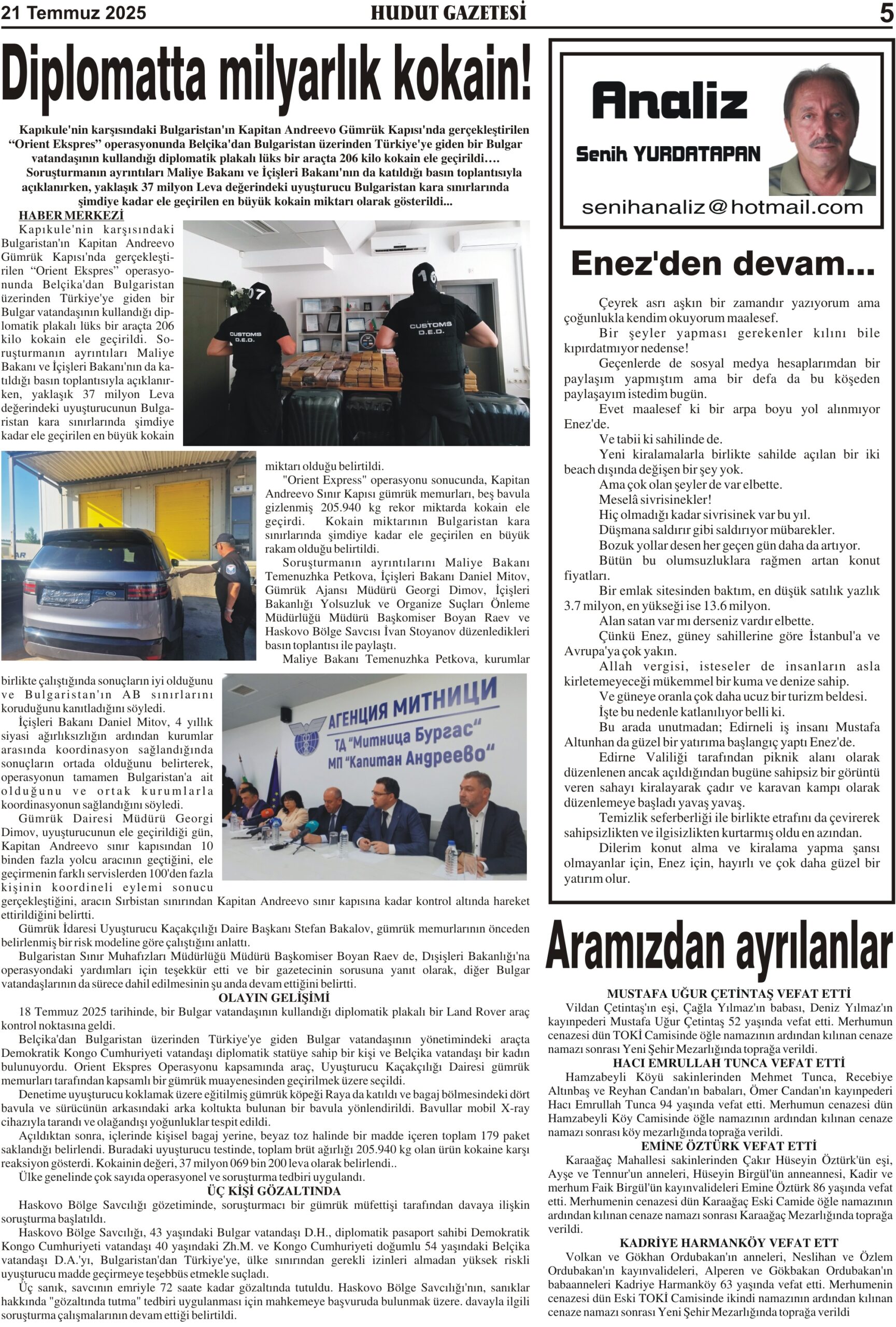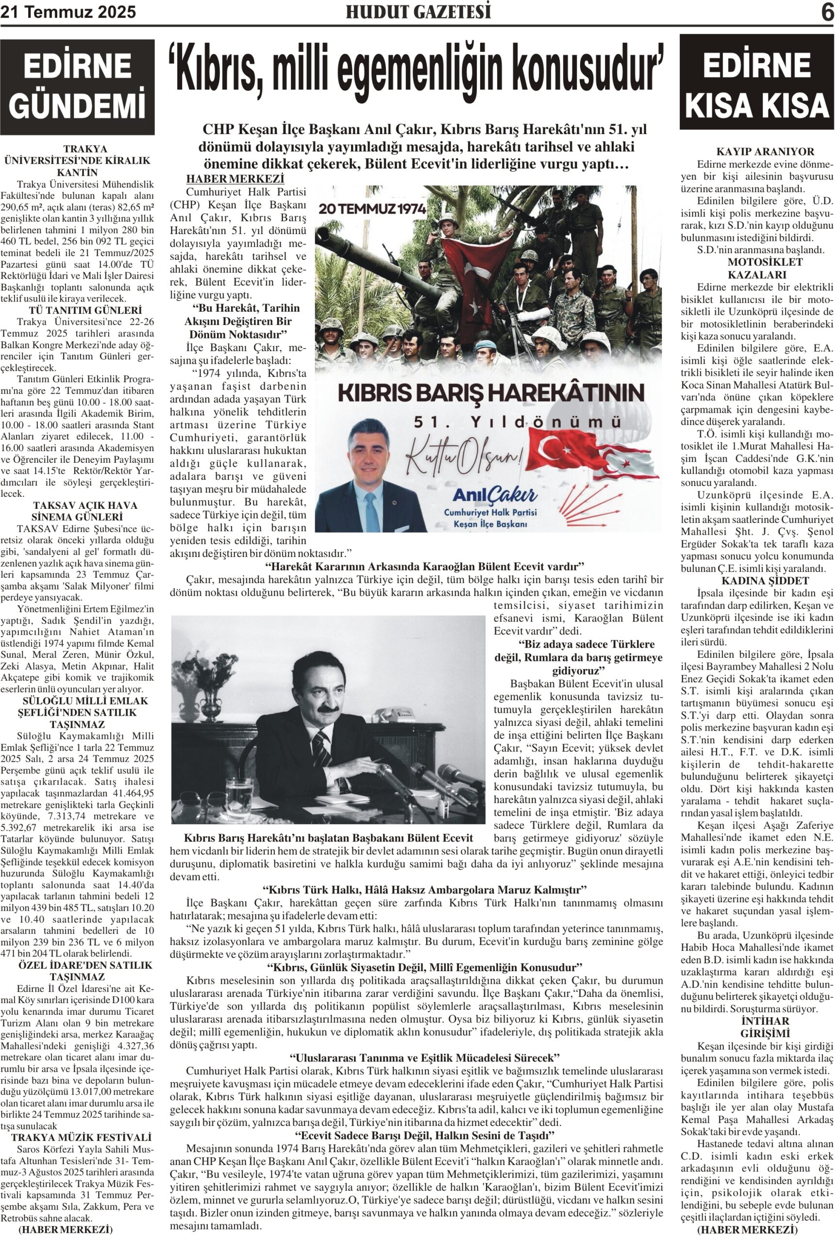 21 Temmuz 2025 Pazartesi Hudut Gazetesi