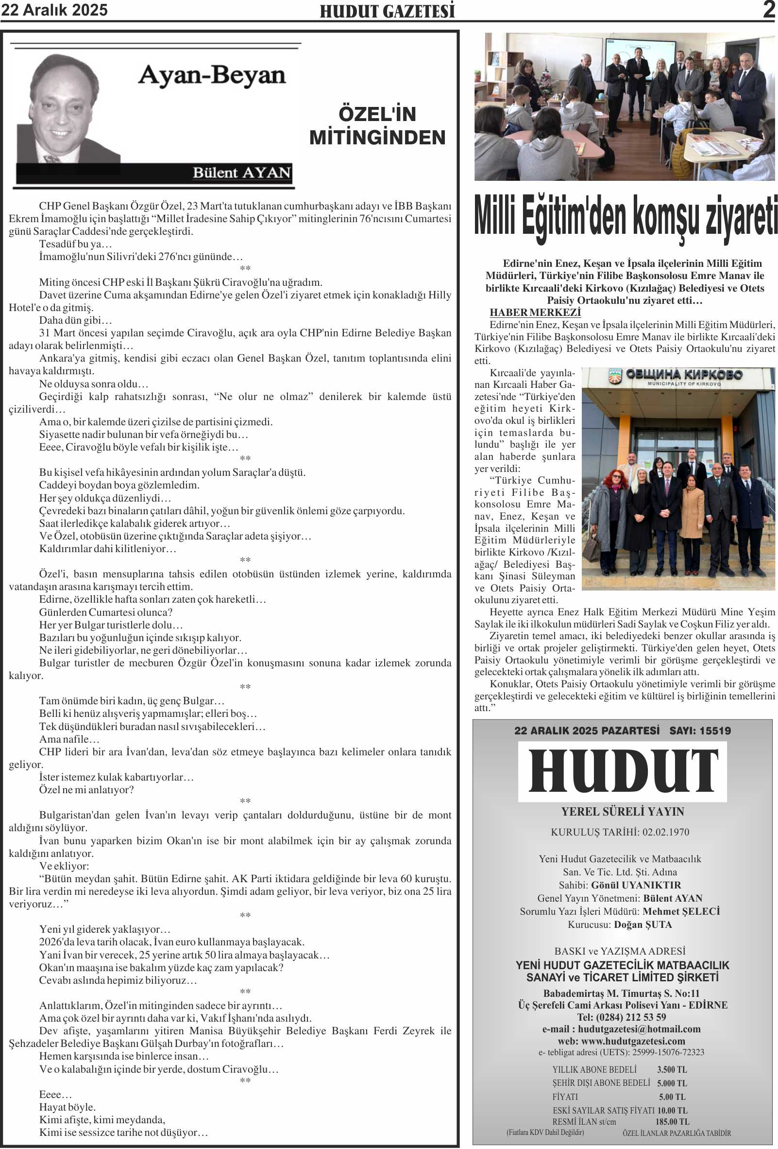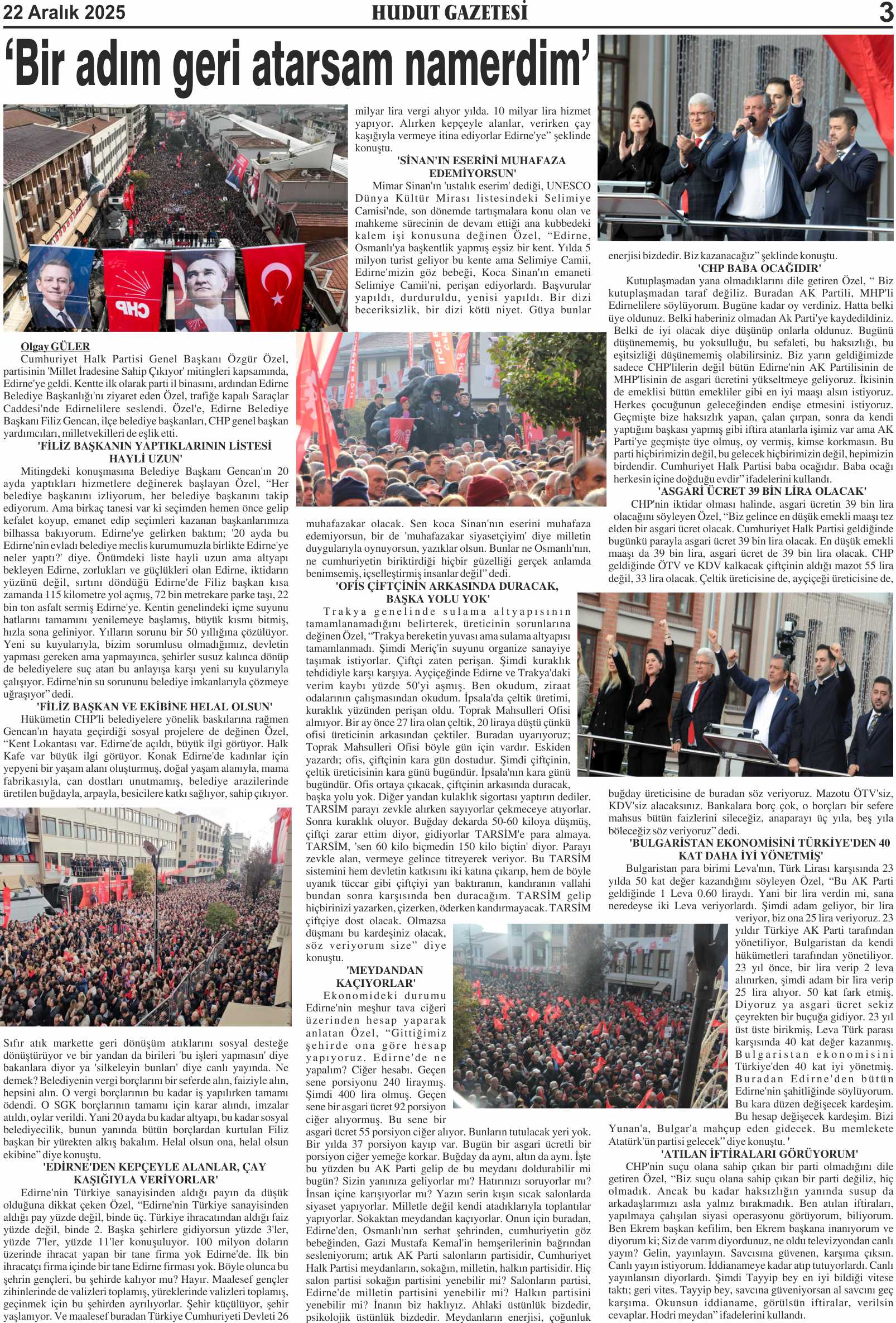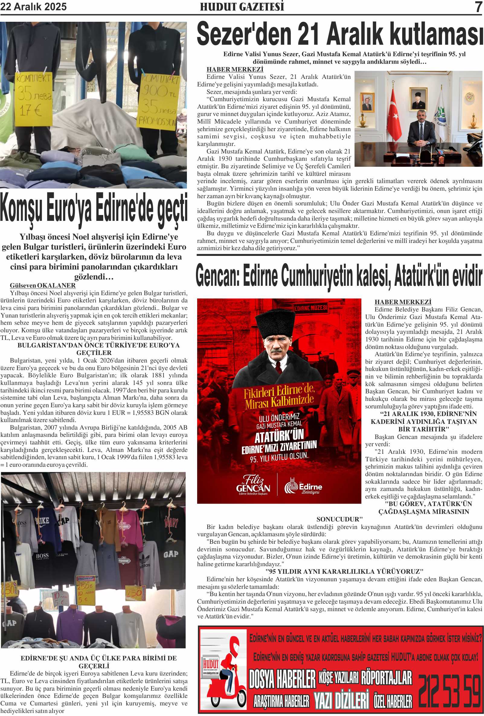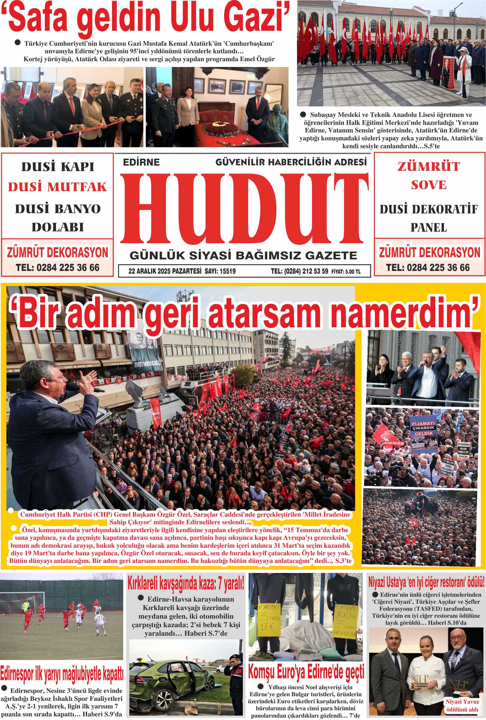 22 Aralık 2025 Pazartesi Hudut Gazetesi