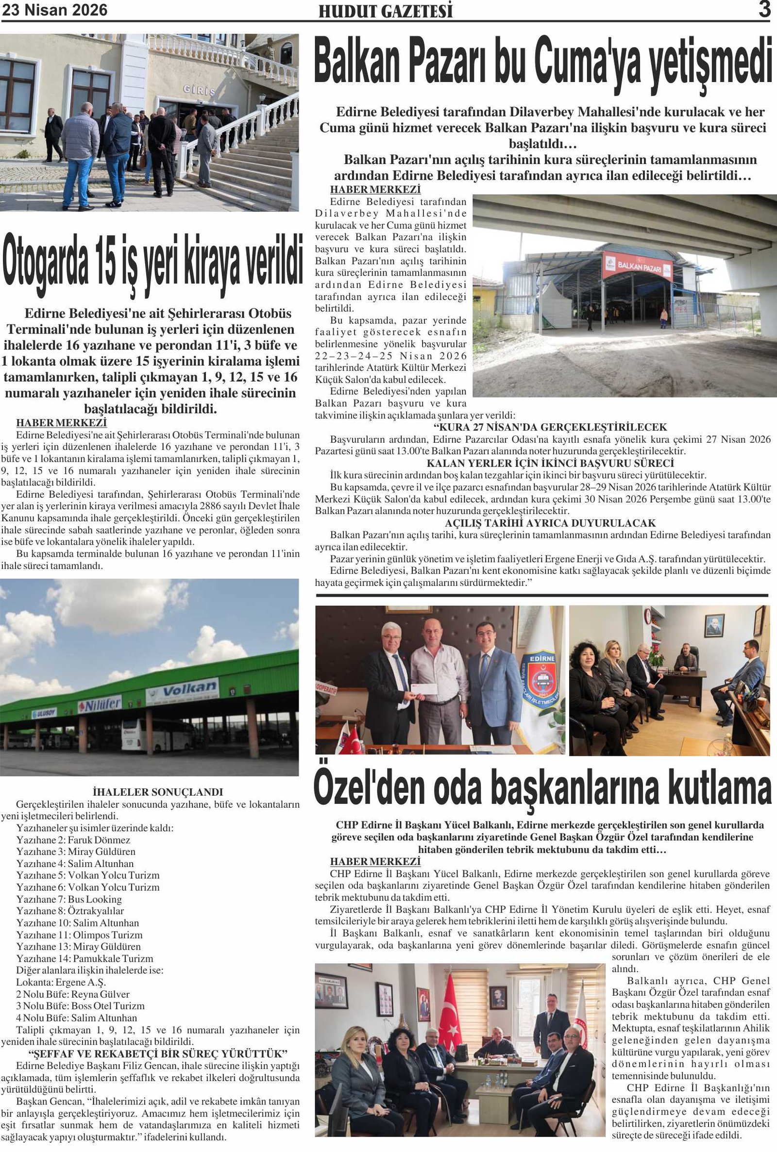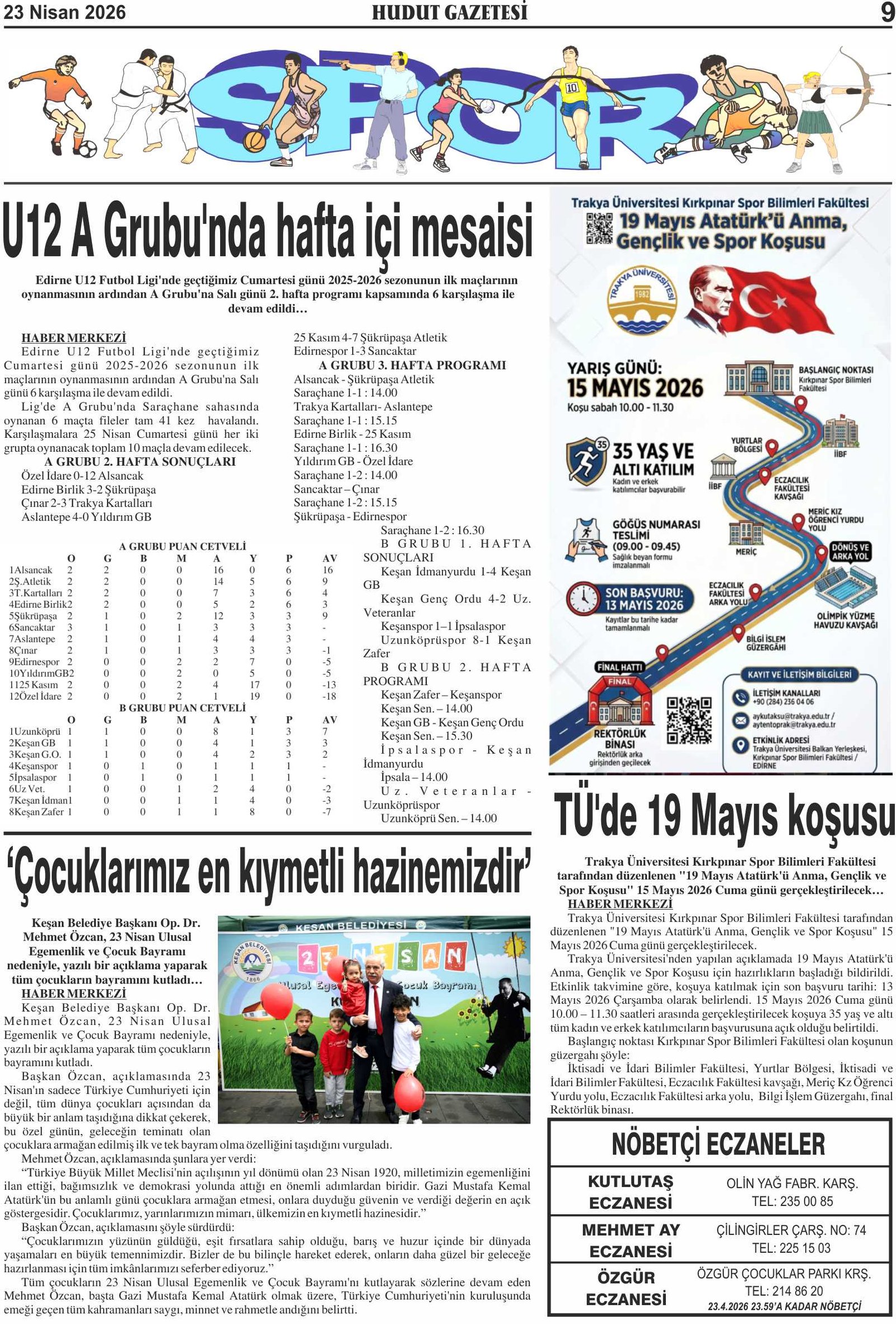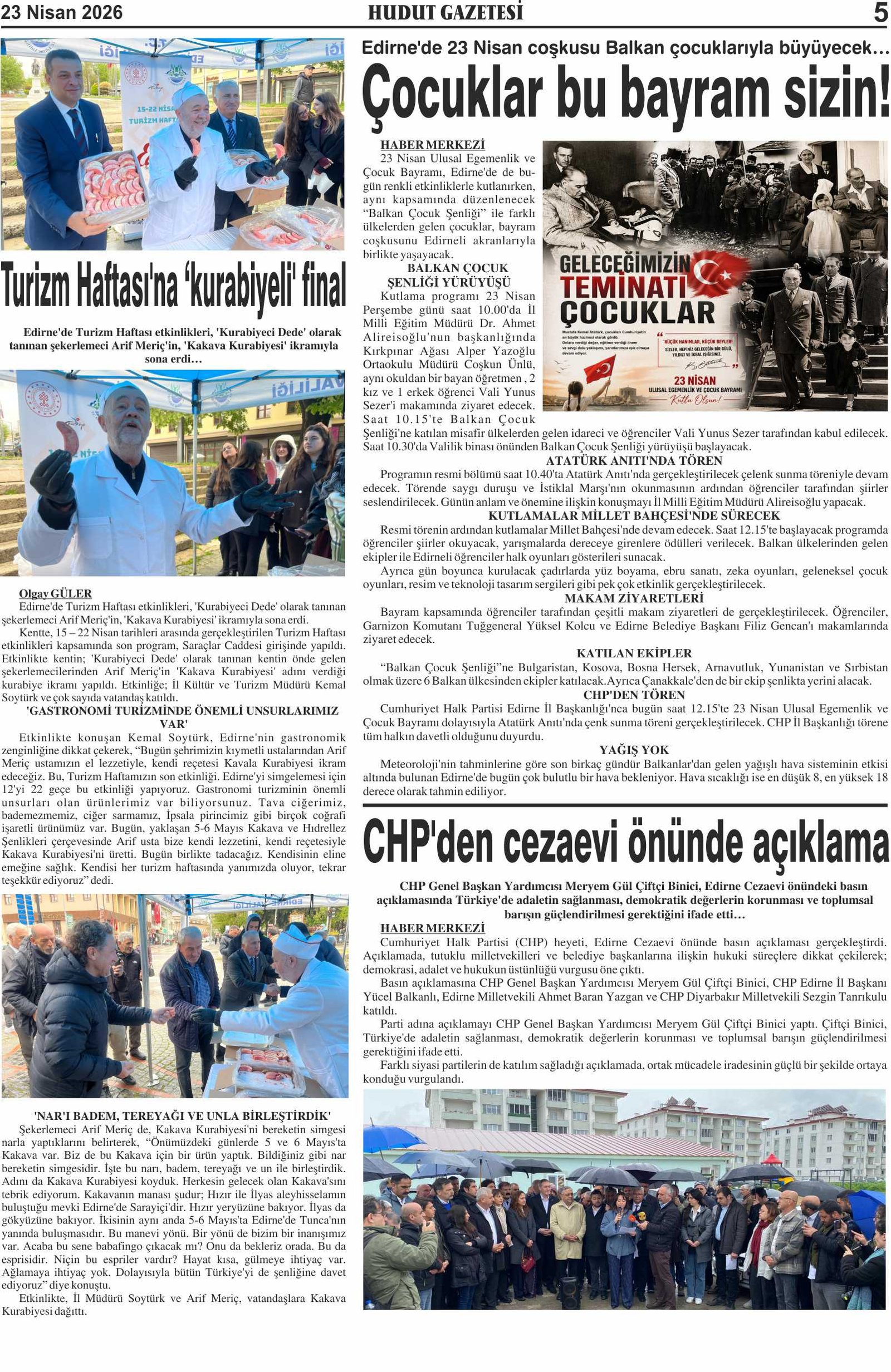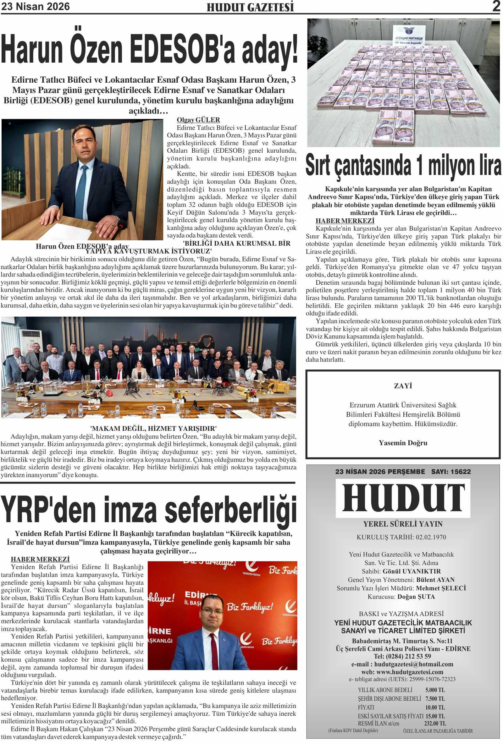 23 Nisan 2026 Perşembe Hudut Gazetesi