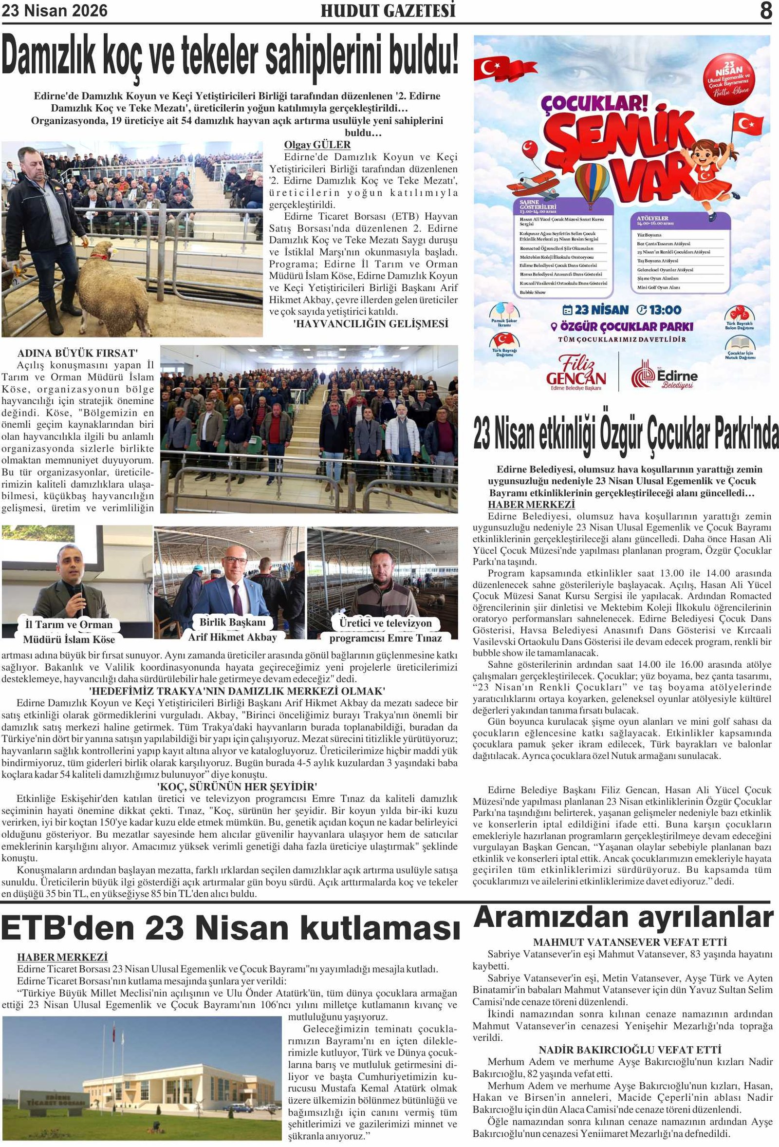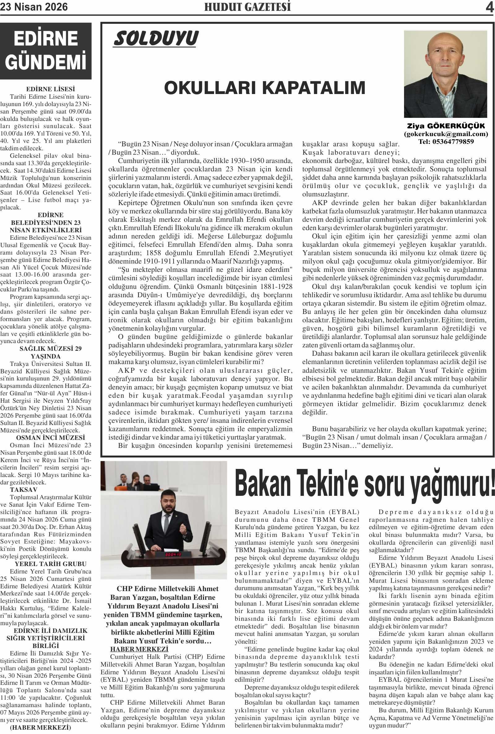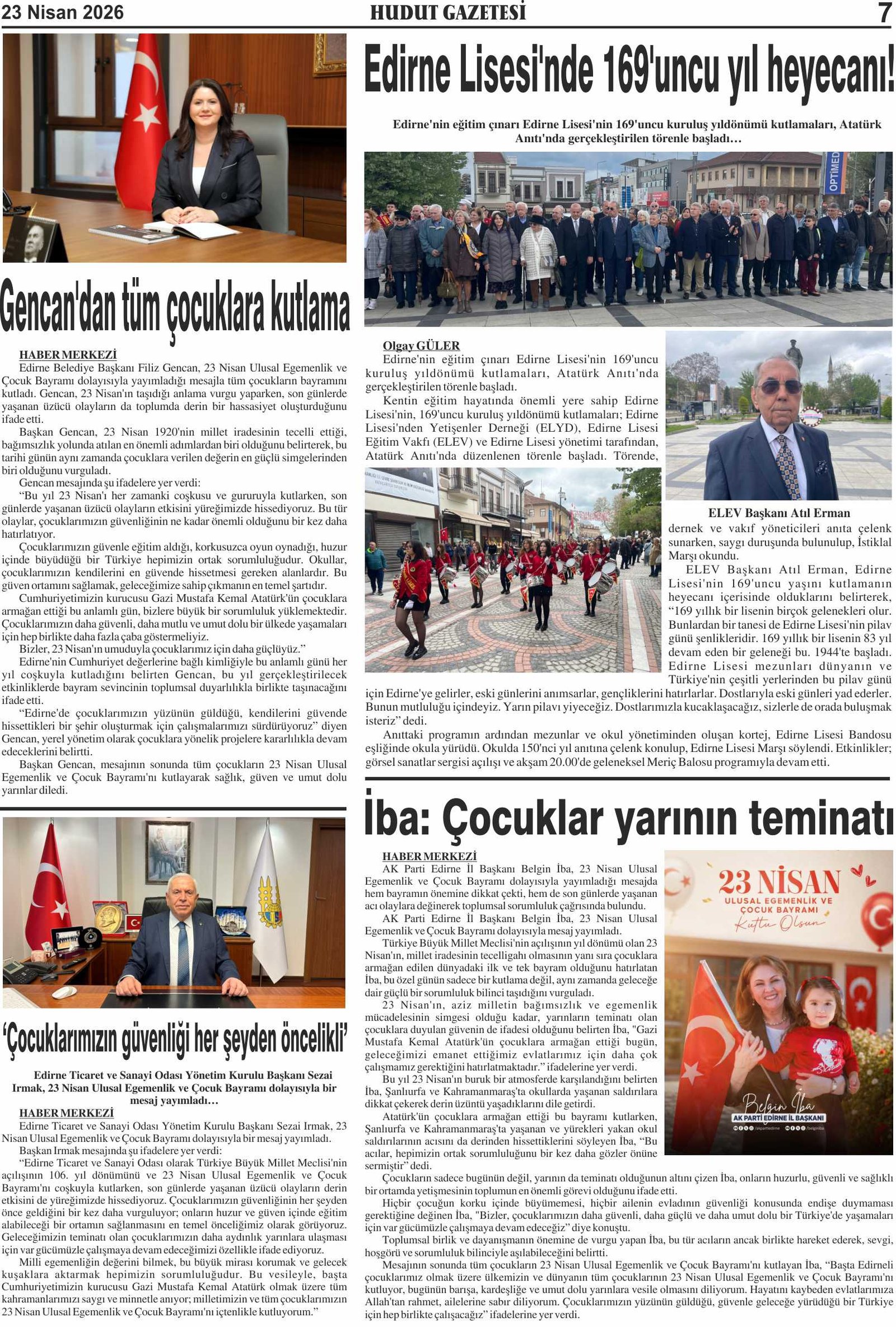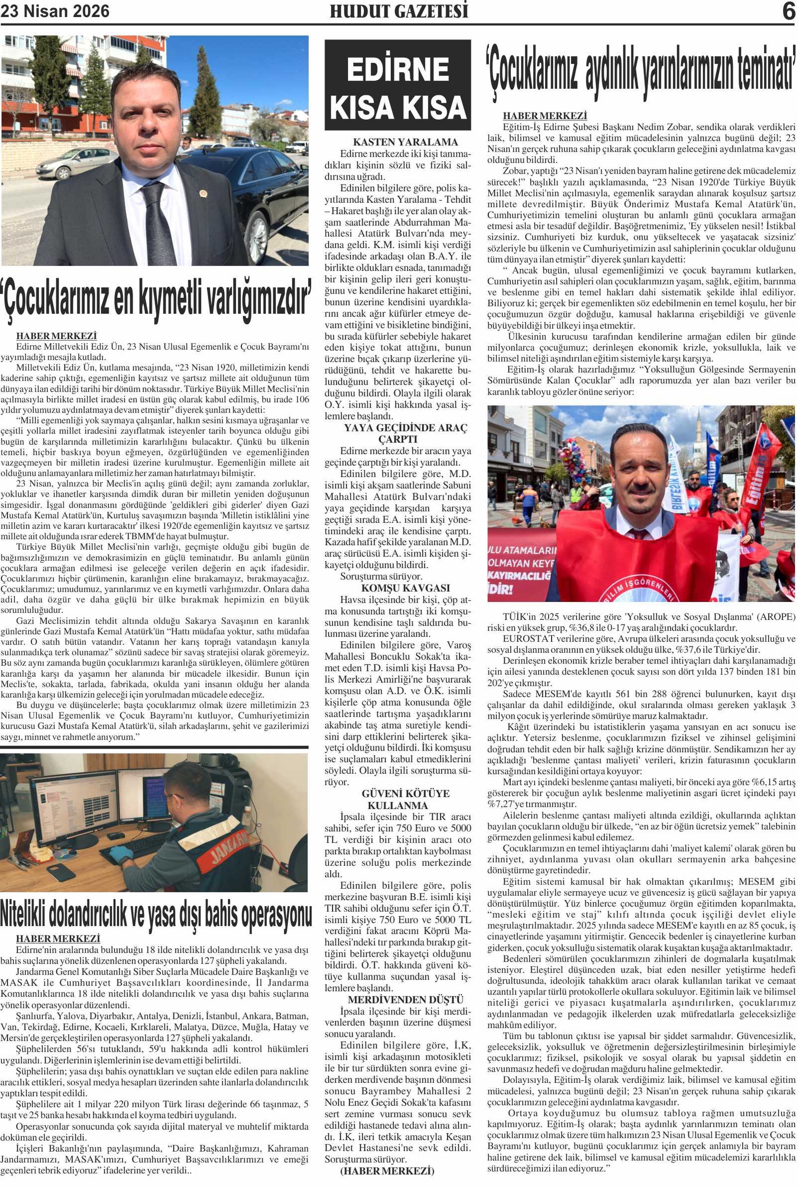 23 Nisan 2026 Perşembe Hudut Gazetesi