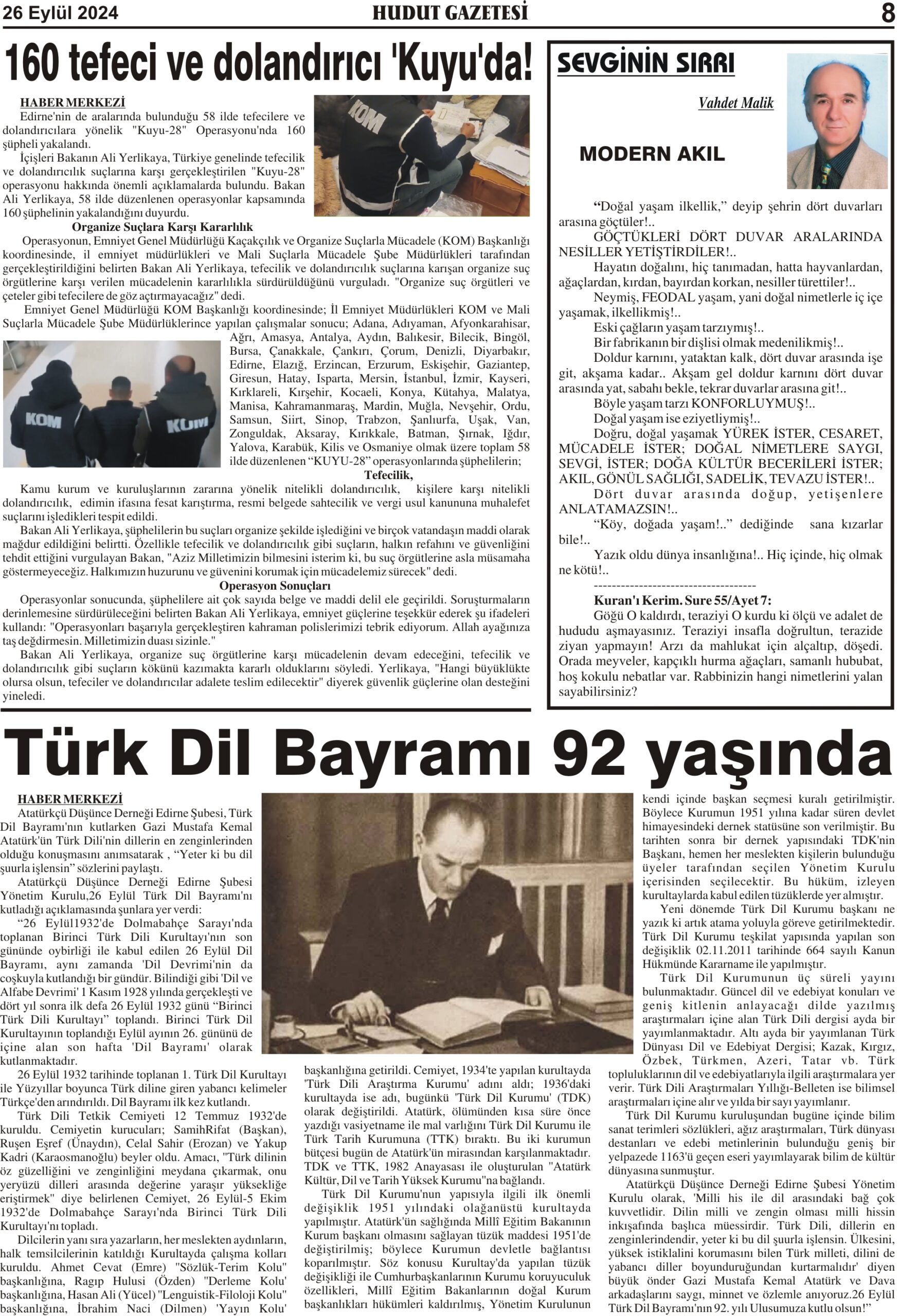 28 Ocak 2026 Çarşamba Hudut Gazetesi