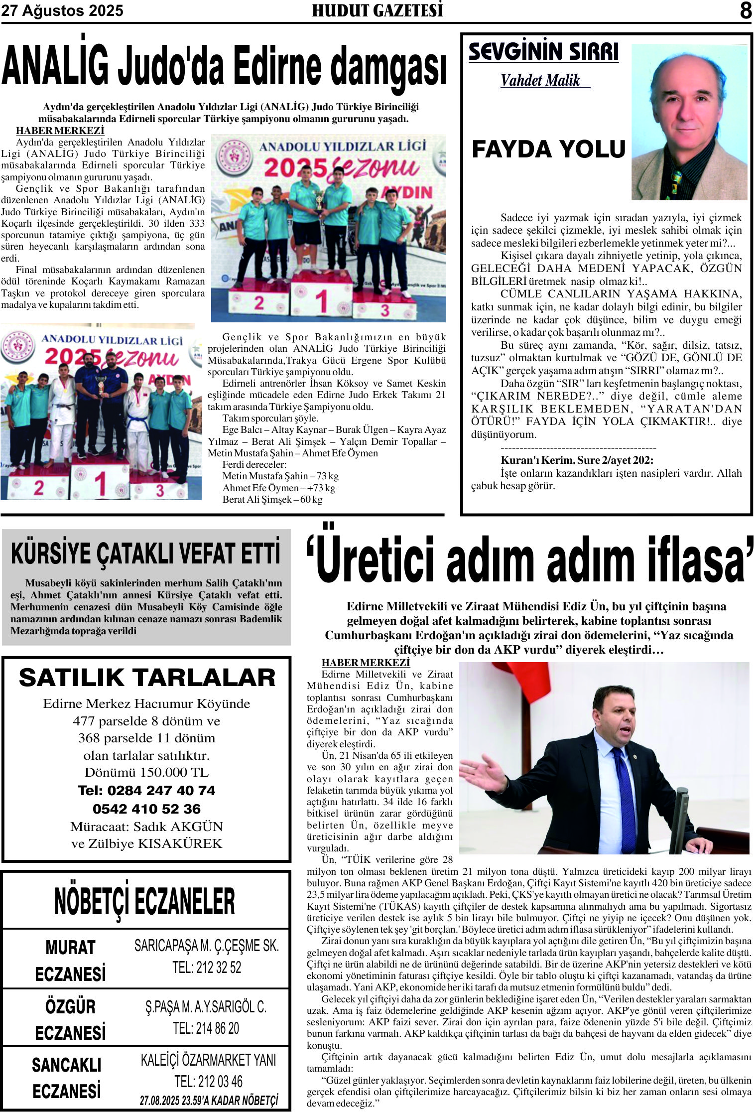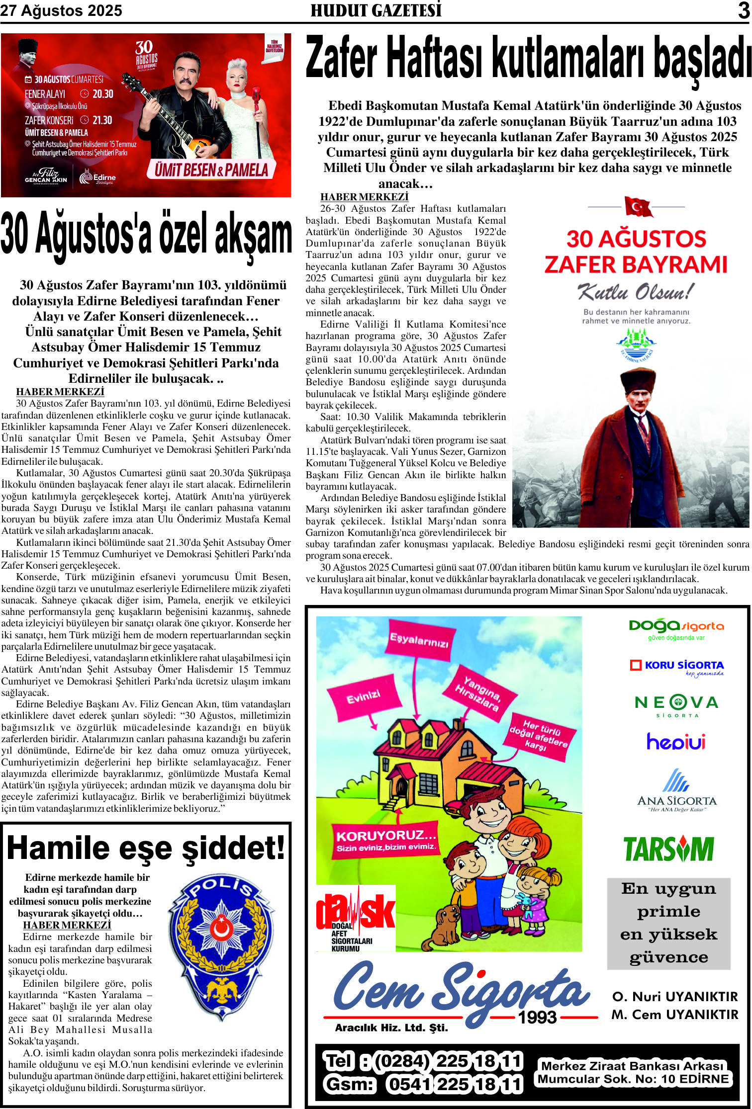 27 Ağustos 2025 Çarşamba Hudut Gazetesi