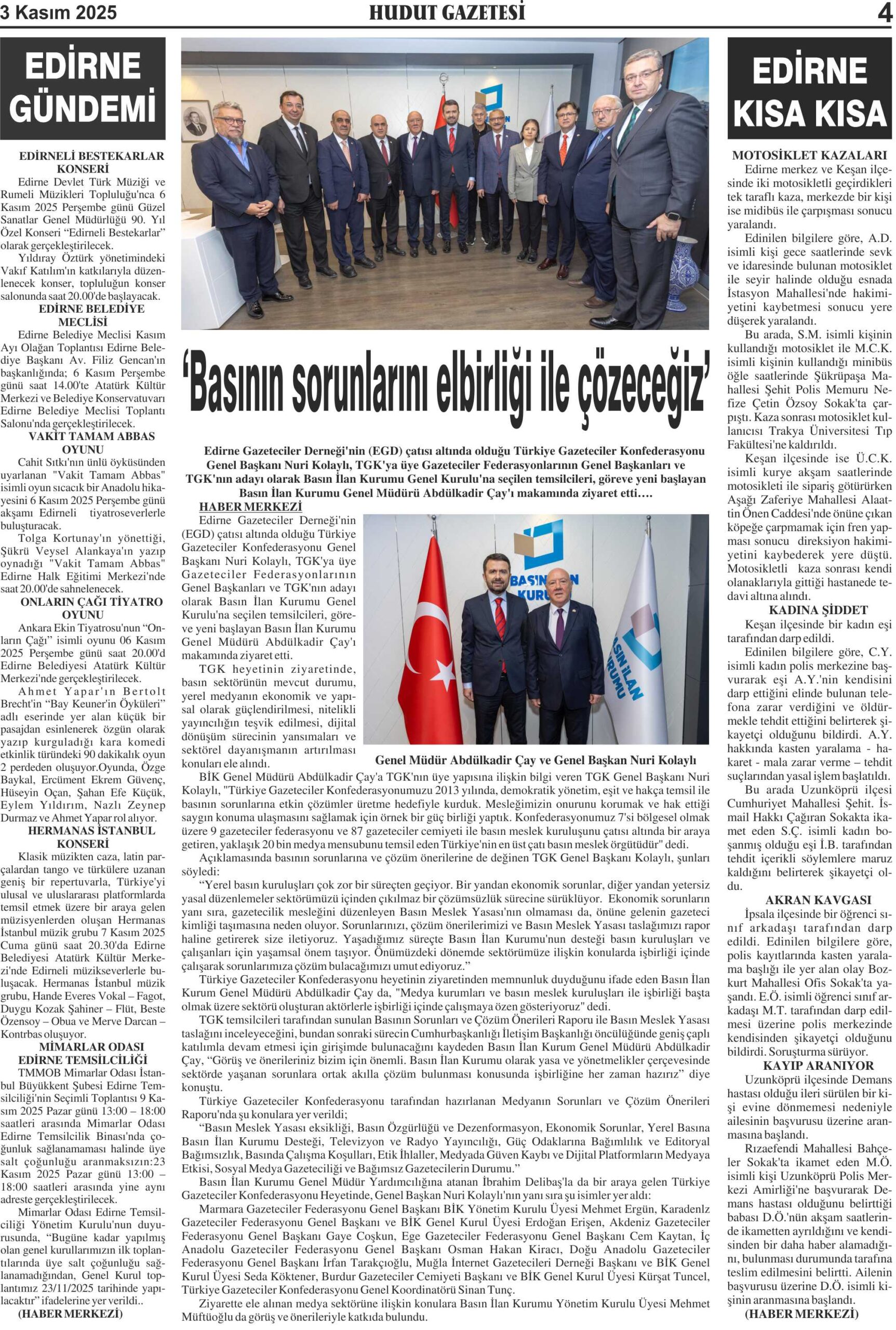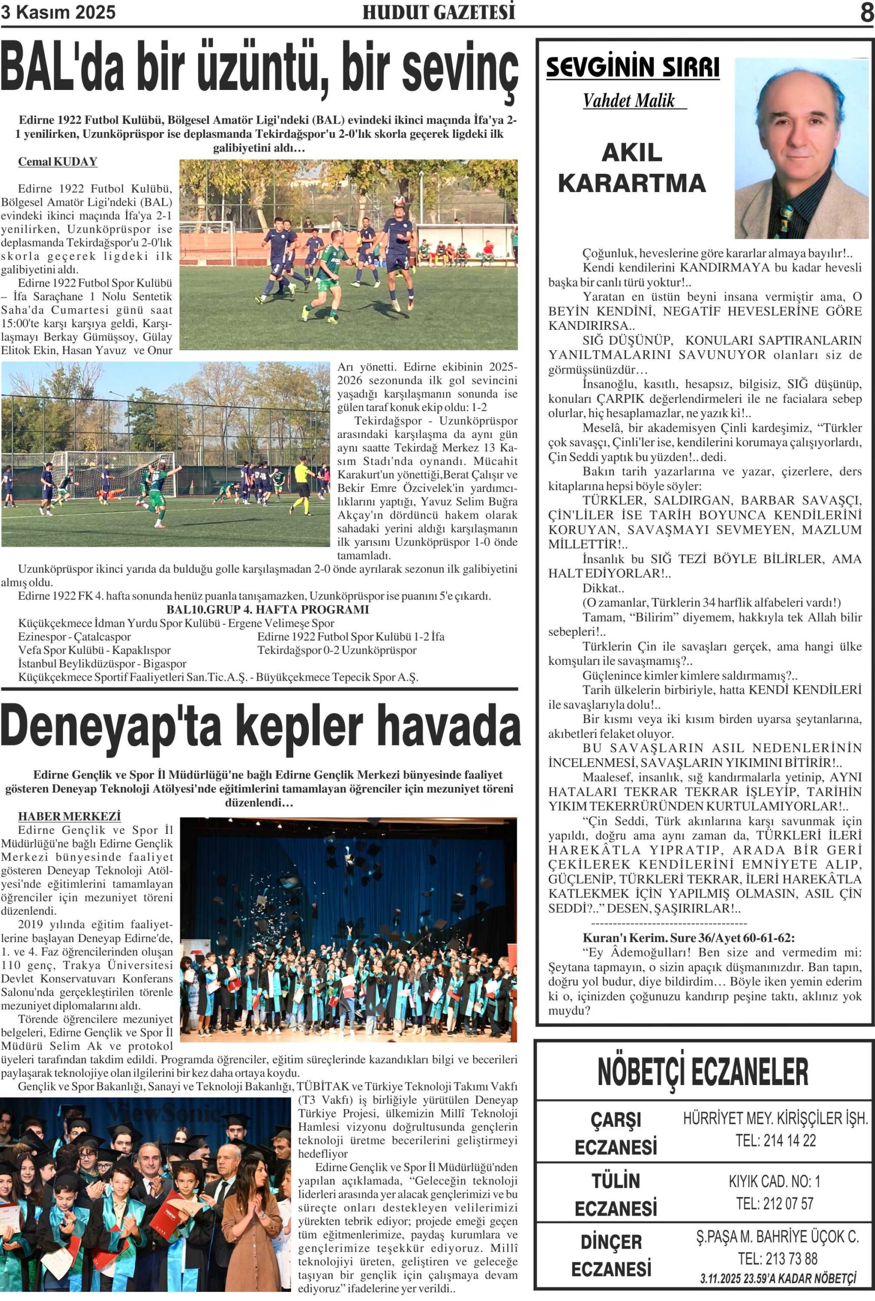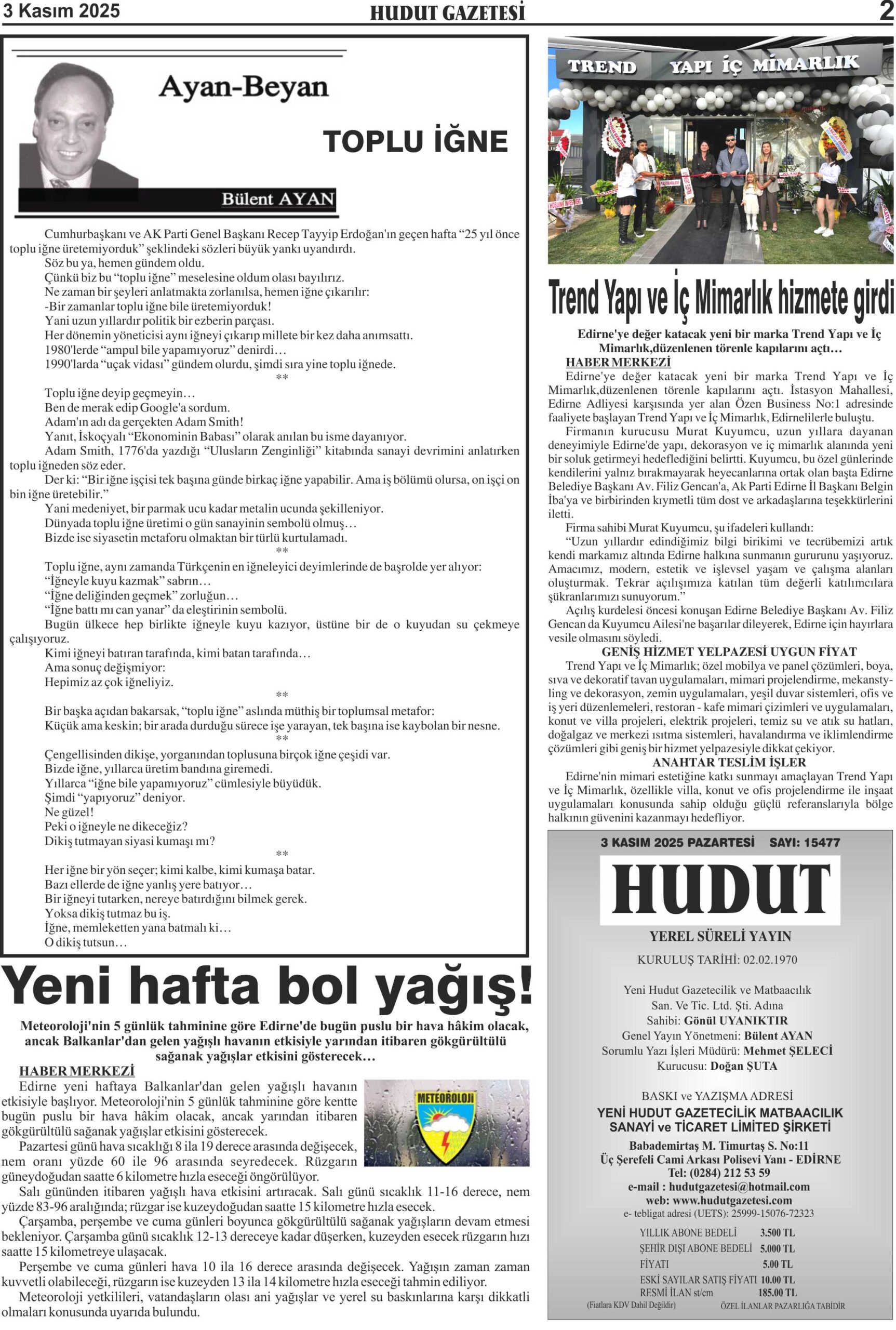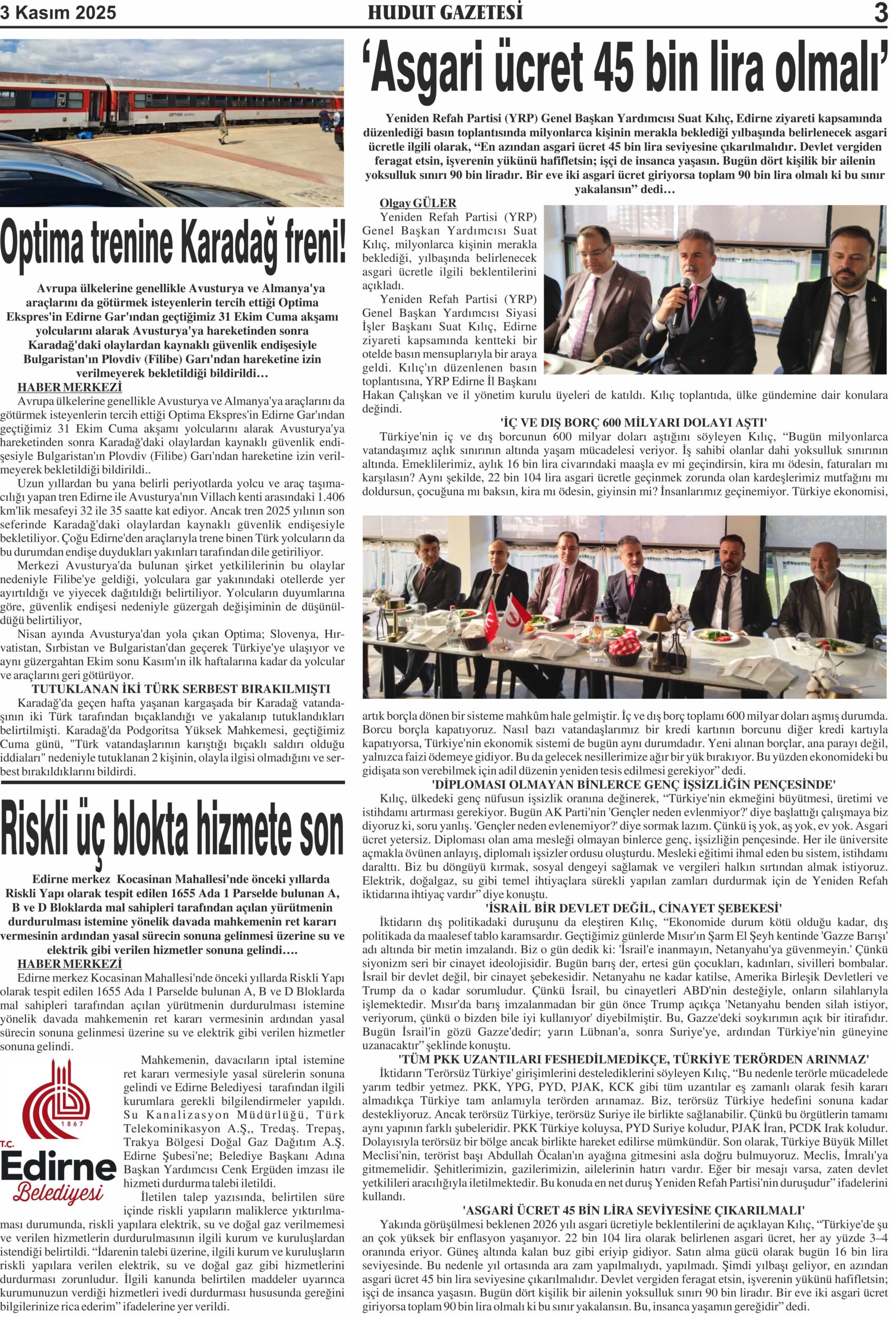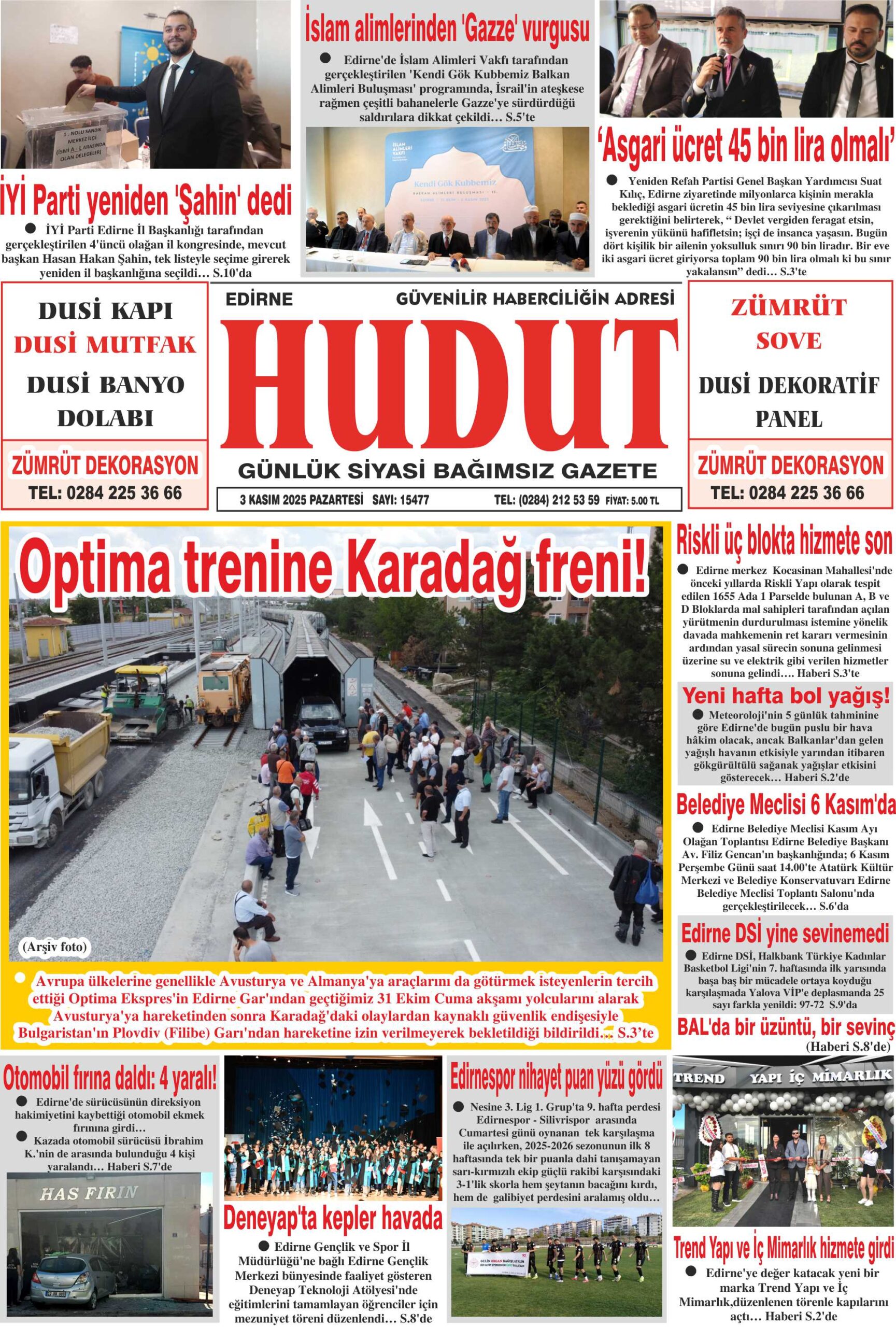 3 Kasım 2025 Pazartesi Hudut Gazetesi