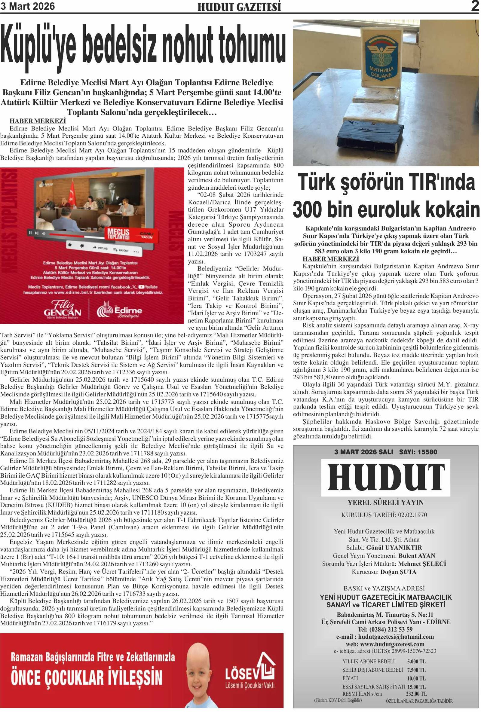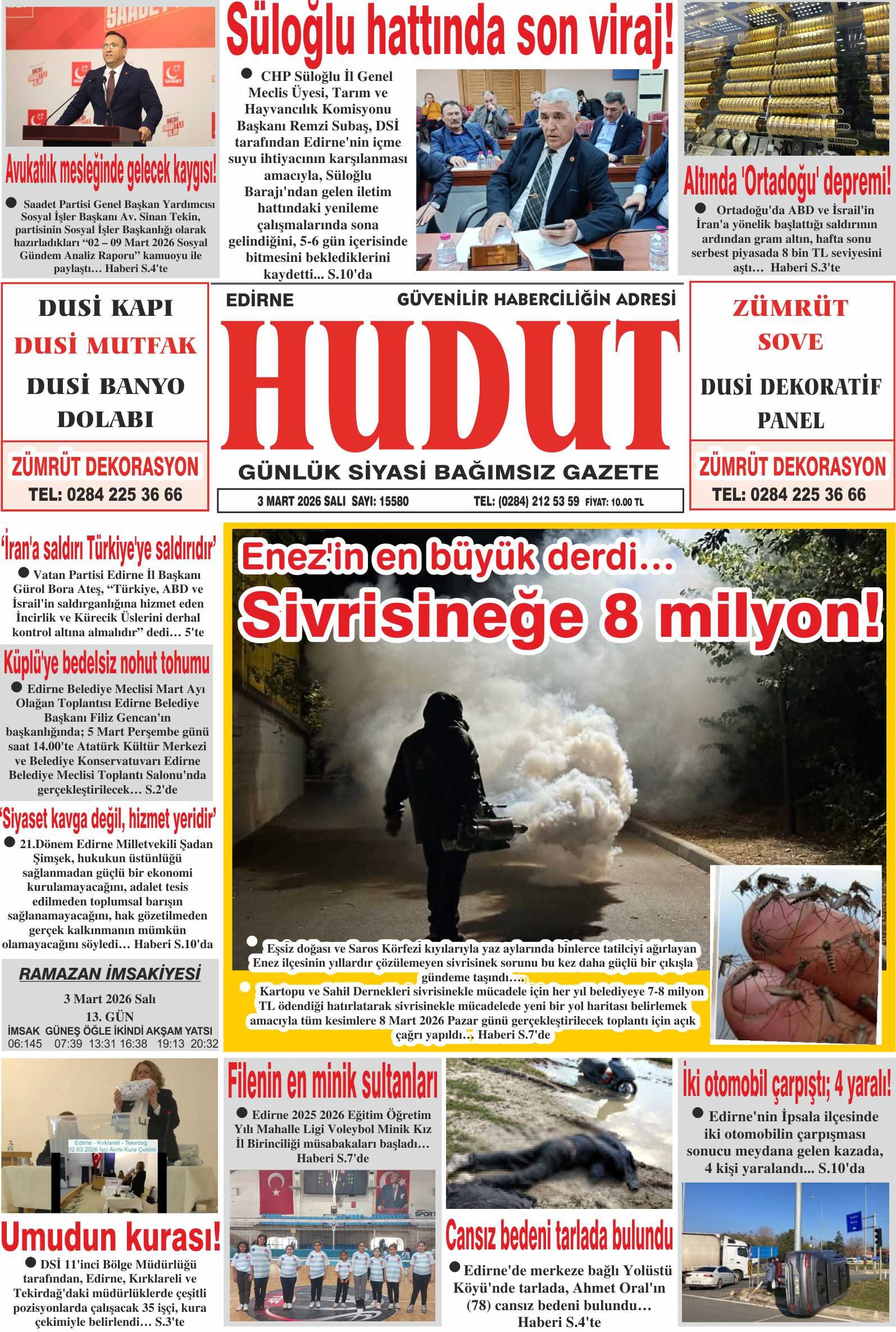 2 Mart 2026 Pazartesi Hudut Gazetesi