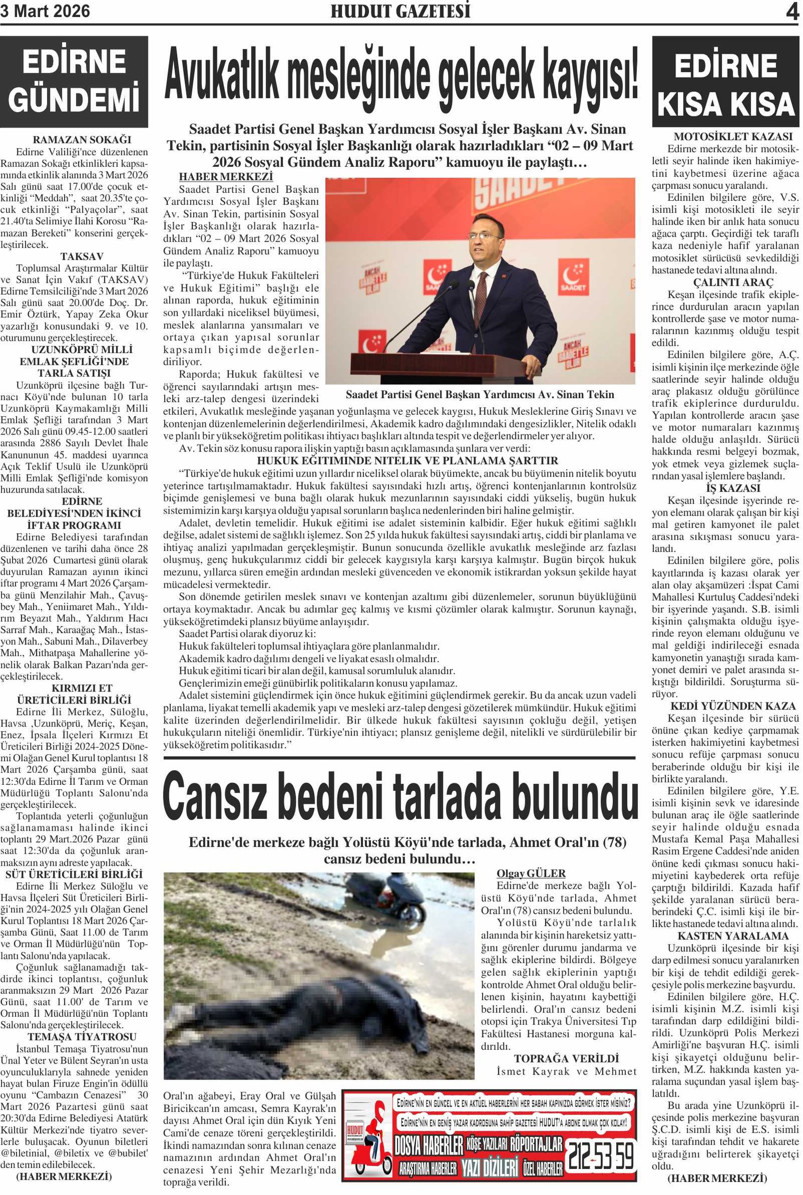 4 Mart 2026 Çarşamba Hudut Gazetesi