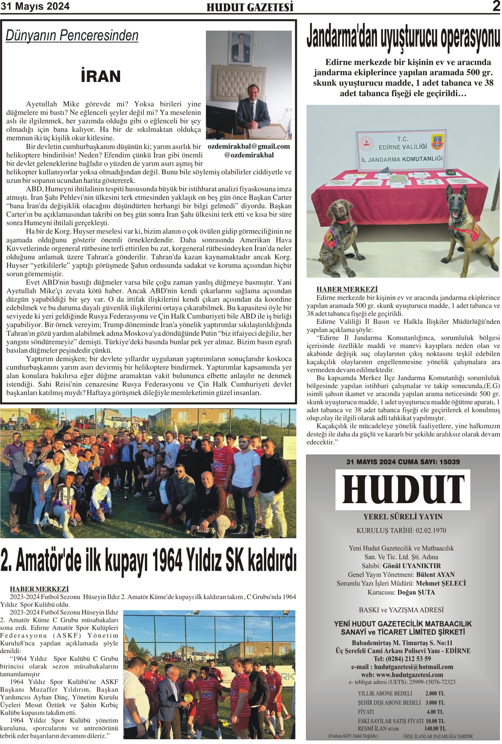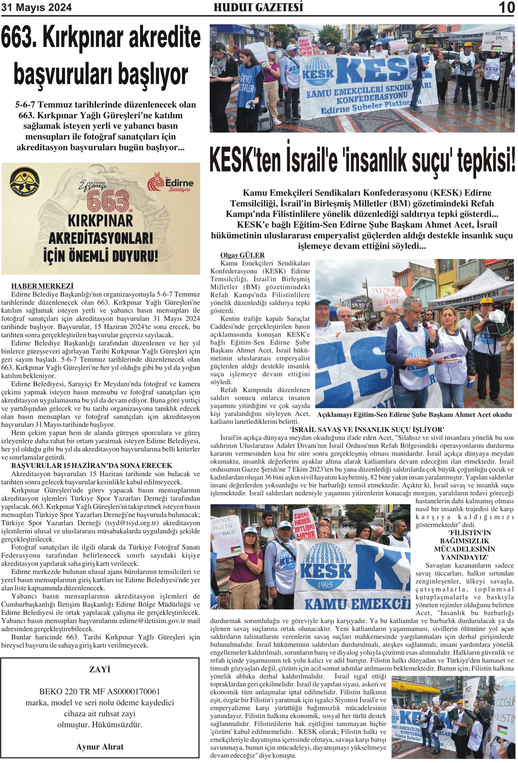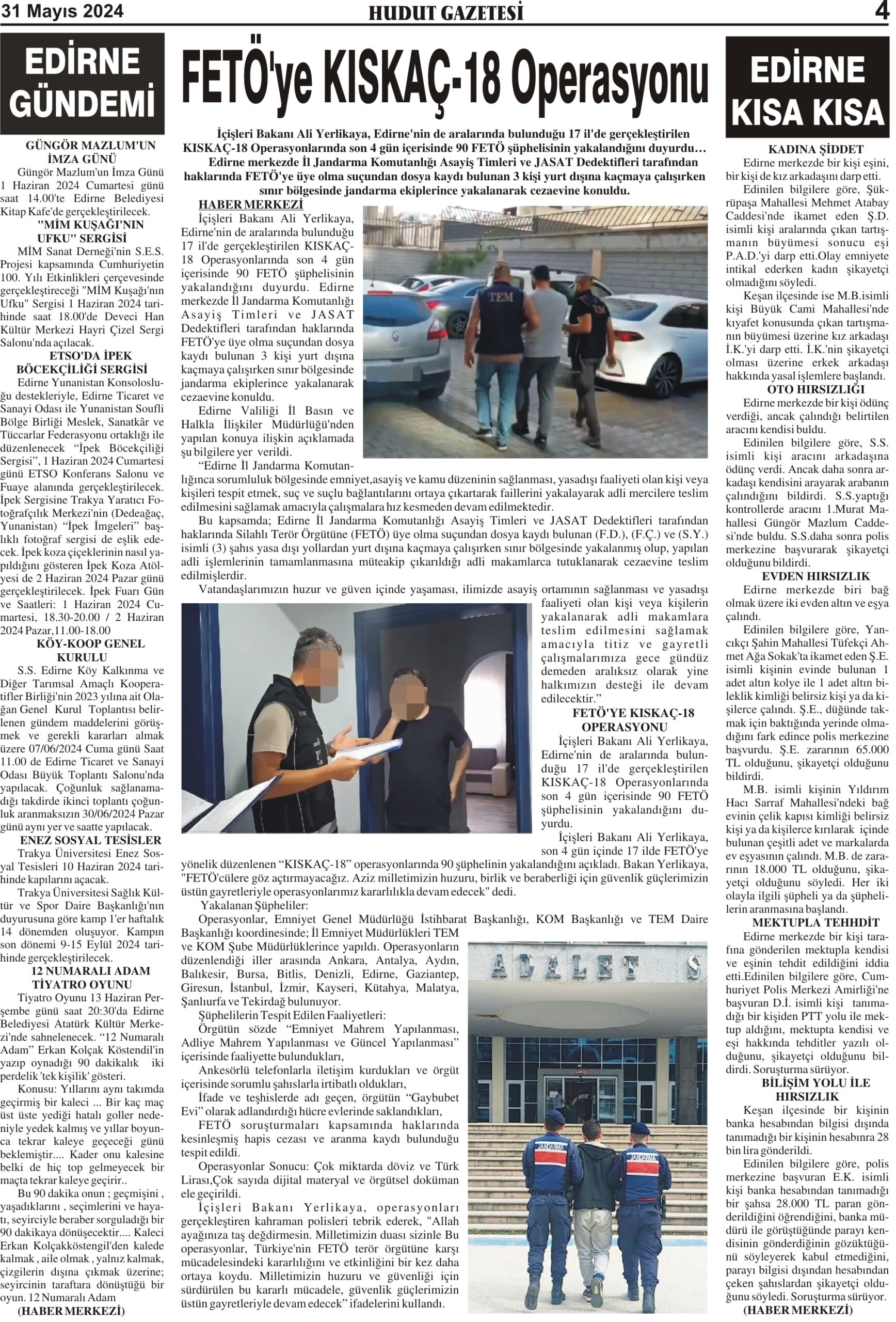 31 Mayıs 2024 Cuma Hudut Gazetesi