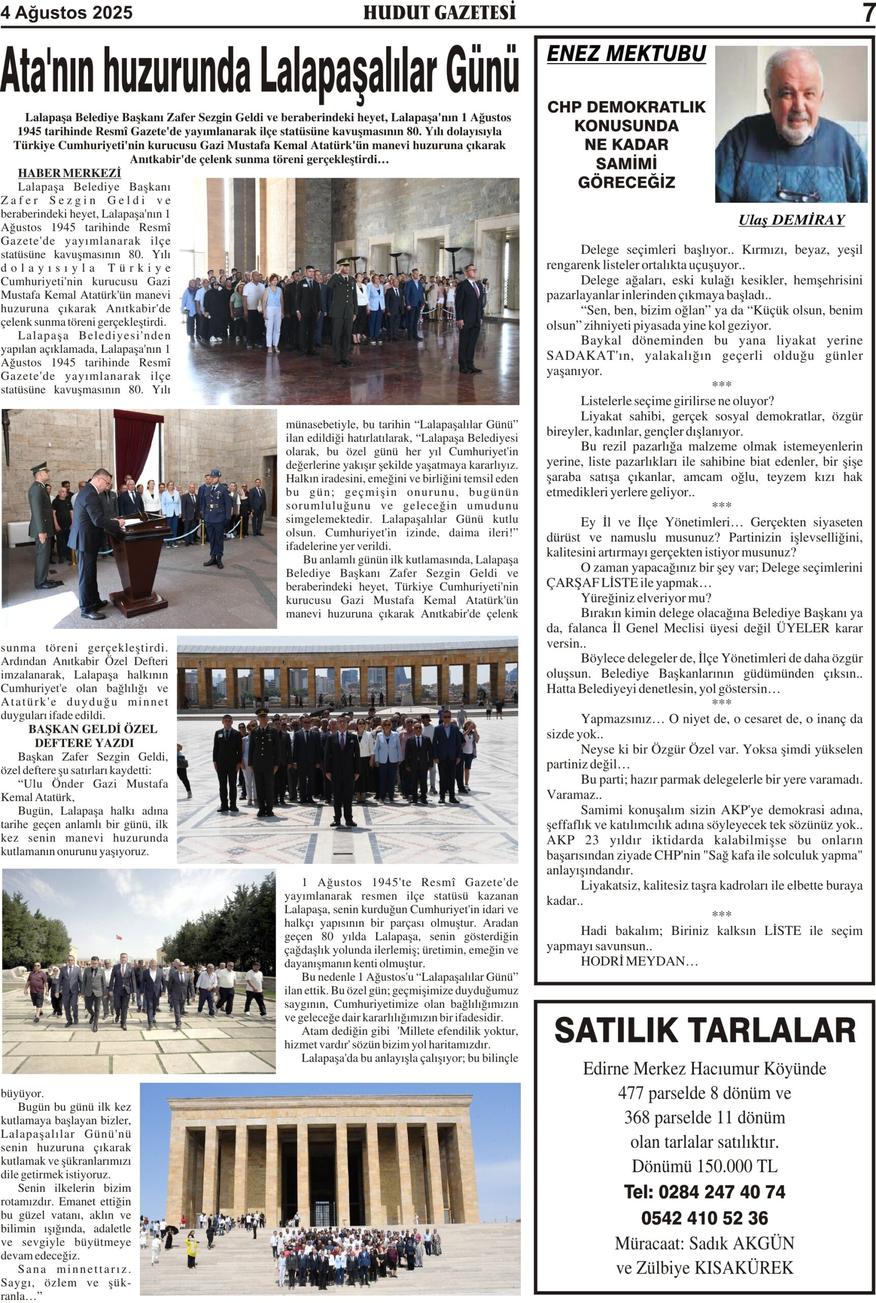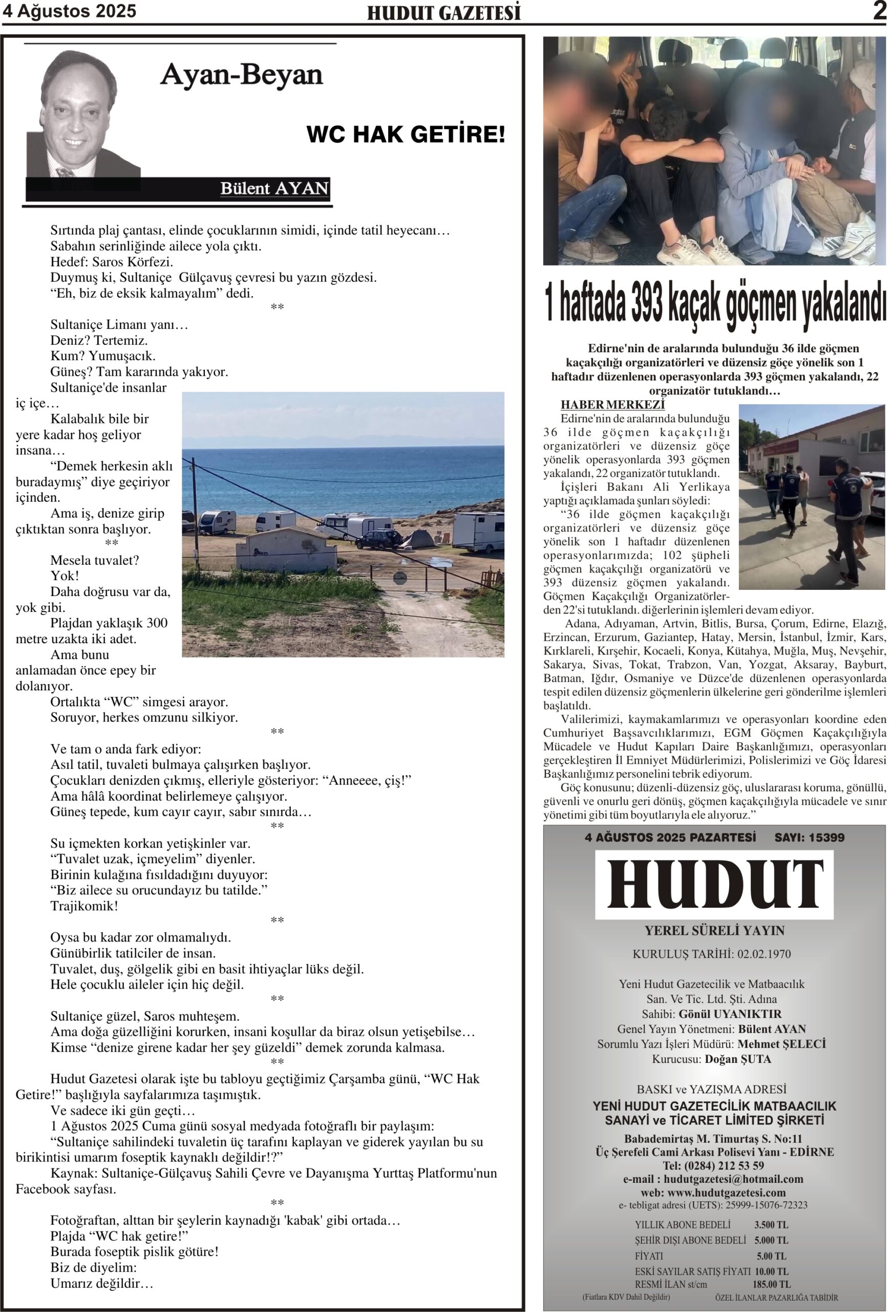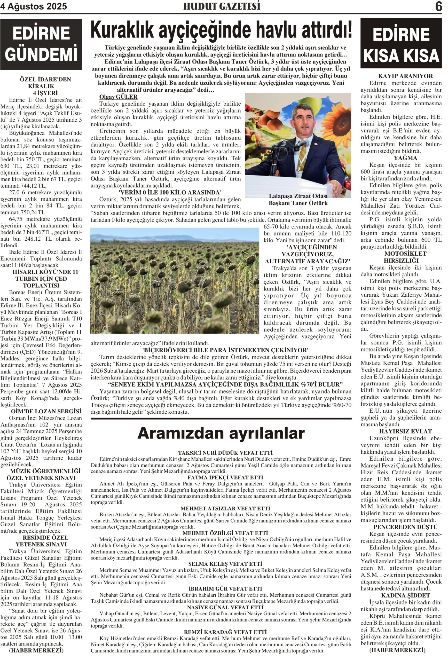 4 Ağustos 2025 Pazartesi Hudut Gazetesi