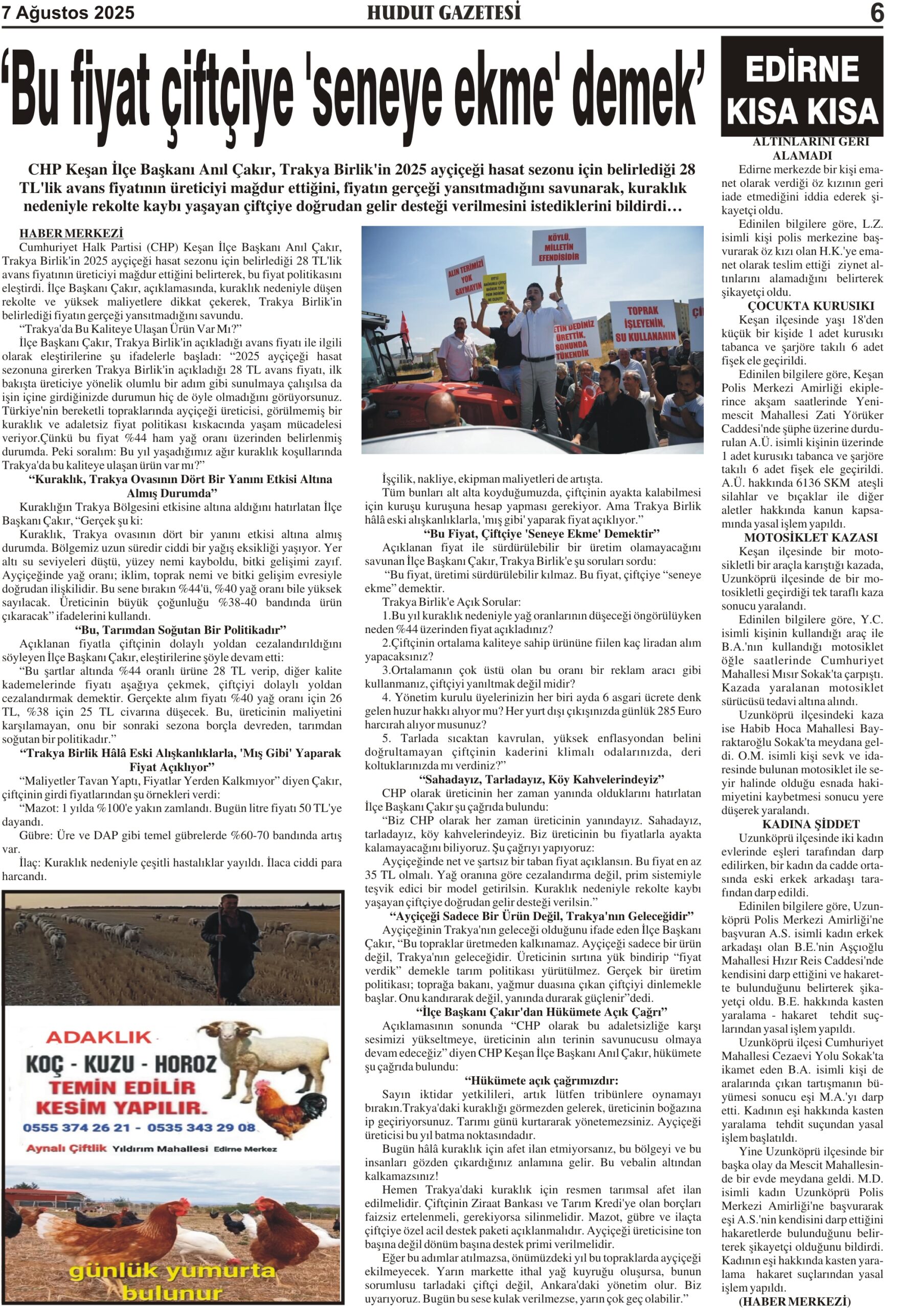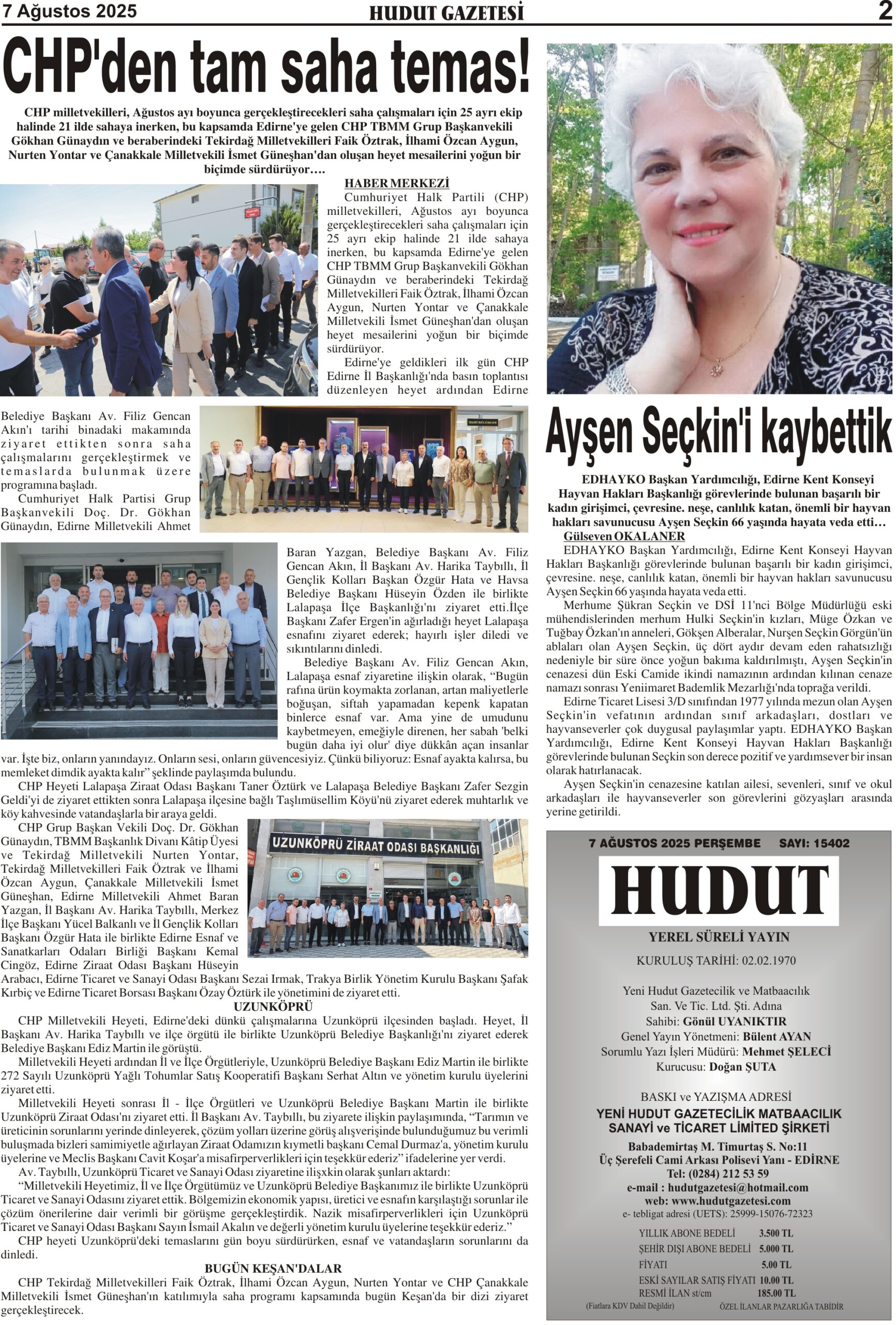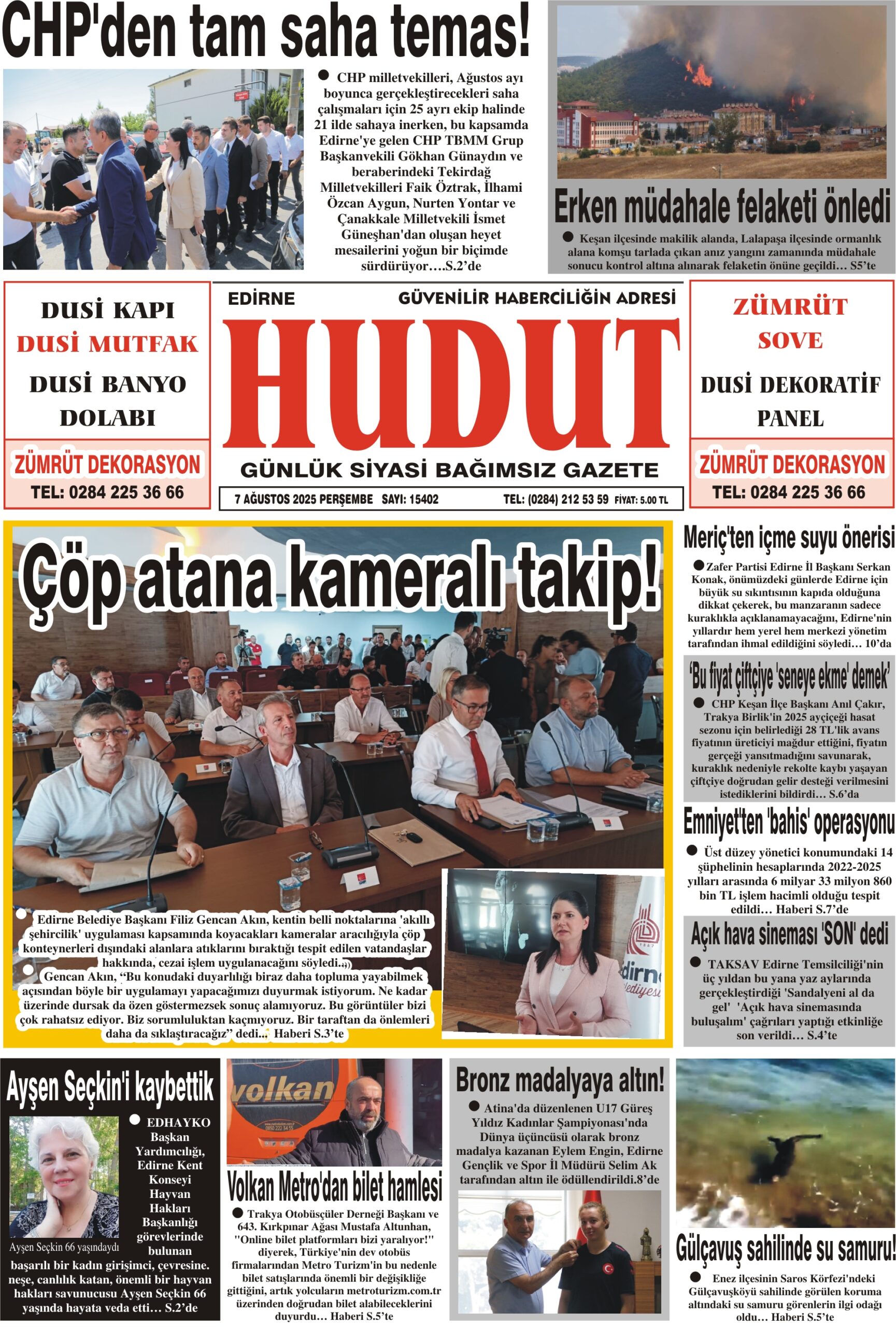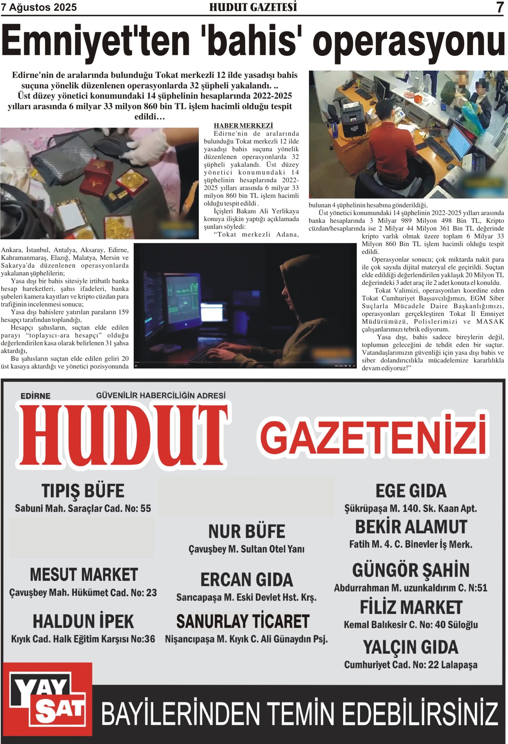 7 Ağustos 2025 Perşembe Hudut Gazetesi