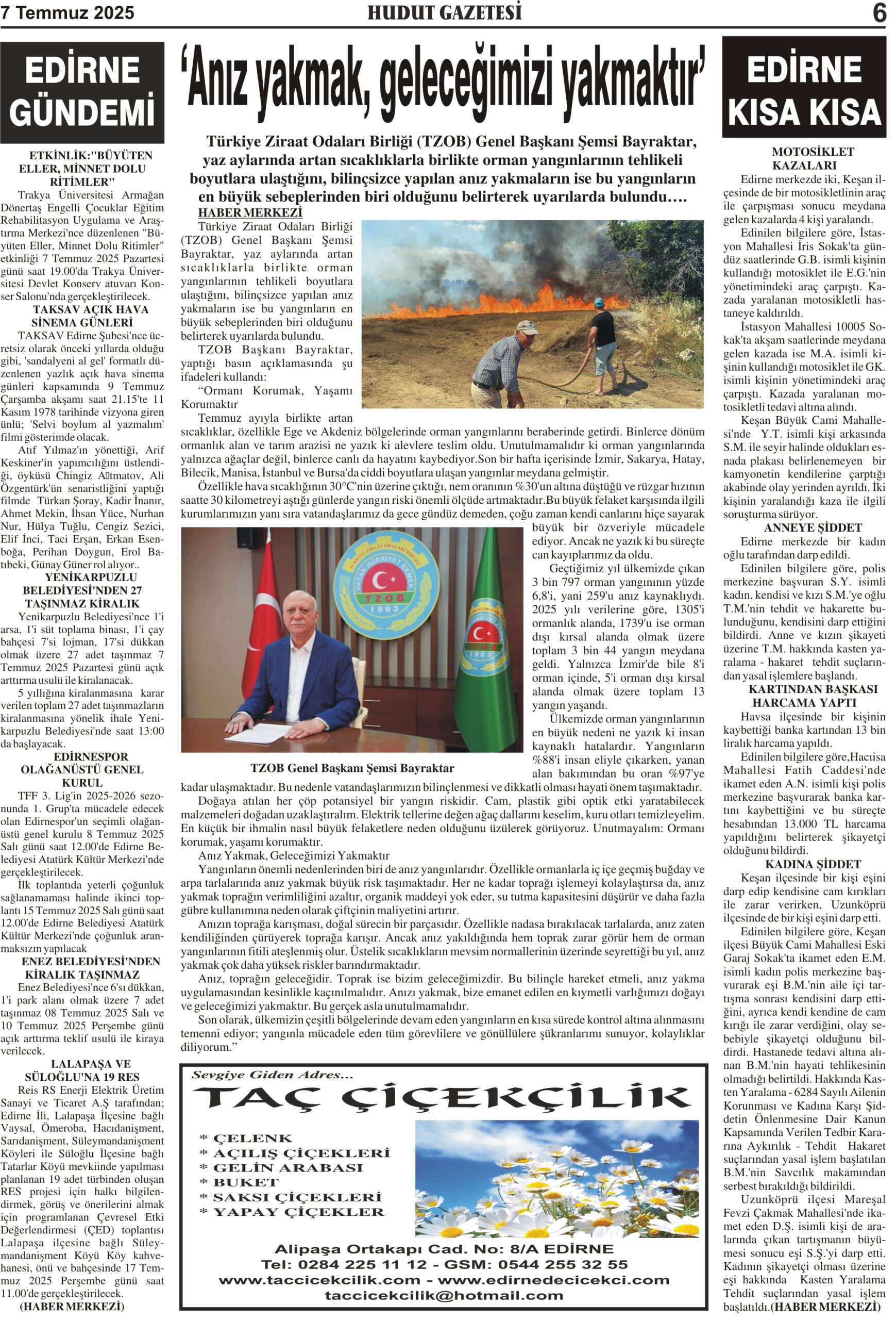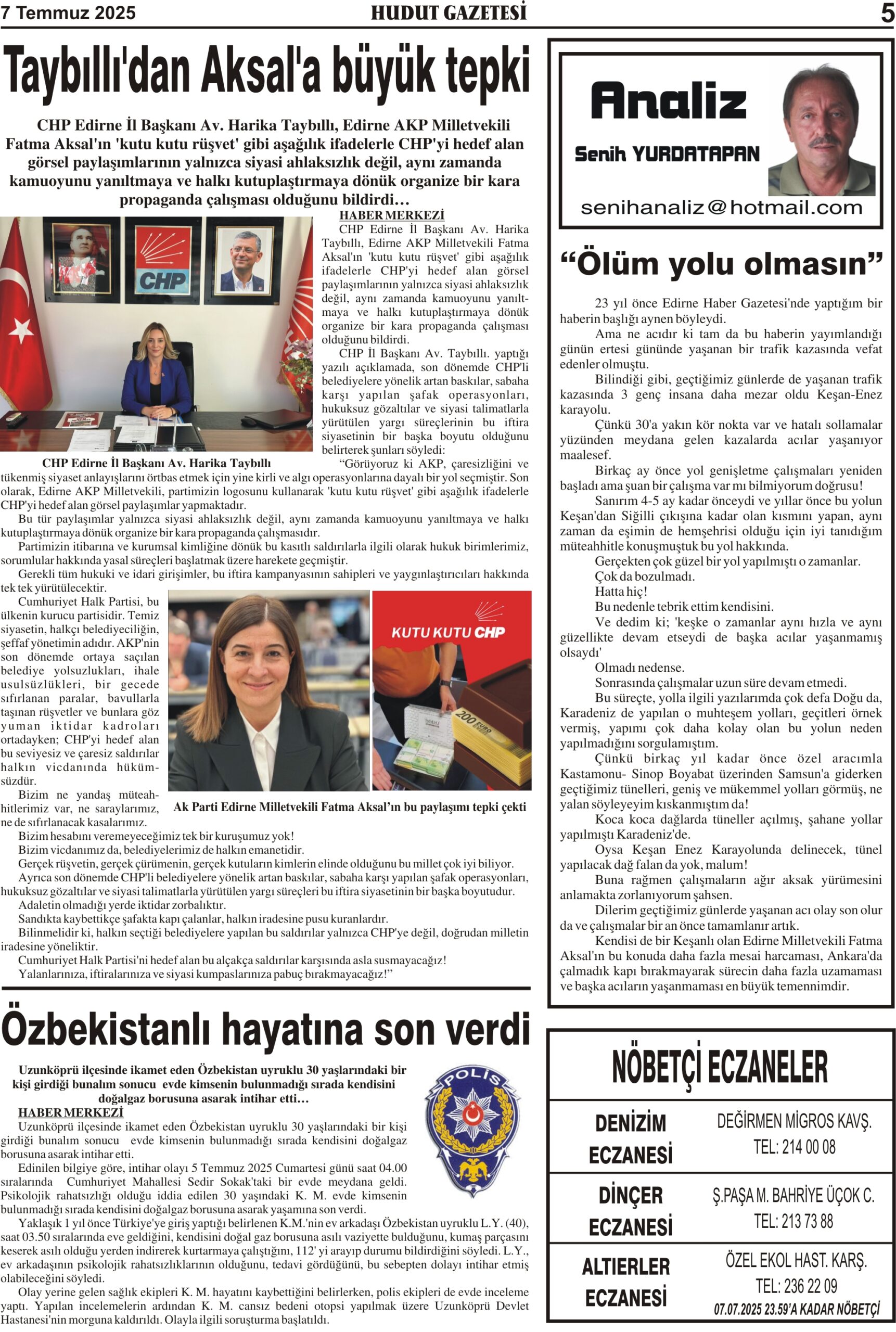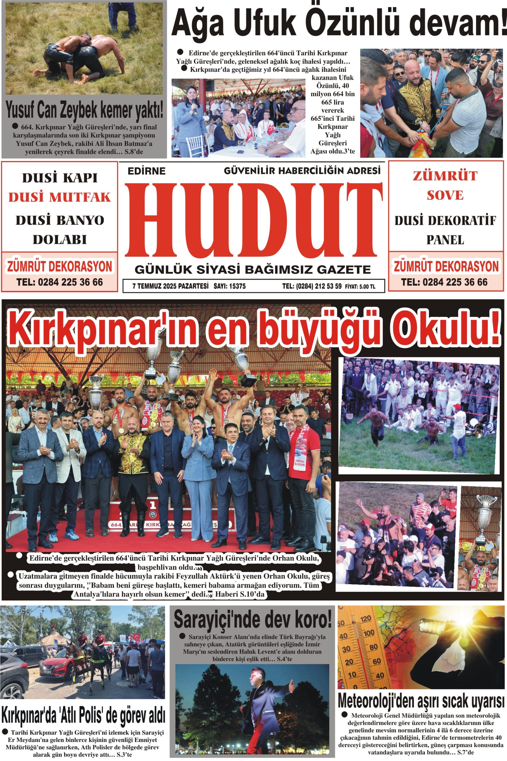 7 Temmuz 2025 Pazartesi Hudut Gazetesi