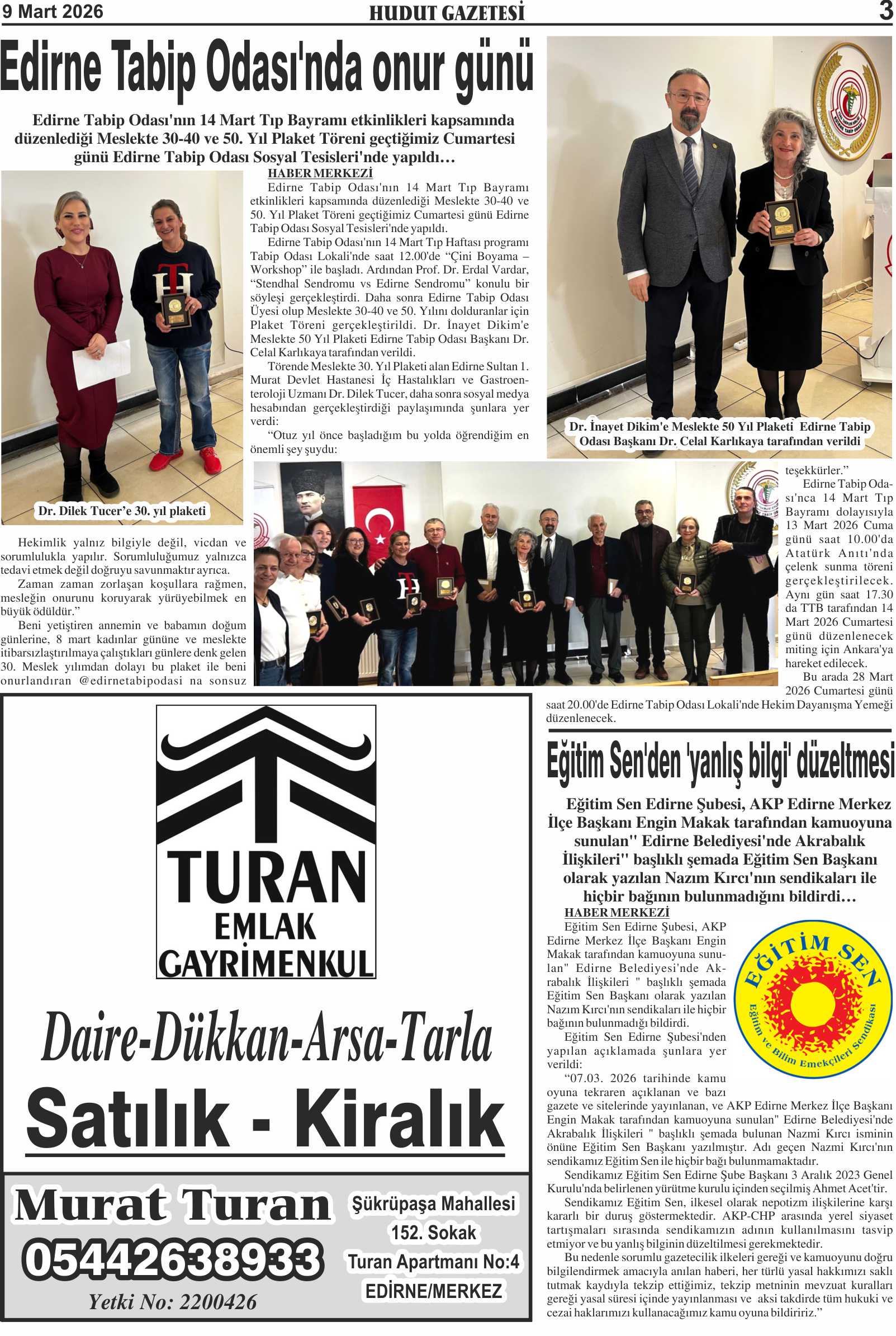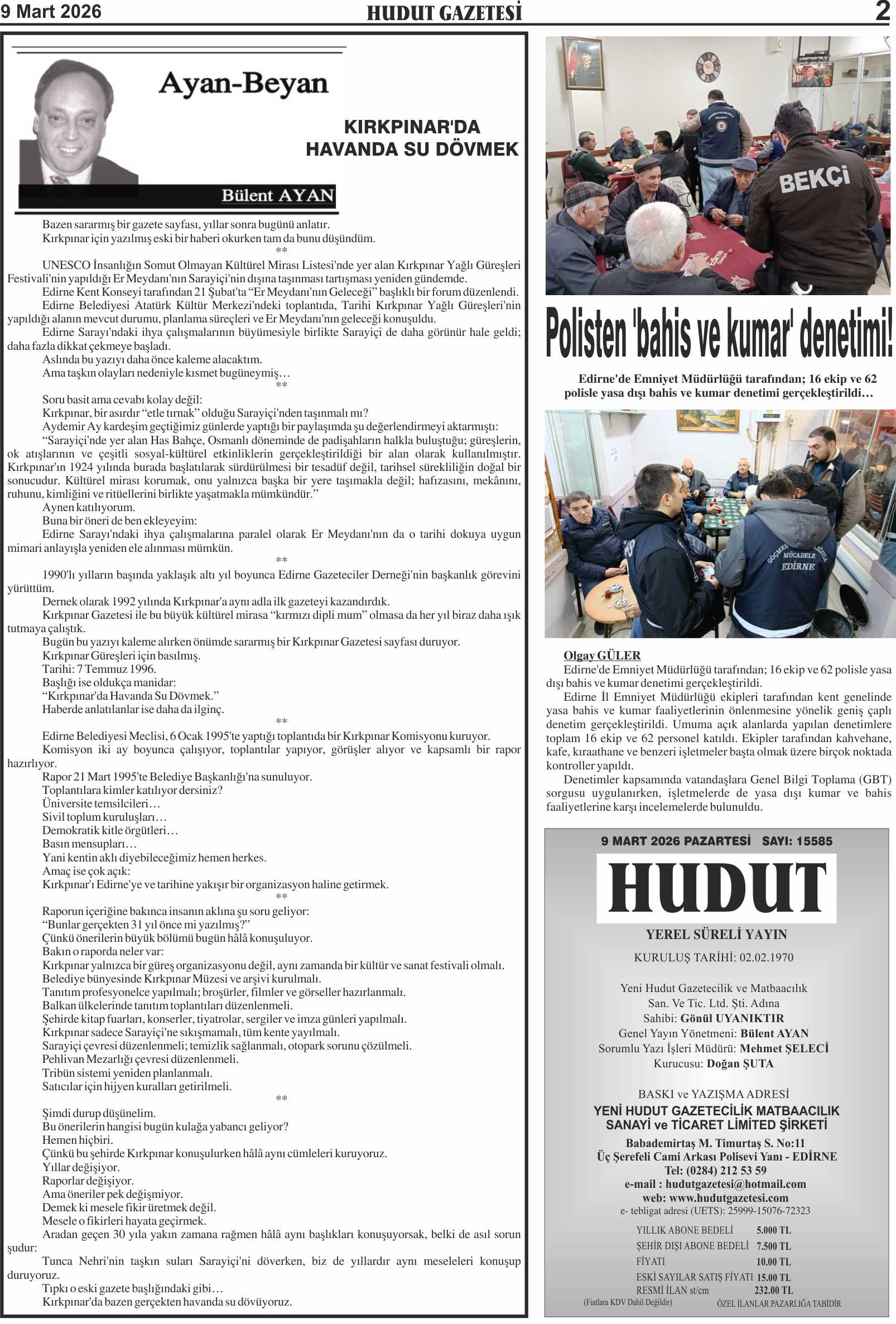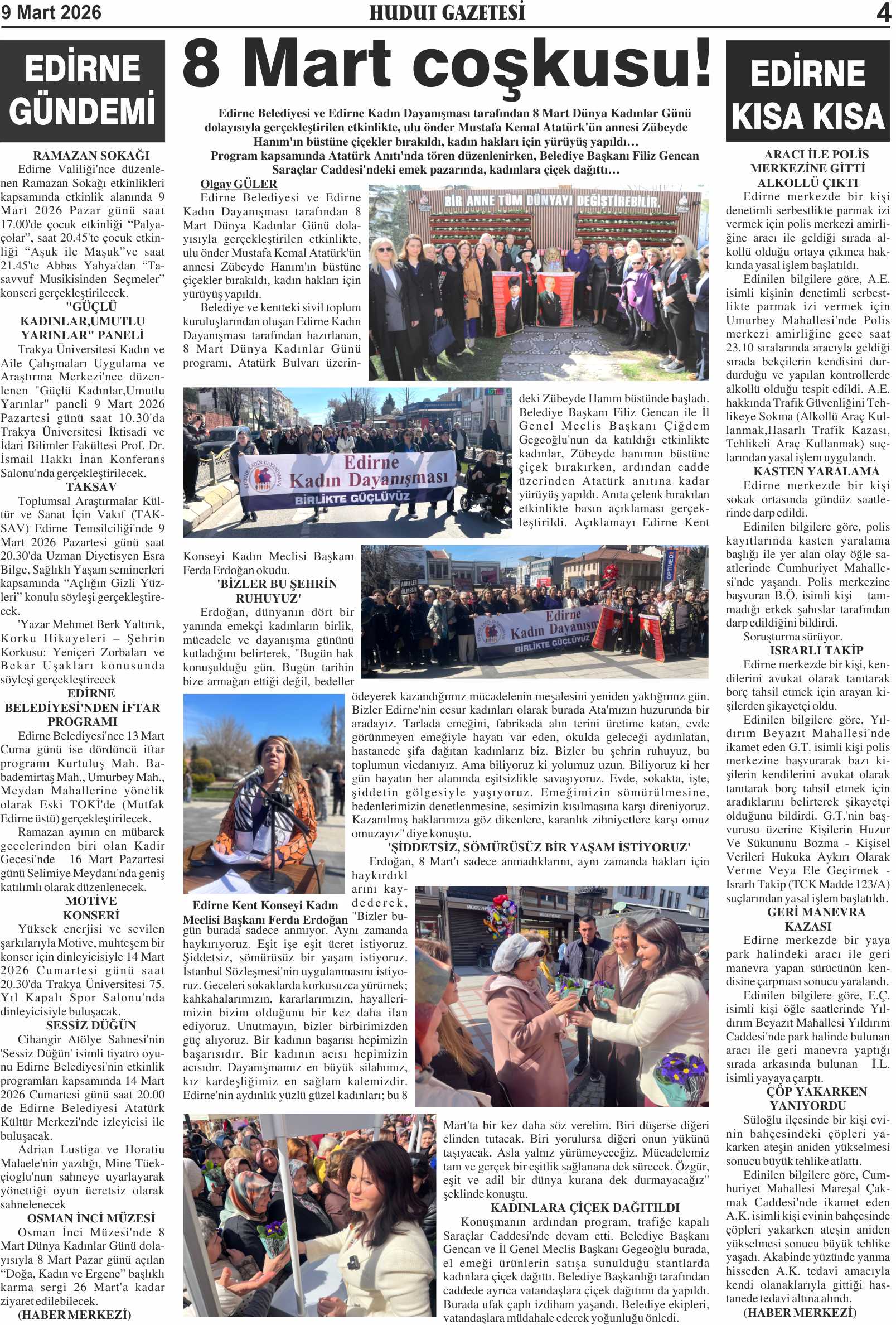 9 Mart 2026 Pazartesi Hudut Gazetesi