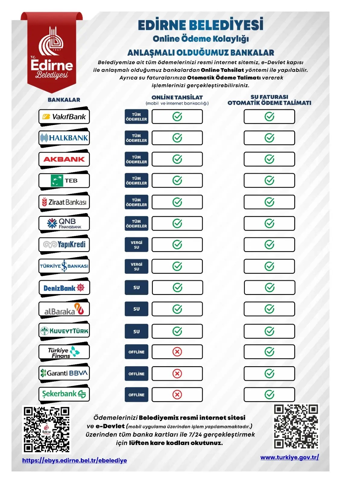 Bankaların yanı sıra, E-devlet kapısı ve Edirne Belediyesi resmi internet sitesi üzerinden de tüm ödeme işlemleri kolaylıkla gerçekleştirilebilir. “Kolay Ödeme, Hızlı Hizmet” sloganıyla hareket eden belediyemiz, vatandaşlarımızın işlemlerini kolaylaştırmak için çalışmaya devam ediyor