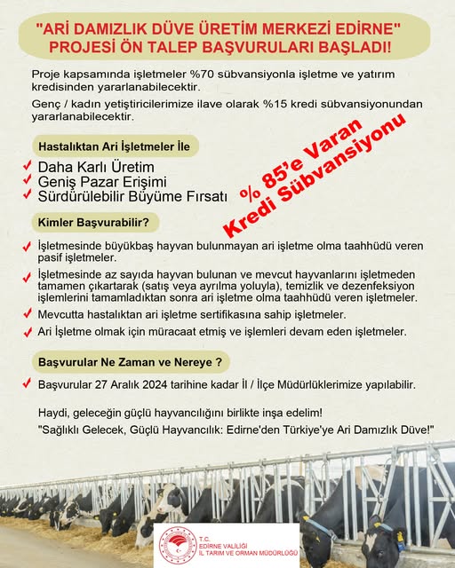 “Ari Damızlık Düve Üretim Merkezi Edirne” Projesi için ön talep başvuruları başladı. Proje hakkında bilgi almak ve ön talep oluşturmak için 11.12.2024-27.12.2024 tarihleri arasında İl/İlçe Tarım Müdürlük-lerine müracaat edilebilecek. Projede % 85’e varan kredi sübvansiyonu sağlanabilecek.