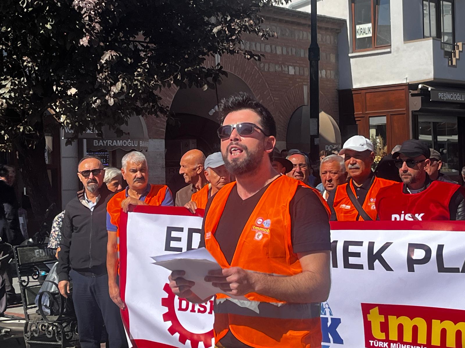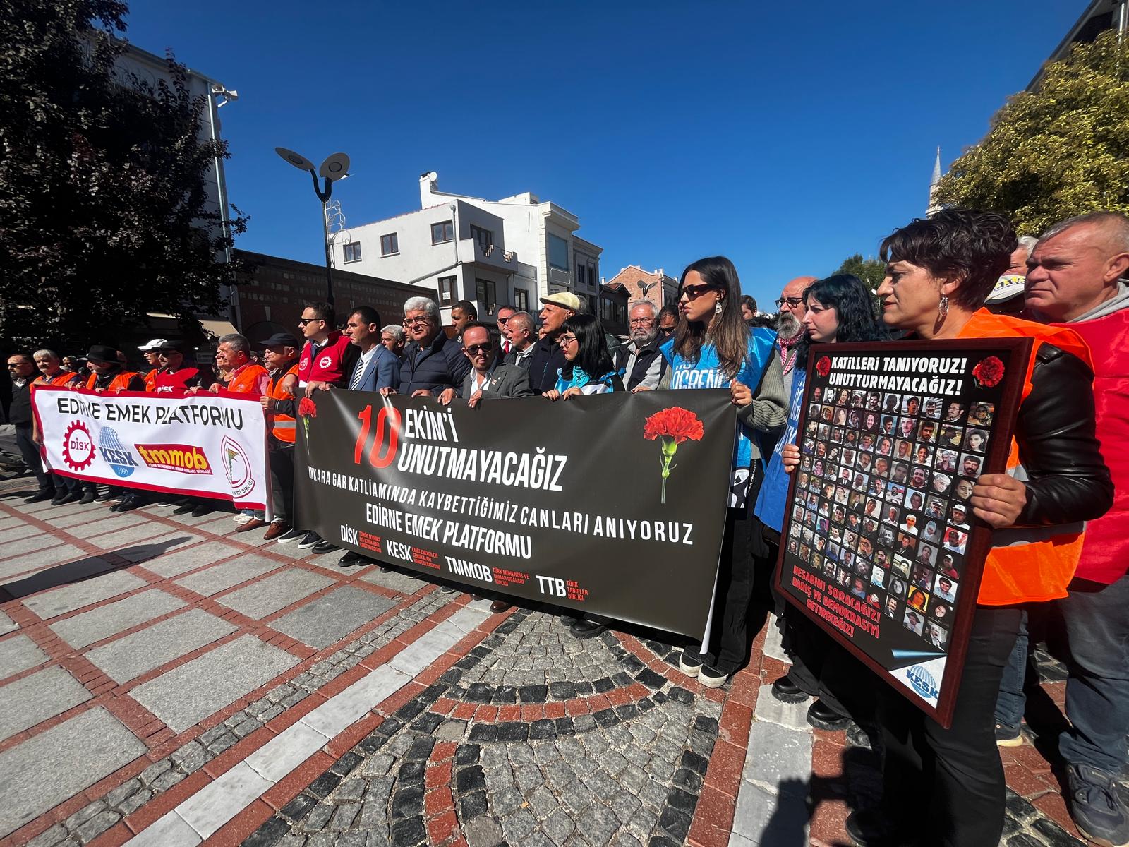 Ankara Garı önünde 10 Ekim 2015’te, 109 kişinin ölümüyle sonuçlanan saldırının 10’uncu yıldönümünde, Edirne Emek Platformu tarafından basın açıklaması gerçekleştirildi… Edirne Tabip Odası Yönetim Kurulu üyesi Utku Okçu’nun okuduğu basın açıklamasında, “Emek, demokrasi ve barış özlemimiz yerine gelinceye kadar, bedeli ne olursa olsun mücadelemiz devam edecektir. Gerçek katiller ortaya çıkarılıncaya ve gerçek adalet yerini buluncaya kadar ant olsun ki durup dinlenmeyeceğiz, geri çekilmeyeceğiz, yılmayacağız. Affetmeyeceğiz, unutmayacağız, unutturmayacağız” denildi…