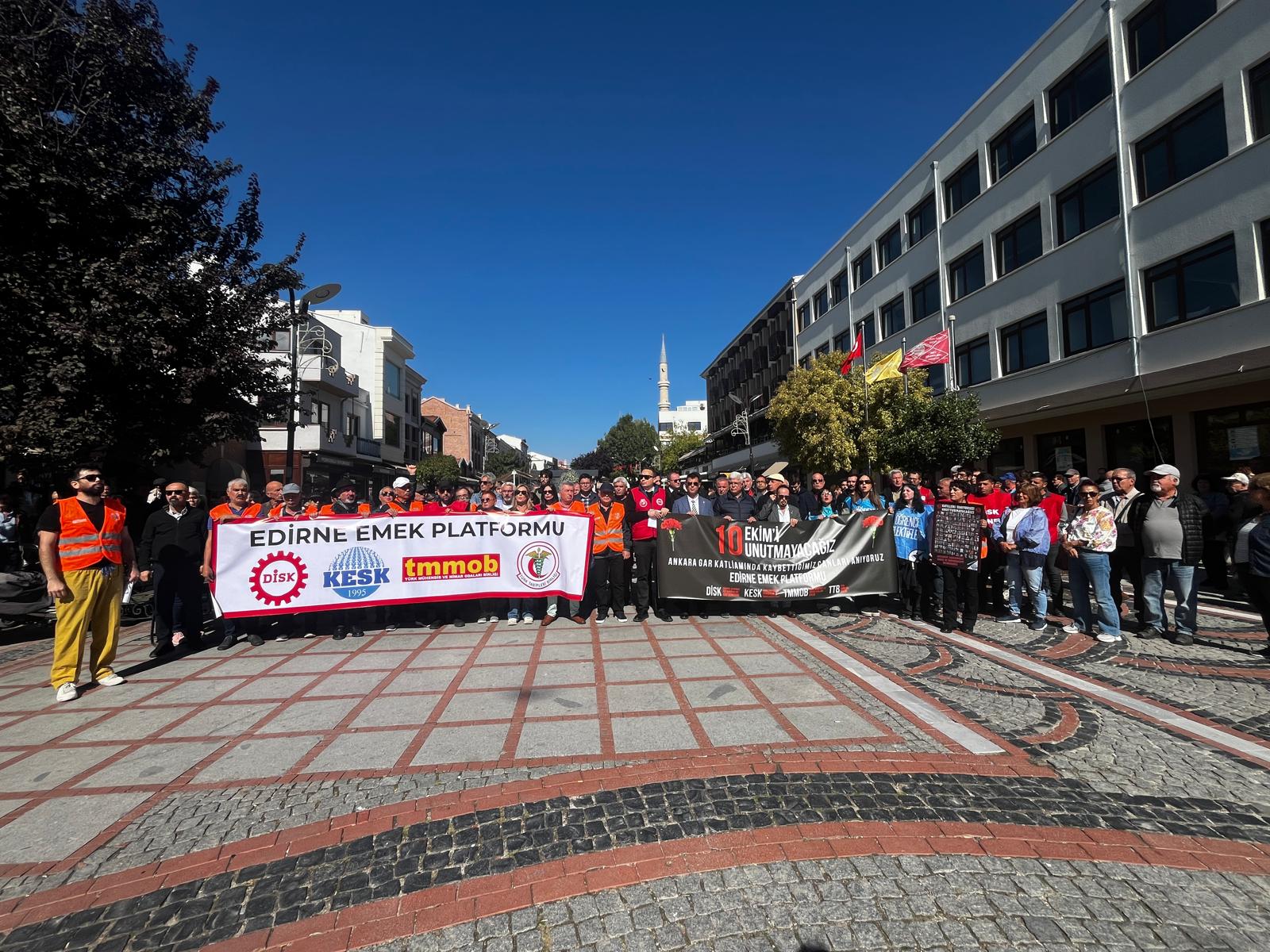 Ankara Garı önünde 10 yıl önce, Türkiye’nin içinden geçtiği şiddet ve çatışma ortamının sona erdirilmesi için DİSK, KESK, TMMOB ve TTB’nin çağrısı üzerine; “Savaşa inat, barış hemen şimdi” sloganıyla Emek, Barış ve Demokrasi Mitingi düzenlendi. Miting alanına düzenlenen saldırıda 109 kişi yaşamını yitirirken 500’ü aşkın kişi yaralandı. Saldırının 10’uncu yıldönümünde Edirne Emek Platformu tarafından Saraçlar Caddesi’nde basın açıklaması gerçekleştirildi. Etkinlikte basın açıklamasını; Edirne Tabip Odası Yönetim Kurulu Üyesi Utku Okçu okudu.