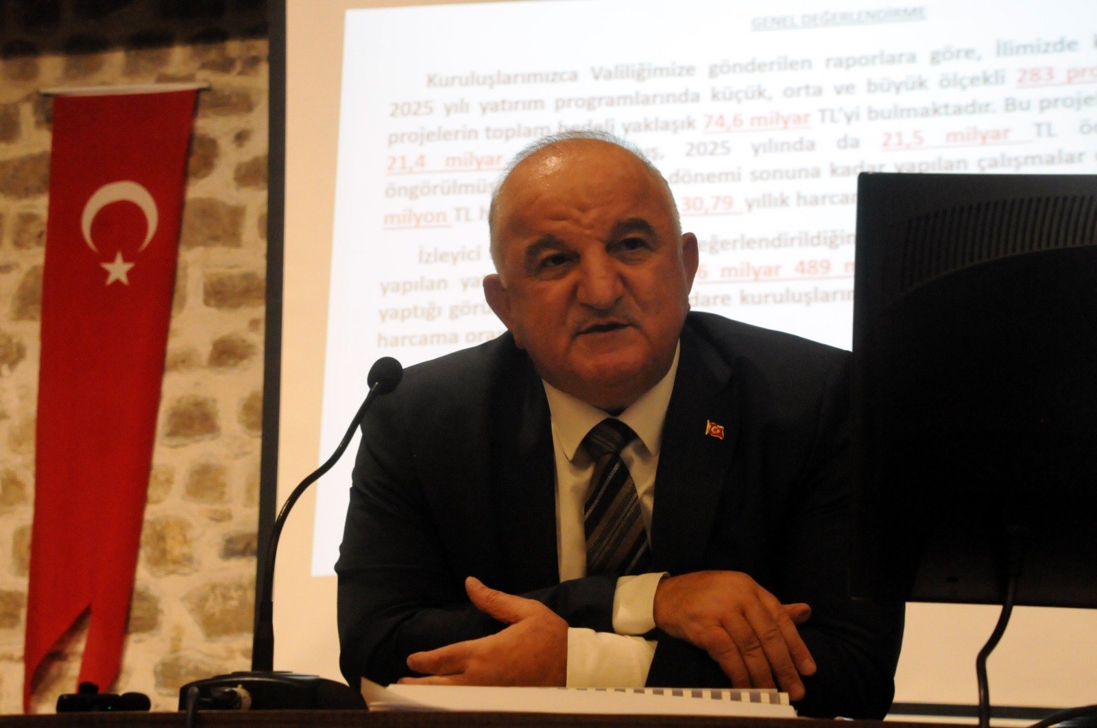 Kurum ve kuruluş müdürlerinin devam eden projeler hakkında bilgi verdiği toplantıda konuşan Vali Yardımcısı Sarıbaş, kentte kamu kuruluşlarının 2025 yılı yatırım programlarında küçük, orta ve büyük ölçekli 283 proje yer aldığını söyleyerek, “Bu projelerin toplam bedeli yaklaşık 74,6 milyar TL’yi bulmaktadır. Bu projeler için önceki yıllarda 21,4 milyar TL harcanmış, 2025 yılında da 21,5 milyar TL ödenek kullandırılması öngörülmüştür. İkinci yatırım dönemi sonuna kadar yapılan çalışmalar dahilinde 6 milyar 632 milyon TL harcama yapılarak % 30,79 yıllık harcama oranı sağlanmıştır” dedi.