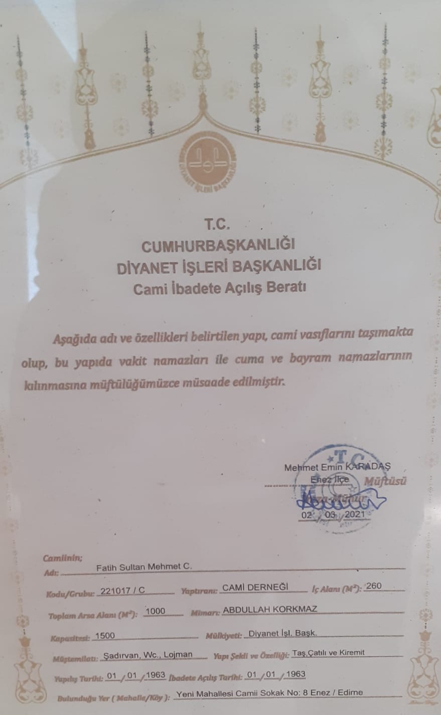 Edirne’nin Enez ilçesinde 1963 yılında Cami Derneği’nce yapı ustası Abdullah Korkmaz tarafından inşa ettirilen, yapı şekli ve özelliği “taş, çatılı ve kiremit” olarak belirtilen Fatih Sultan Mehmet Camisi, zamanla dış ve iç cephesinde oluşan çatlaklarla kullanılamaz hale geldi. Bu nedenle yaklaşık 2 yıl önce ibadete kapatılan caminin restorasyona alınması için vatandaşlar harekete geçti. Restorasyon başvurusunda bulunan vatandaşlar, Kültür Varlıkları Bölge Koruma Kurulu’nun ‘tescilli yapı’ uyarısı üzerine restorasyon işlemlerini başlatamadı.