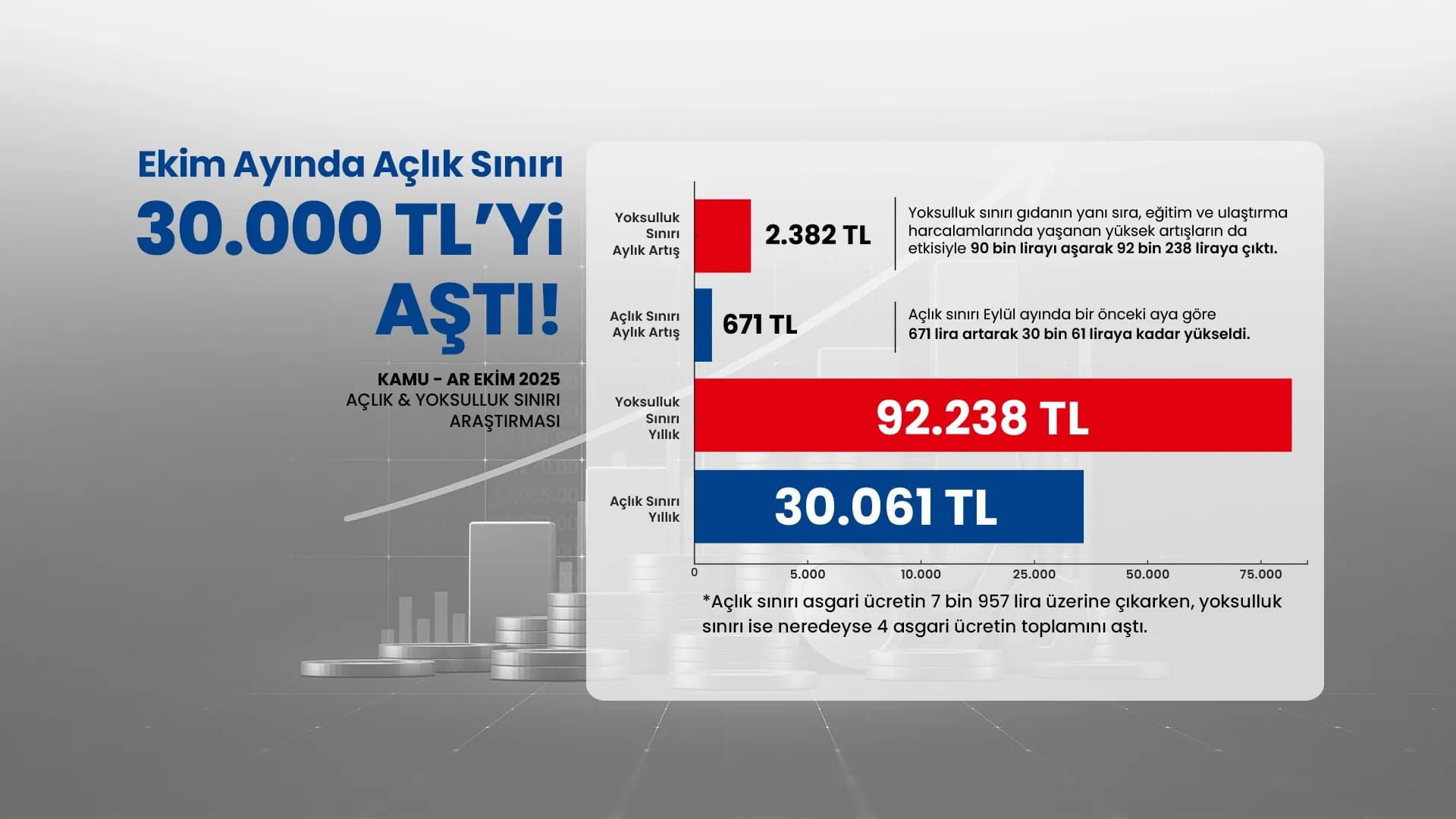 Birleşik Kamu-İş Konfederasyonu açlık sınırının önceki aya göre 671 lira artışla ekim ayında 30 bin liranın üzerine, gıda dışındaki ihtiyaçlar için yapılması gereken harcamanın 1.711 liralık yükselişle 62 bin 177 liraya çıktığını, her ikisinin toplamından oluşan yoksulluk sınırının ise önceki aya göre 2 bin 382 lira artarak 92 bin 238 lira olduğunu bildirdi.