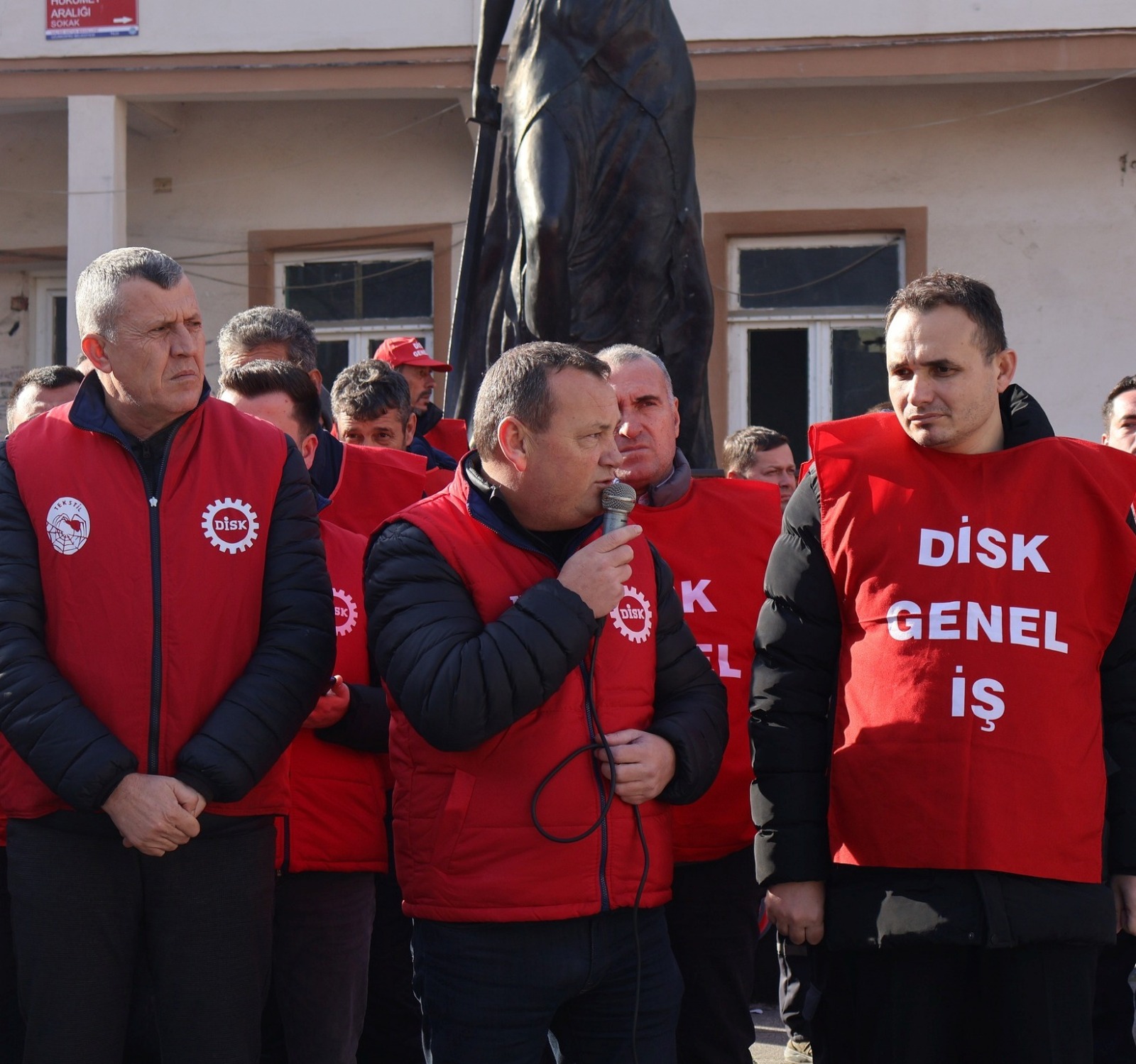 DİSK Trakya Bölge Temsilcisi Makasçı, ülkede emeğiyle geçinen milyonlar için her yeni günün, bir önceki günden daha zor başladığına dikkat çekerek, “Pazarda, markette, kirada yaşadığımız gerçek enflasyon, açıklanan rakamların çok üzerindedir. Sanayide, belediyelerde, tarlada, fabrikada çalışan emekçiler bu gerçeği iliklerine kadar yaşıyor. Bugün ülkemizin en büyük sorunu bölüşüm sorunu. Bu düzenin bütün çarkları zengini daha zengin, yoksulu daha yoksul yapmak için dönüyor. Bir avuç sermaye büyürken, milyonlarca emekçi ay sonunu getiremez hale getiriliyor. İşte biz buna itiraz ediyoruz.