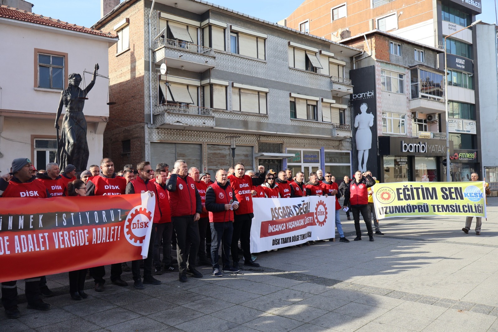 Devrimci İşçi Sendikaları Konfederasyonu (DİSK) Trakya Bölge Temsilciliği, “İnsanca ücret, vergide adalet” talebiyle Uzunköprü Adalet Meydanı’nda düzenlediği basın açıklamasında “İnsanca ücret, vergide adalet” çağrısında bulundu. DİSK Trakya Bölge Temsilcisi Caner Makasçı, hayat pahalılığı karşısında ücretlerin eridiğini, alım gücünün her gün daha da düştüğünü, ücret artışlarının TÜİK’in açıkladığı ama kimsenin inanmadığı resmi enflasyonun bile altında kaldığını belirterek, “Asgari ücret düşükse, ülkede hiçbir ücret güvende değildir” dedi.