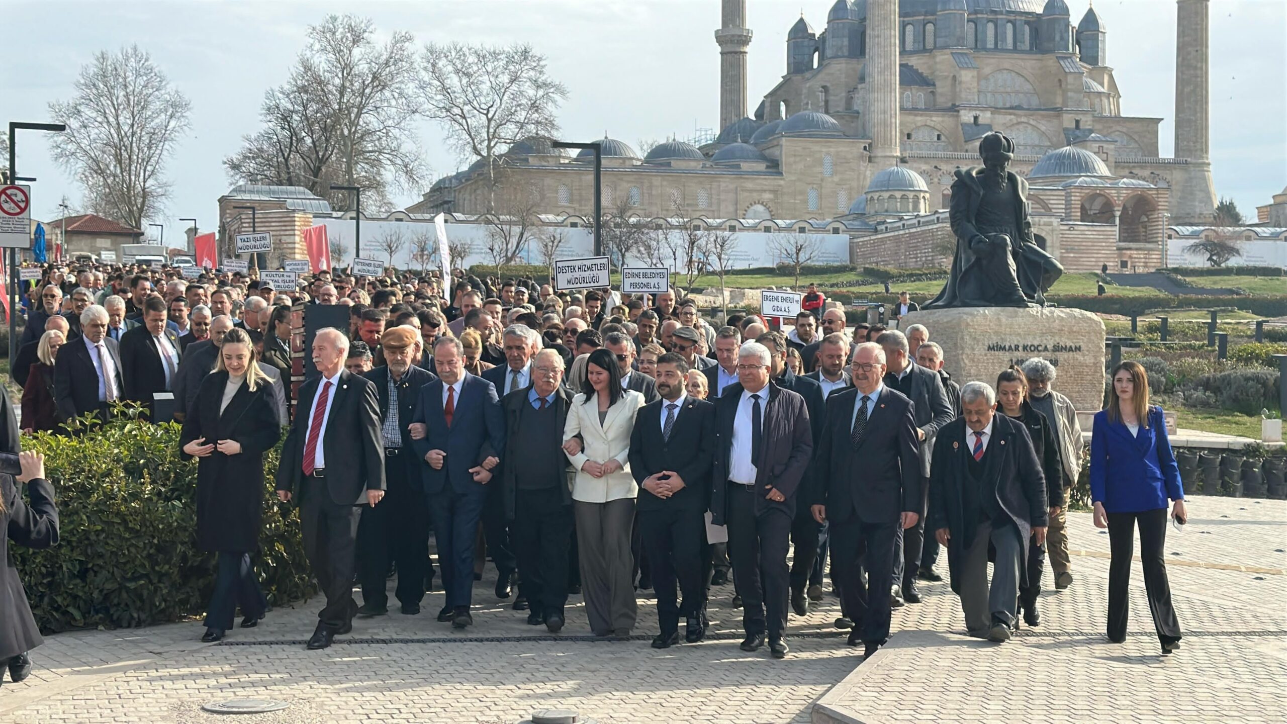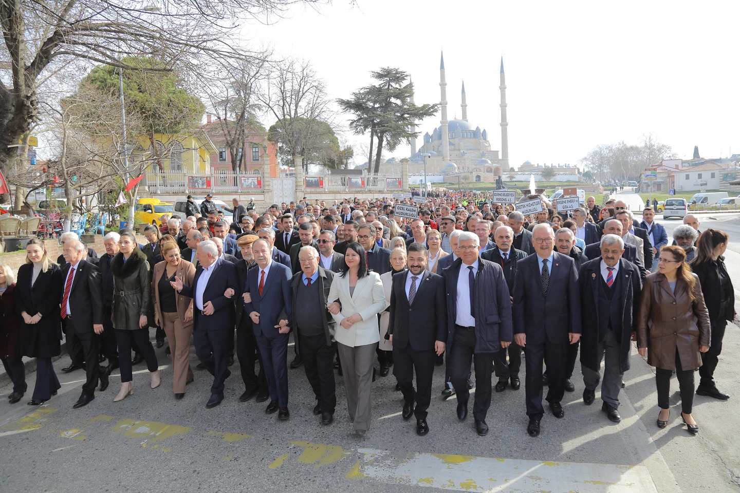 Akın, “Edirne Belediyesi’nin ilk kadın belediye başkanı olarak bu tarihi yaşatmanın, Edirne’ye hizmet etmenin ve geleceğe daha güçlü bir şehir bırakmanın sorumluluğunu omuzlarımda hissediyorum. Bu an, yalnızca benim için değil, Edirne’nin tarihinde yeni bir sayfanın açıldığı, kadınların her alanda var olabileceğini bir kez daha gösteren bir dönüm noktasıdır. Bu özel günü taçlandırmak için, biraz önce kıymetli çalışma arkadaşlarımla ve halkımızın da katılımıyla belediye binamızdan Atatürk Anıtı’na coşkulu bir yürüyüş gerçekleştirdik. Bu yürüyüş, Edirne’nin geçmişten geleceğe uzanan köklü belediyecilik anlayışının, birlik ve beraberliğimizin güçlü bir simgesidir. İşte bizler, bu aziz toprakların evlatları olarak, Edirne’nin görkemli tarihine yakışır bir şekilde çalışmaya, üretmeye ve bu güzel şehri daha da ileriye taşımaya ant içtik. Edirne için, halkımız için, Atatürk’ün mirasına sahip çıkmak için yürüdük” dedi.