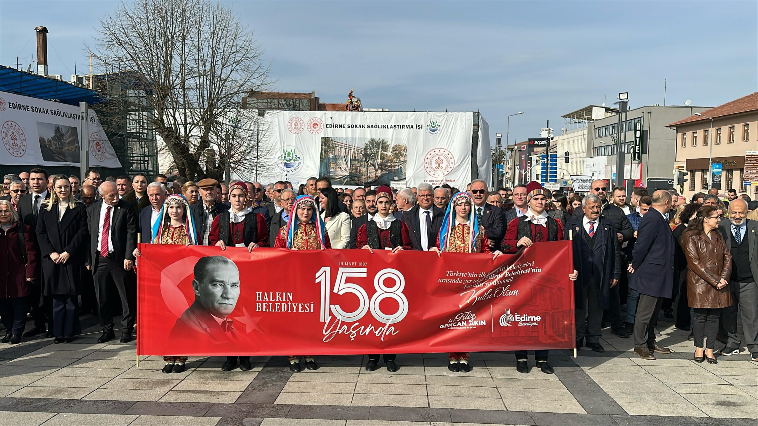 Türkiye’nin ilk kurulan belediyeleri arasında yer alan Edirne Belediyesi’nin kuruluşunun 158’inci yılı dolayısıyla, tarihi başkanlık binası önünden başlayan kortej yürüyüşü ve Atatürk Anıtı’nda törenle düzenlendi.